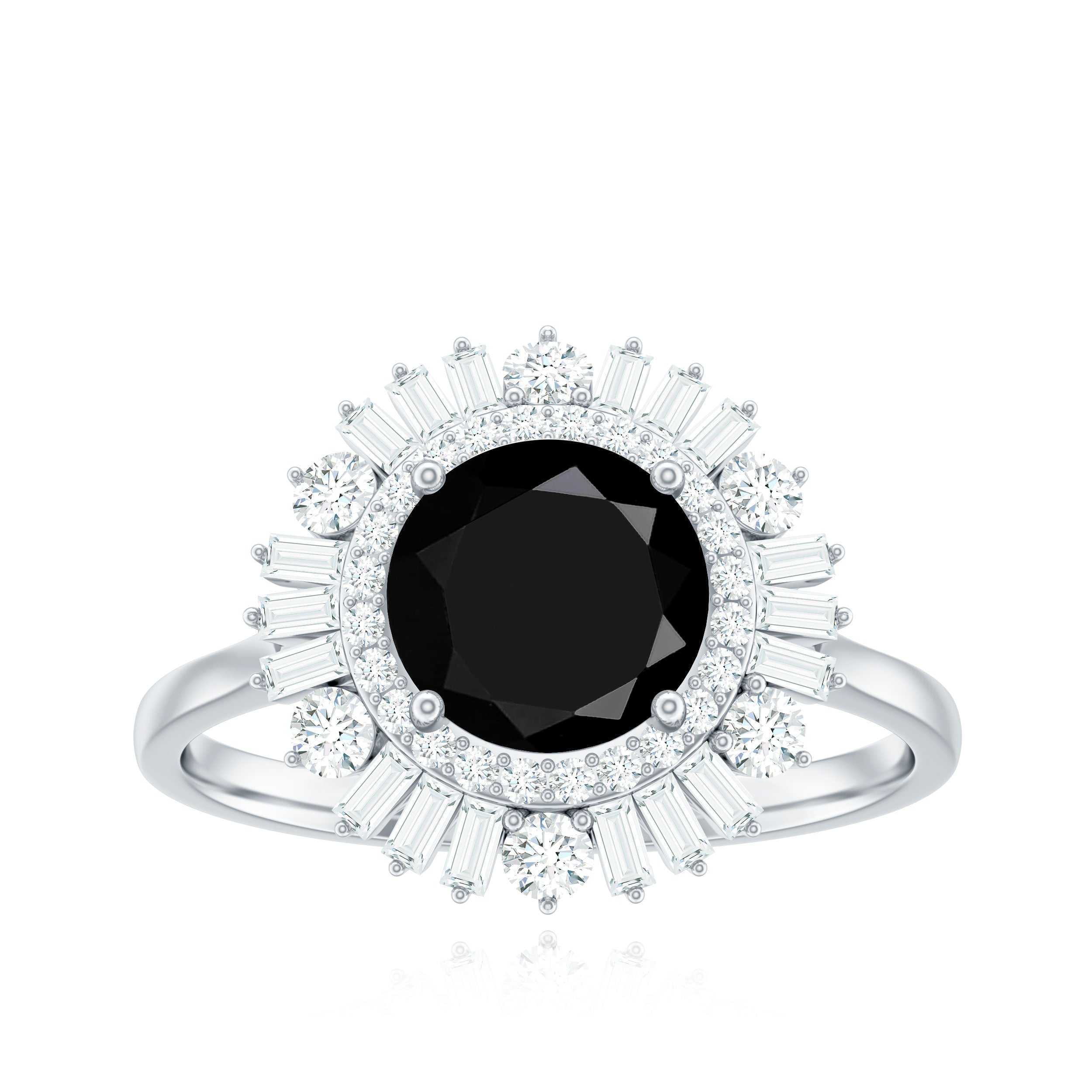 Style yourself with this exquisite cocktail ring featuring a round black spinel center stone set in prong setting. The bold black hue of the spinel is accentuated by the double halo of dazzling baguette and round shape moissanite gemstones that encircle it, creating a mesmerizing effect. Whether worn as an accessory for a special occasion or as an everyday accessory, this ring is a must-have for any fashion-forward individual looking to add some drama to their jewelry collection.