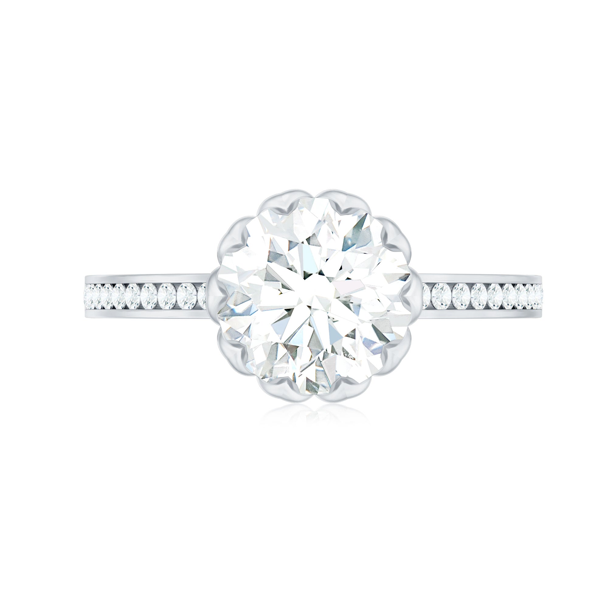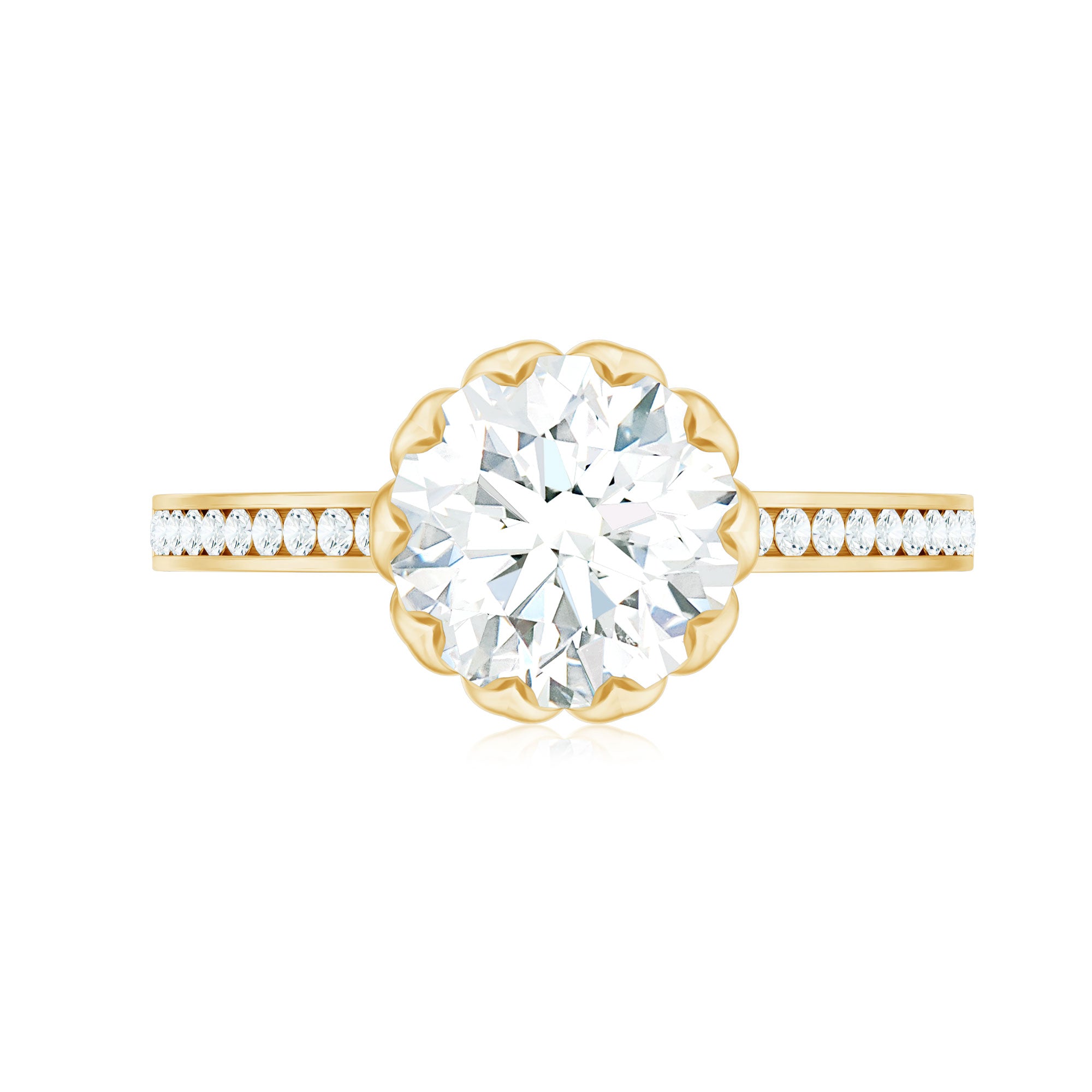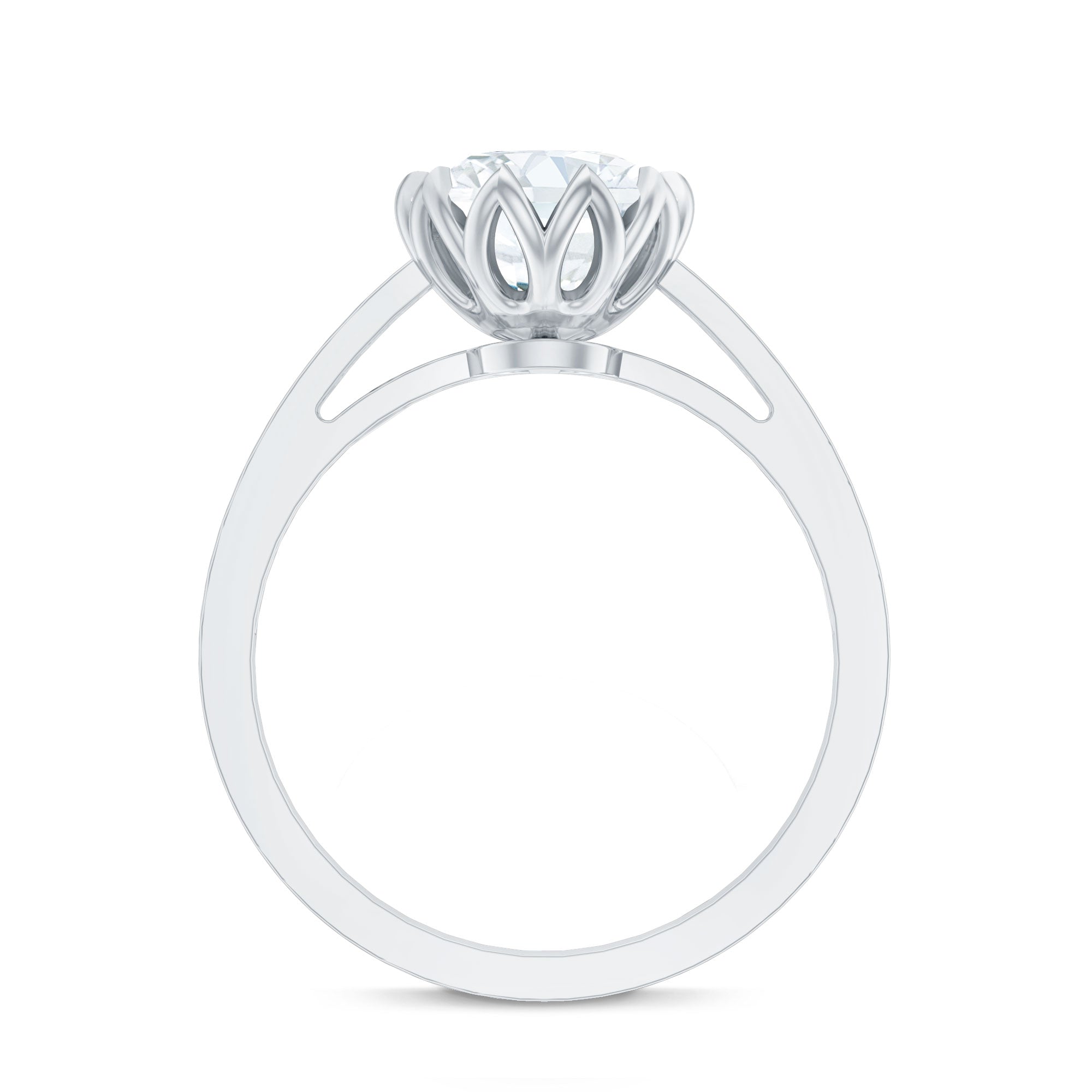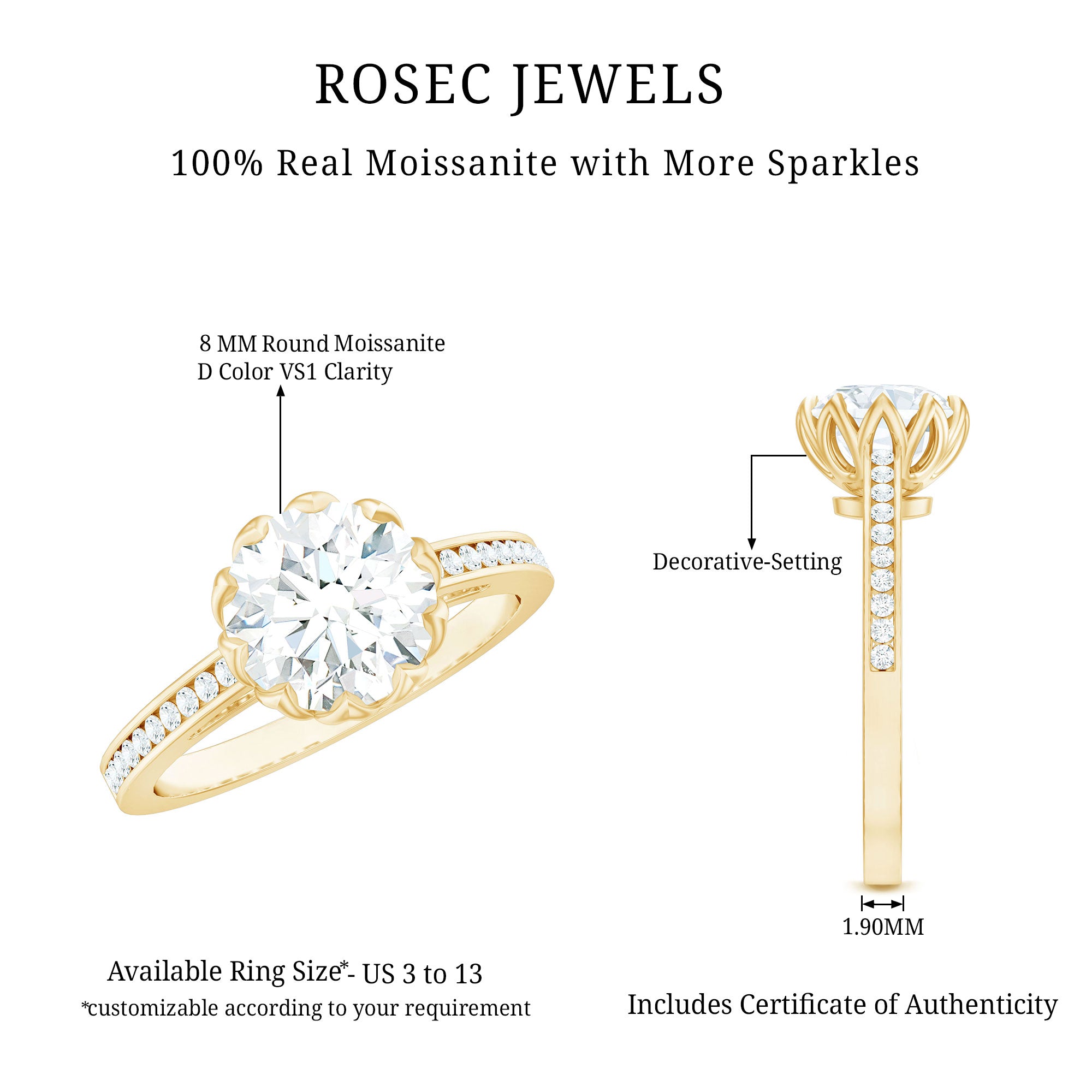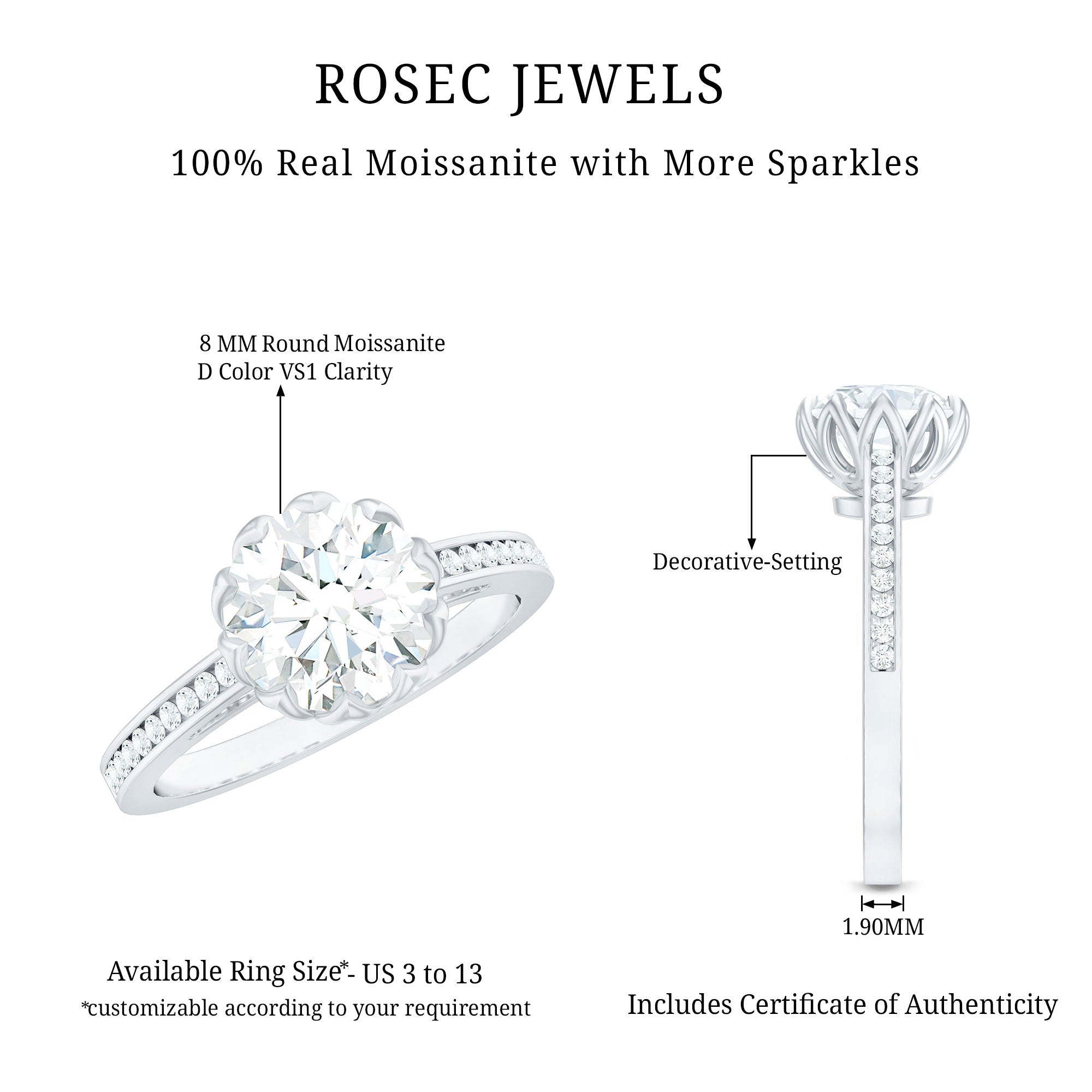 This beautiful Round Cut Moissanite Engagement Ring is inspired by the beauty and meaning of a blooming flower. At the center of the ring is a sparkling 8 MM round brilliant cut Moissanite that shines brightly with every movement. The stone is set in a designer lotus basket setting, giving the Solitaire Engagement Ring a soft and graceful floral look. The lotus flower stands for purity, growth, and new beginnings, making this 2 Carat Moissanite Ring a perfect symbol of true love and a fresh chapter together. The simple band is made even more beautiful with small channel set Moissanite side stones, adding extra sparkle without taking attention away from the center stone. This Lotus Engagement Ring is made to be worn every day. It is comfortable, strong, and stylish, great for someone who wants a mix of beauty and meaning in their engagement ring. Available in a range of ring sizes, it also comes in a lovely box, ready for gifting or keeping safe for your big moment. This flower inspired ring is perfect for someone who loves meaningful, nature-inspired designs with timeless sparkle.