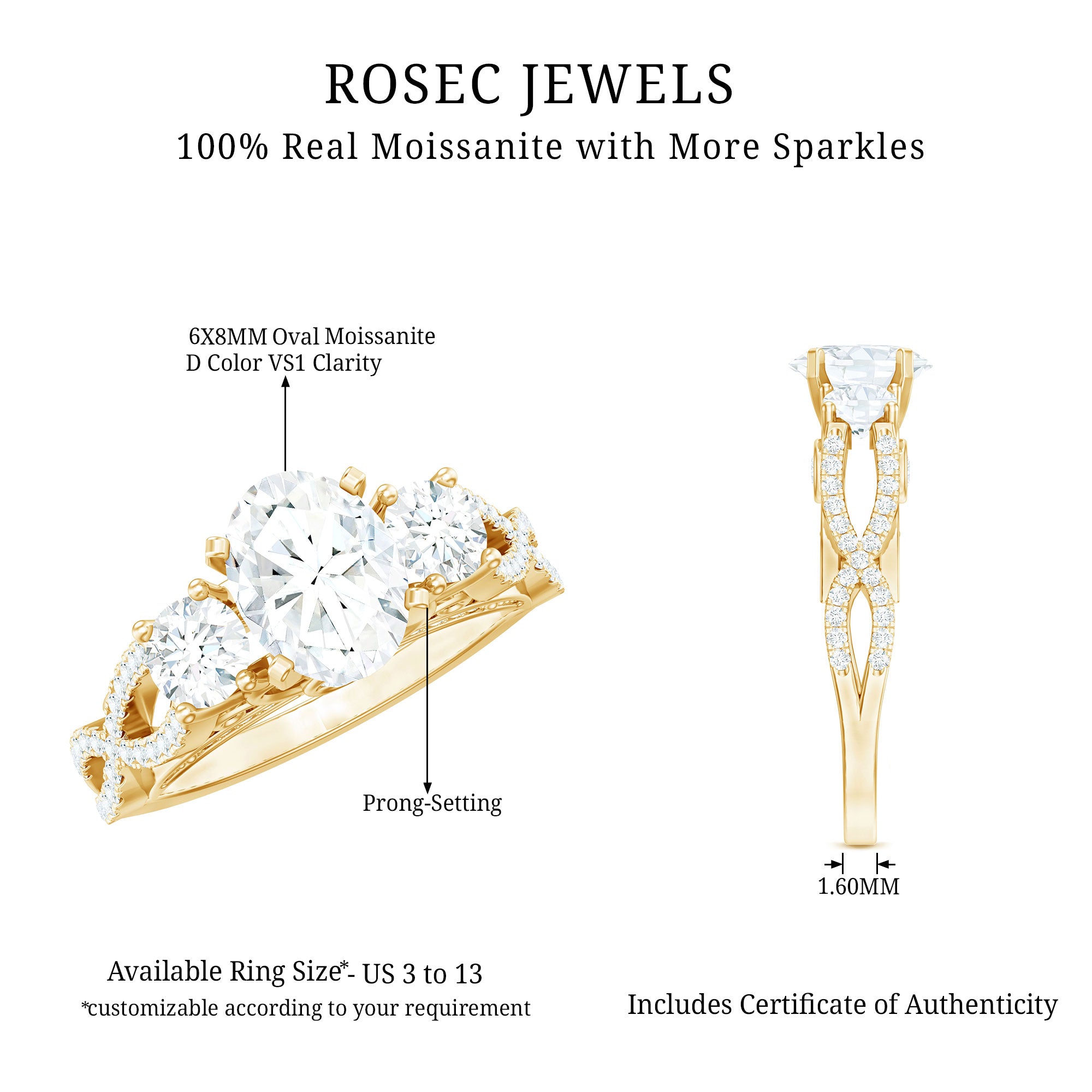 Win her heart with this Moissanite Engagement Ring, studded with a 6X8 MM Oval-Cut Moissanite in the center, adorned by two Round Moissanite stones in Prong Setting. This 3 stone ring has a unique Infinity-Pattern shank embedded with petite Moissanite stones which gives it a timeless look. This Vintage Engagement Ring is one of a kind as it holds the classic shine of D-VS1 quality Moissanite, making it the perfect for her. This Past Present Future Ring will ensure the timeless strength and bond between you and your partner.