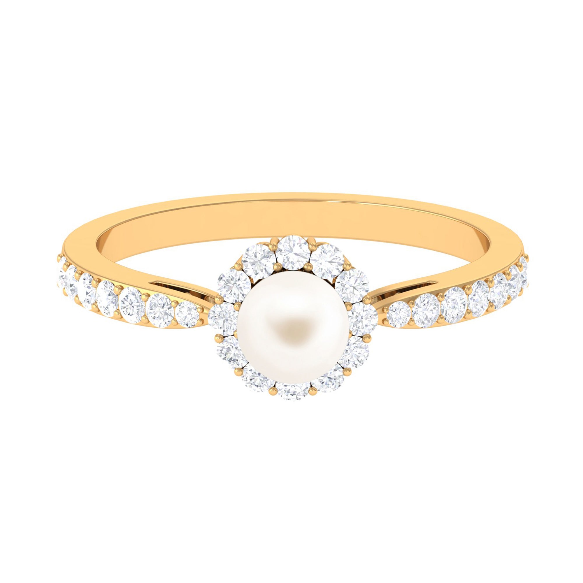 Diamond Halo Classic Freshwater Pearl Ring is an elegant piece of fine jewelry. Freshwater Pearl exhibits AAA Quality and possess subtle color. Semi Precious June Birthstone summons faith and innocence. It is Natural and Certified, helps in enhancing personal integrity and grow sincerity of the wearer. The extremely durable nature and luster makes it a captivating and desirable gem. Diamond- HI-SI Quality exhibited by Brilliant Cut Diamond give justice to its incredible value. Diamond summons beauty, attractiveness and unbreakable love. It is Certified and helps in bringing success and luxury to the wearer. Its Durability and Luster is enhanced by Lab Created Treatment, to further make it a captivating and desirable gem.