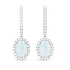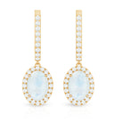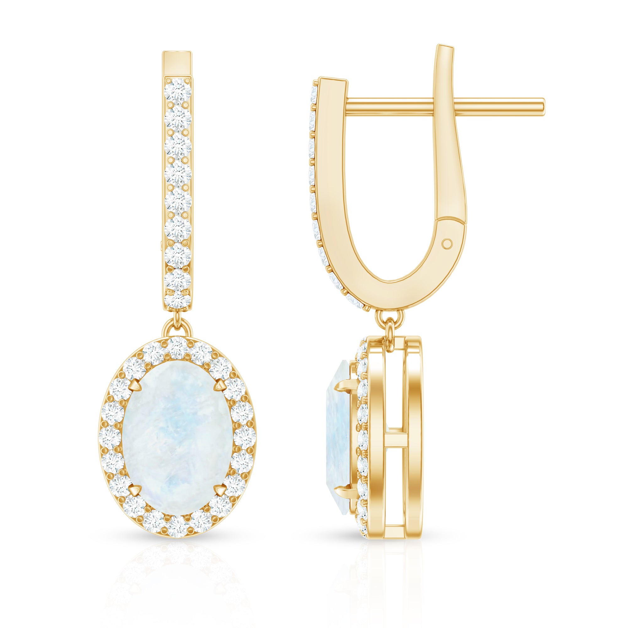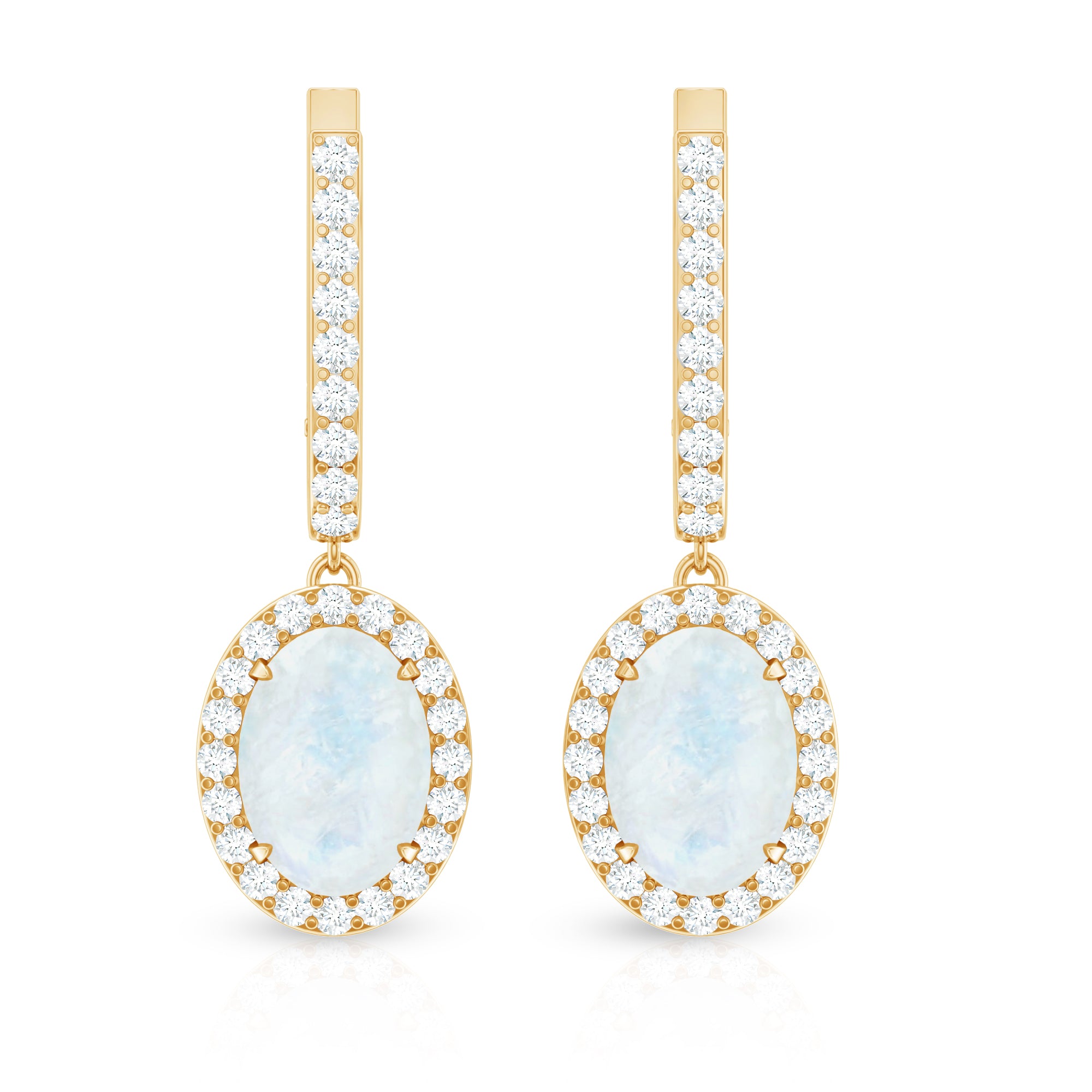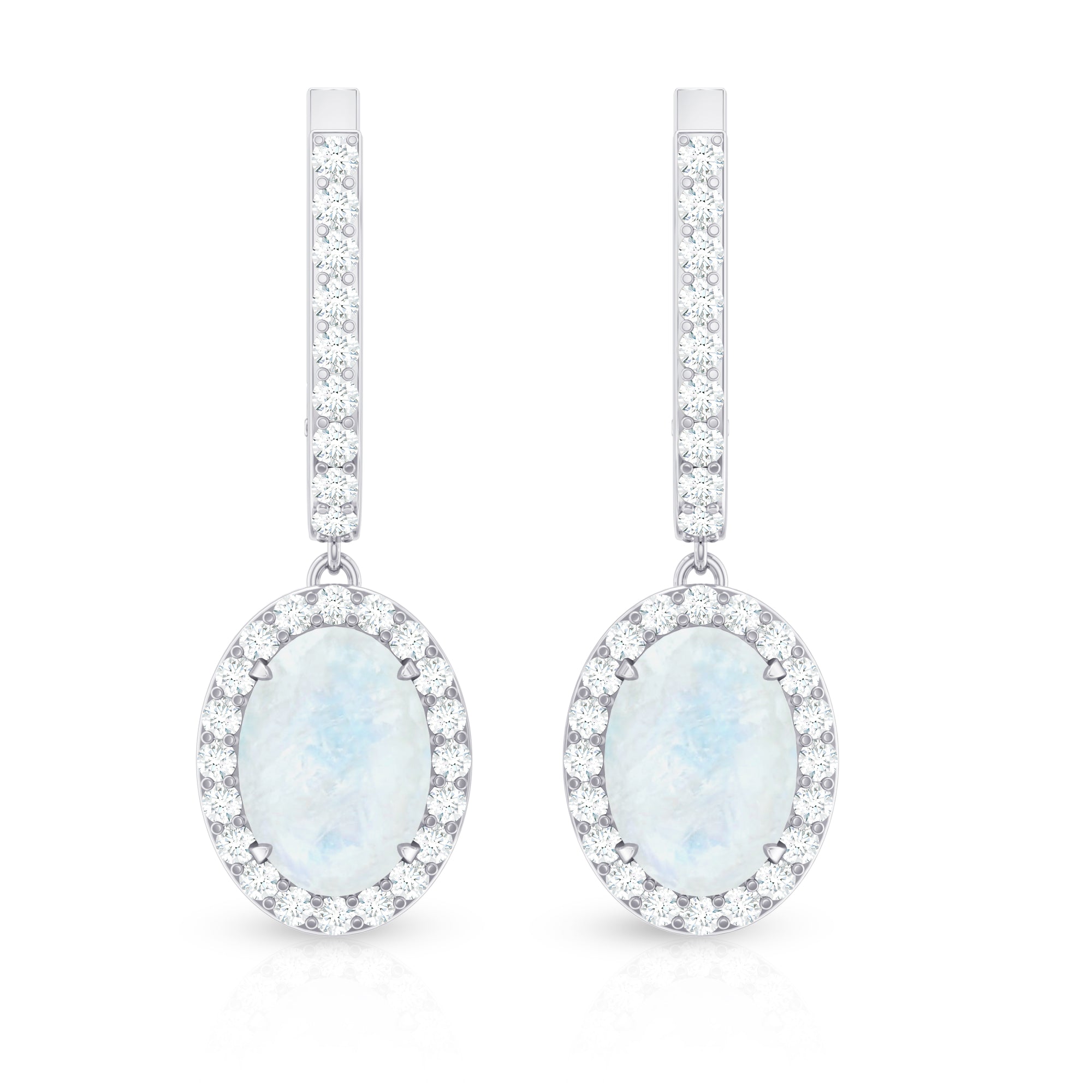 Celebrate this mothers day with stunning and beautiful Drop Hoop Earrings for your loving mother. These Earrings adorned with Oval Cut Moonstone in Claw Setting with Diamond Halo, crafted in Solid Gold Metal.