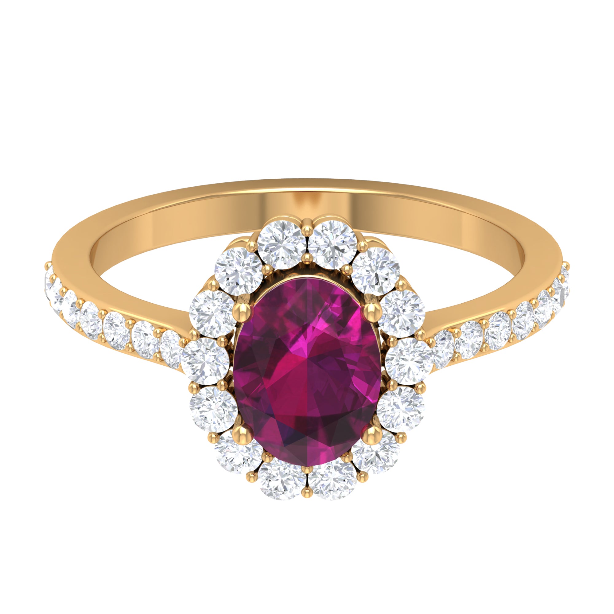 Unique Engagement Ring is the beautiful accessory engraved with Oval Cut Rhodolite as Solitaire and Round Shape Moissanite is set in Halo and Side Stone Setting. This lovely Engagement Ring makes a statement piece for women is composed of Solid Gold.