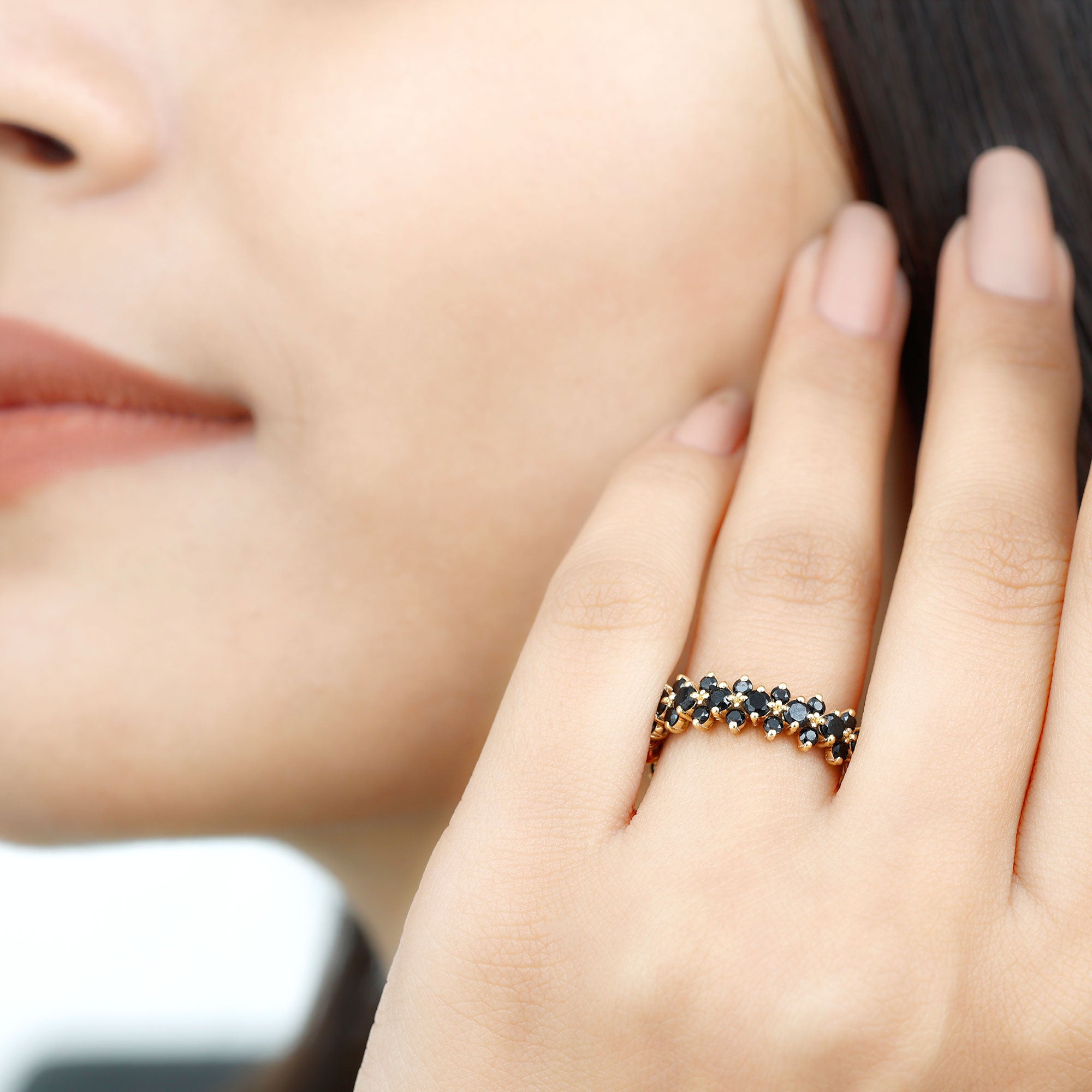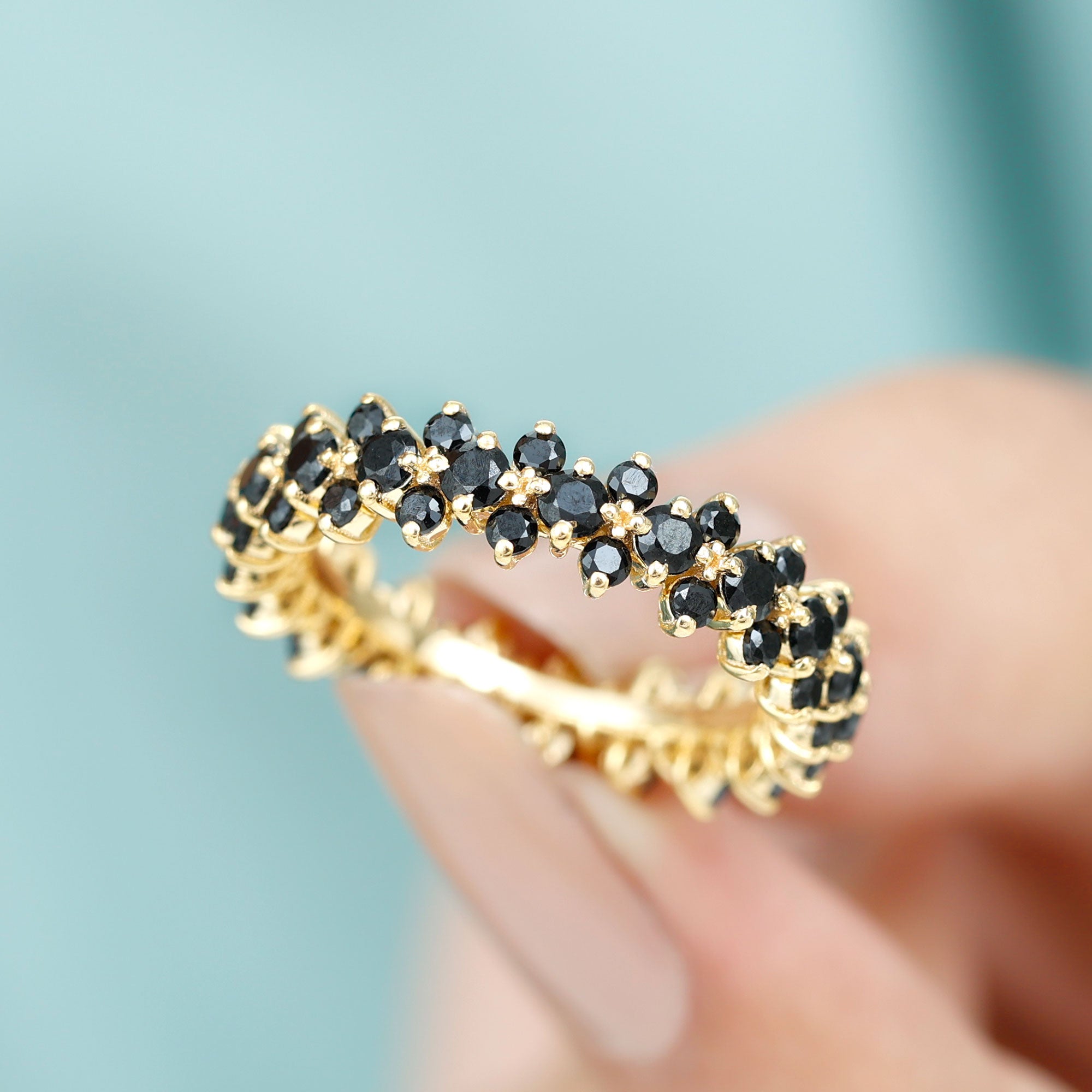 Express your love with this beautiful Full Eternity Ring. Adorned with round-cut black spinel in a prong setting, this ring is crafted from solid gold for a luxurious appeal. It is the perfect present for the special woman in your life, beautifully embellished and unique.