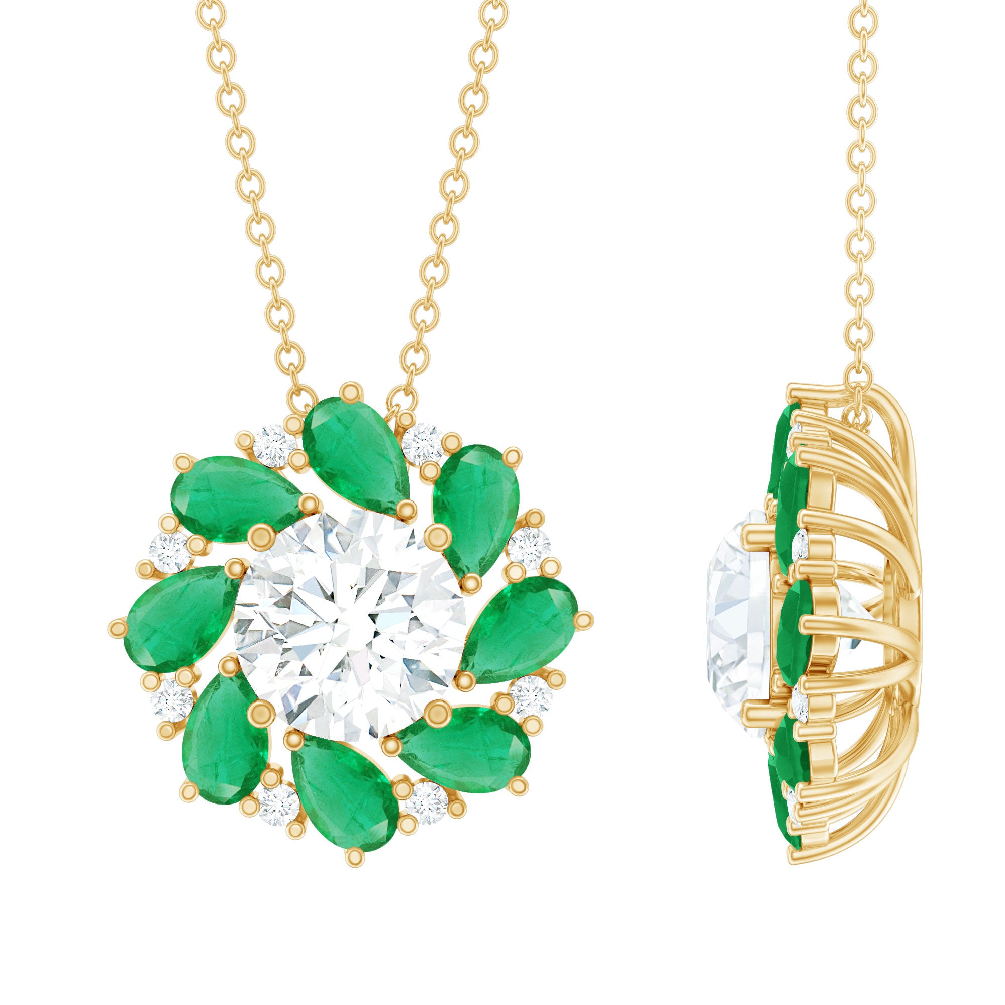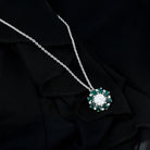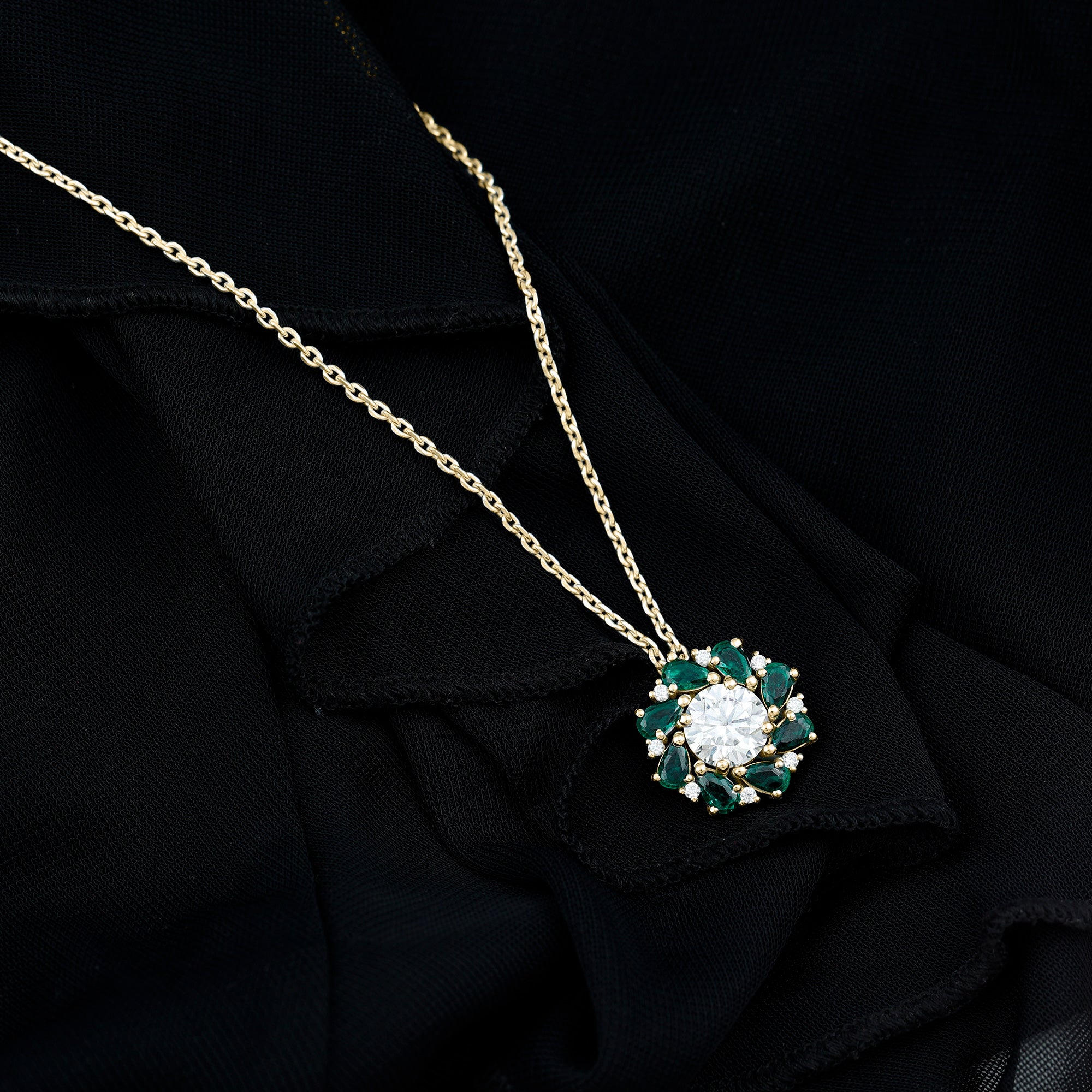 Elevate your style with the stunning Diamond Flower Necklace. At its heart, this Statement Pendant showcases an 8 MM round cut synthetic diamond of EF-VS quality, elegantly set in prongs. Surrounding it are beautifully tilted pear-shaped emeralds and smaller diamonds, forming a lovely floral leaf design. If you appreciate bold jewelry, this Diamond Pendant Necklace is an excellent choice for special events, whether its your wedding day or a cocktail party. Radiating elegance and luxury, this Diamond and Emerald Necklace is a timeless piece, making it a perfect gift for your mom, wife, or girlfriend.