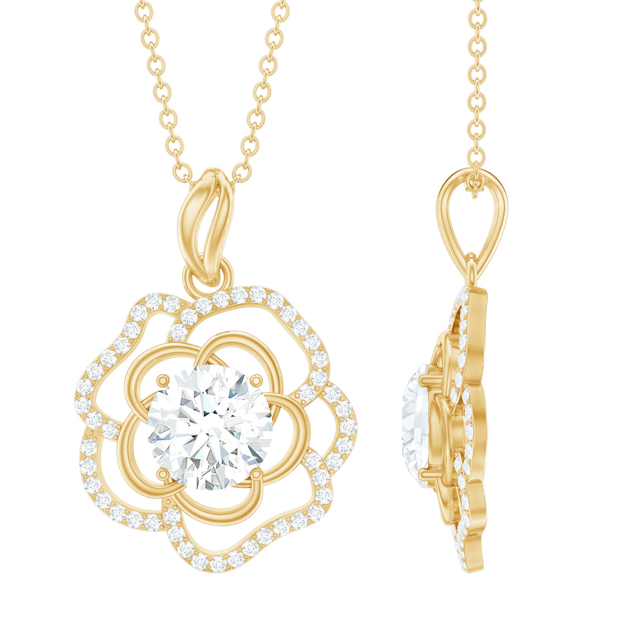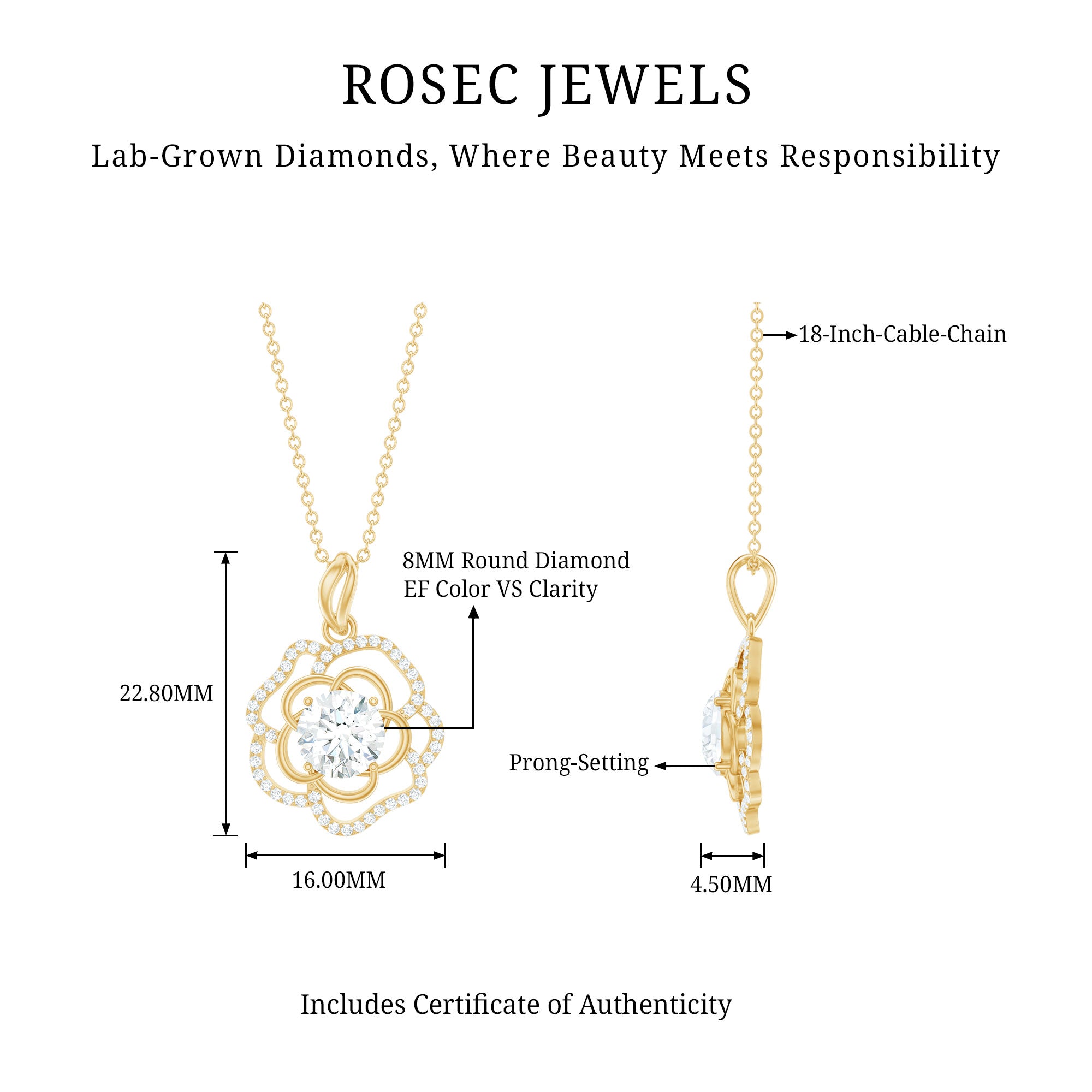 The irresistible beauty of a flower is perfectly expressed in our delicate Diamond Flower Necklace. It features an 8 MM round shaped lab grown diamond in the center set in prong setting, adding a classic touch to the design. Handcrafted by our master artisans unmistakable eye for detail, the center stone is encircled by floral petals decorated with smaller diamonds. The Diamond Pendant Necklace is suspended from a leaf-like curved bail, enhancing its elegance. To ensure its Quality, this Rose Necklace comes with a certificate of authenticity, providing peace of mind.