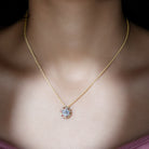 Make a statement without saying a word - this Diamond Flower Necklace is designed to turn heads and steal hearts. Handcrafted in high Quality precious metal, this Diamond Pendant Necklace features a meticulously crafted floral design, representing love, new beginnings, and femininity. The flower halo of red rubies and diamonds is carefully set to enhance its brilliance, creating a soft and radiant glow that complements the larger 8 MM round cut diamond (lab made) at the heart of the Bridal Pendant set in prong setting. This Nature Inspired Necklace is as versatile as it is stunning, perfect for casual and formal occasions.