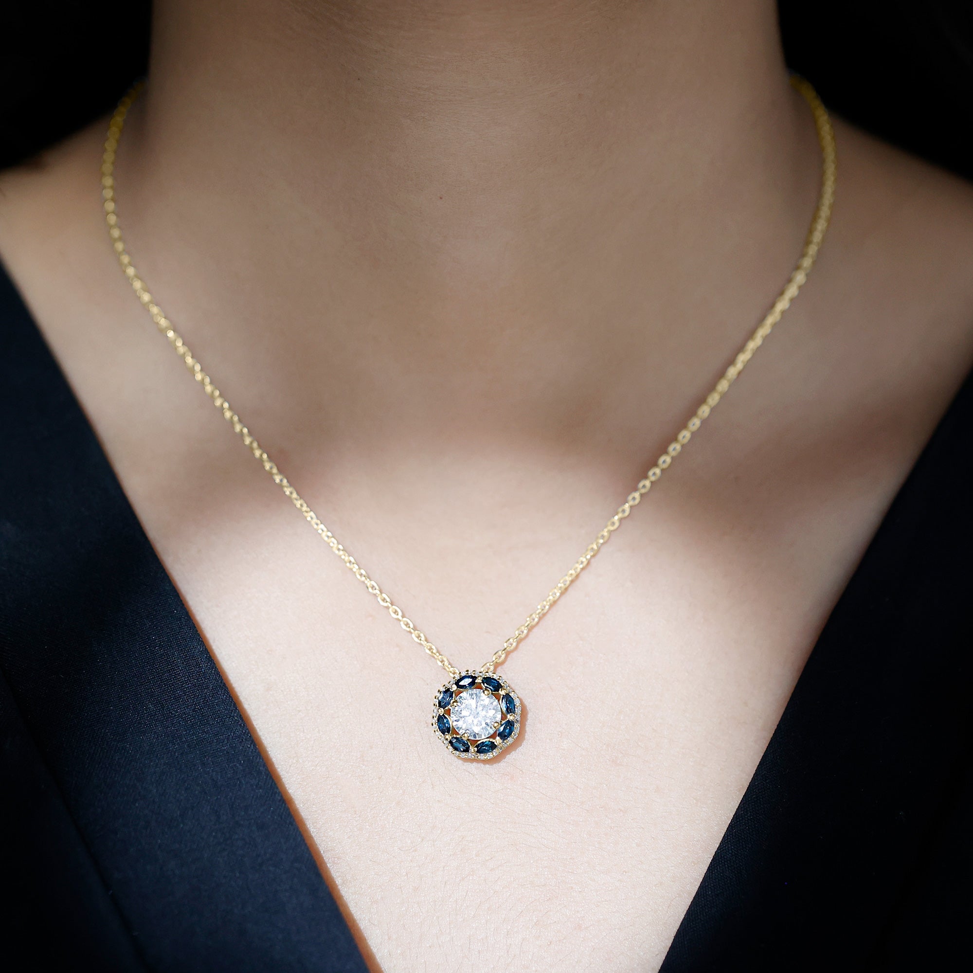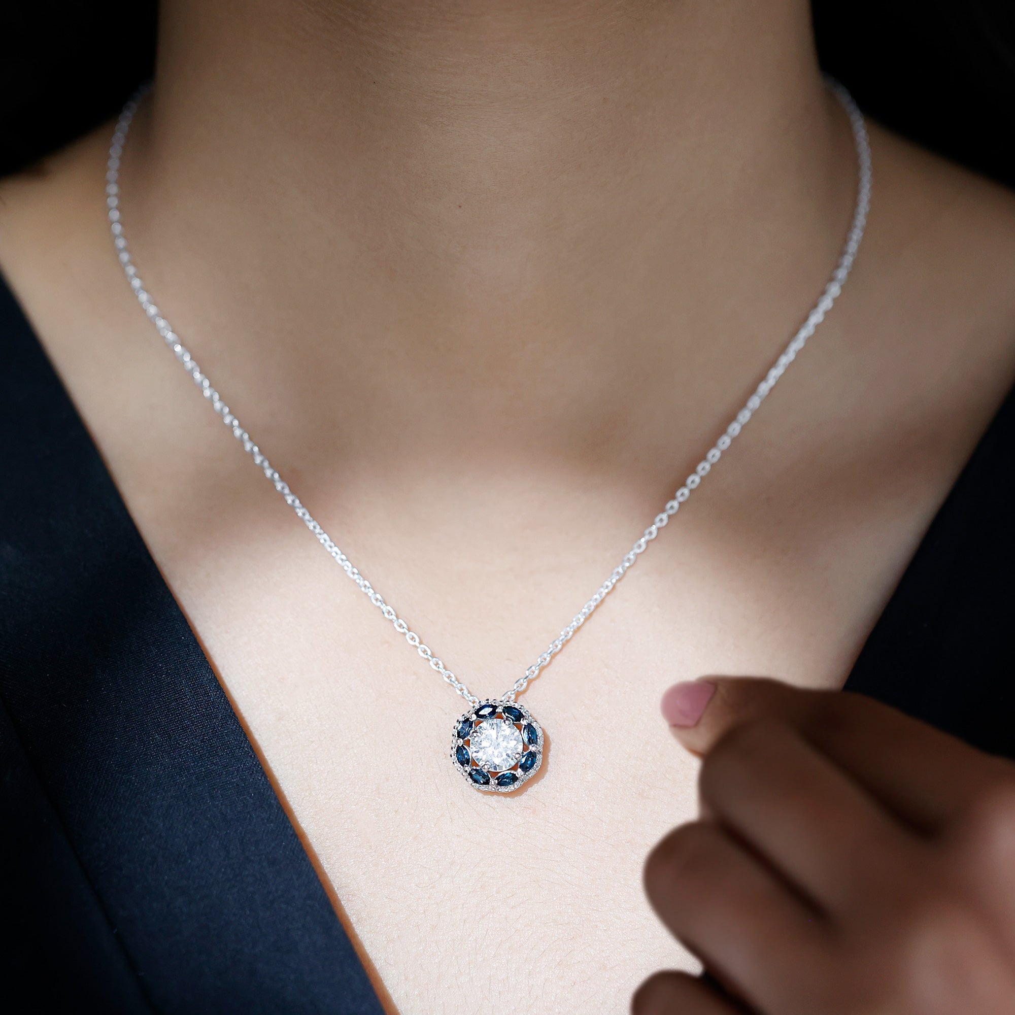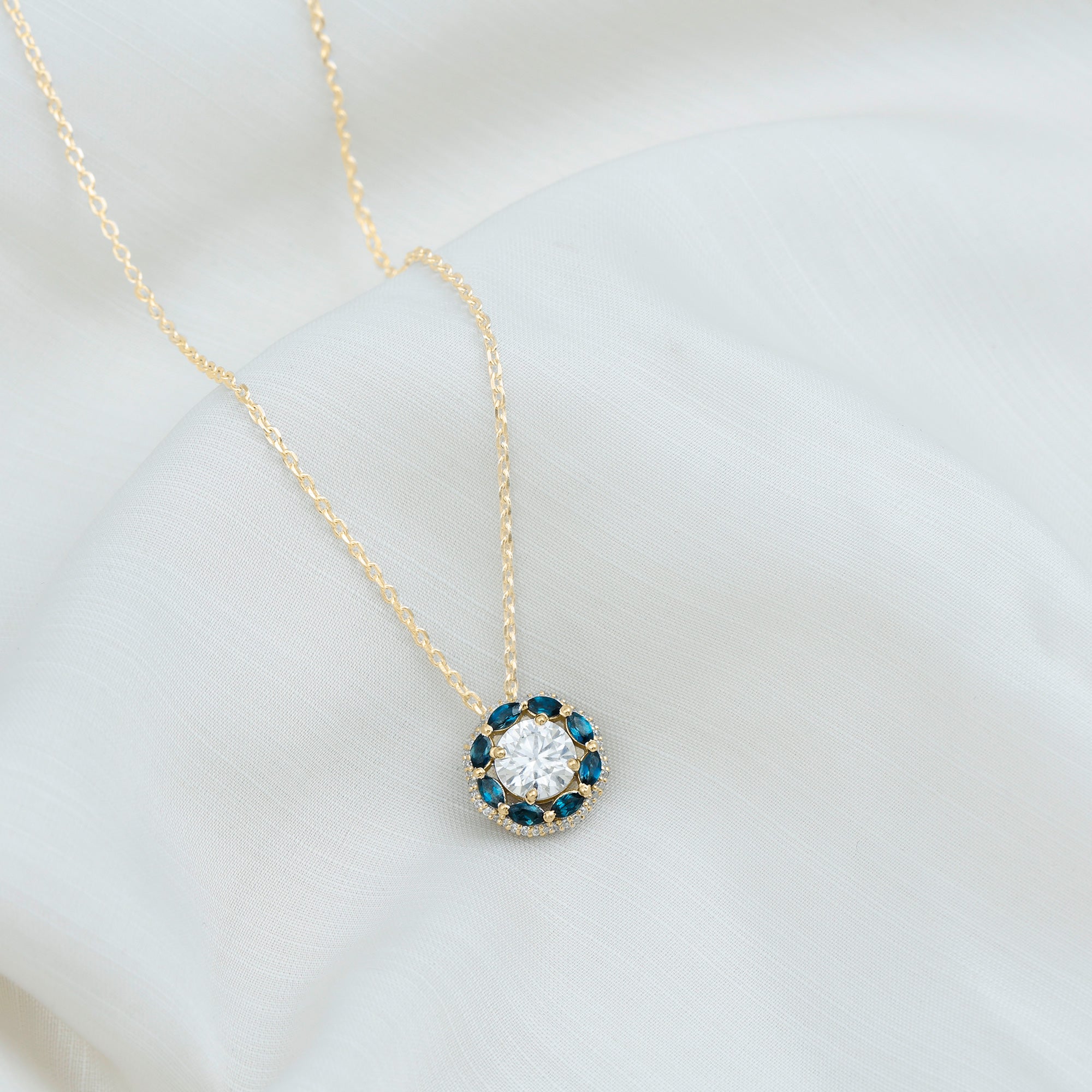 This timelessly gorgeous Halo Necklace features a glittering 8 MM round-shaped diamond center set in prong setting and surrounded by marquise shaped london blue topaz stones and sparkling round cut small diamonds. Not only does this Flower Pendant exude luxury, but it also reflects a conscious choice, handcrafted with lab made diamonds, this is eco-friendly and affordable. Additionally, this Diamond and Topaz Necklace is available in a variety of metal color options so you can choose whatever suits your unique style and make it a truly personalized piece. If you are looking for something unique, timeless, and full of brilliance, this is the perfect pendant to celebrate your love.