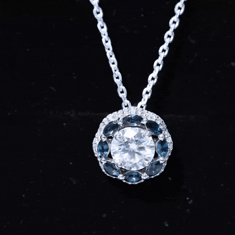 This timelessly gorgeous Halo Necklace features a glittering 8 MM round-shaped diamond center set in prong setting and surrounded by marquise shaped london blue topaz stones and sparkling round cut small diamonds. Not only does this Flower Pendant exude luxury, but it also reflects a conscious choice, handcrafted with lab made diamonds, this is eco-friendly and affordable. Additionally, this Diamond and Topaz Necklace is available in a variety of metal color options so you can choose whatever suits your unique style and make it a truly personalized piece. If you are looking for something unique, timeless, and full of brilliance, this is the perfect pendant to celebrate your love.