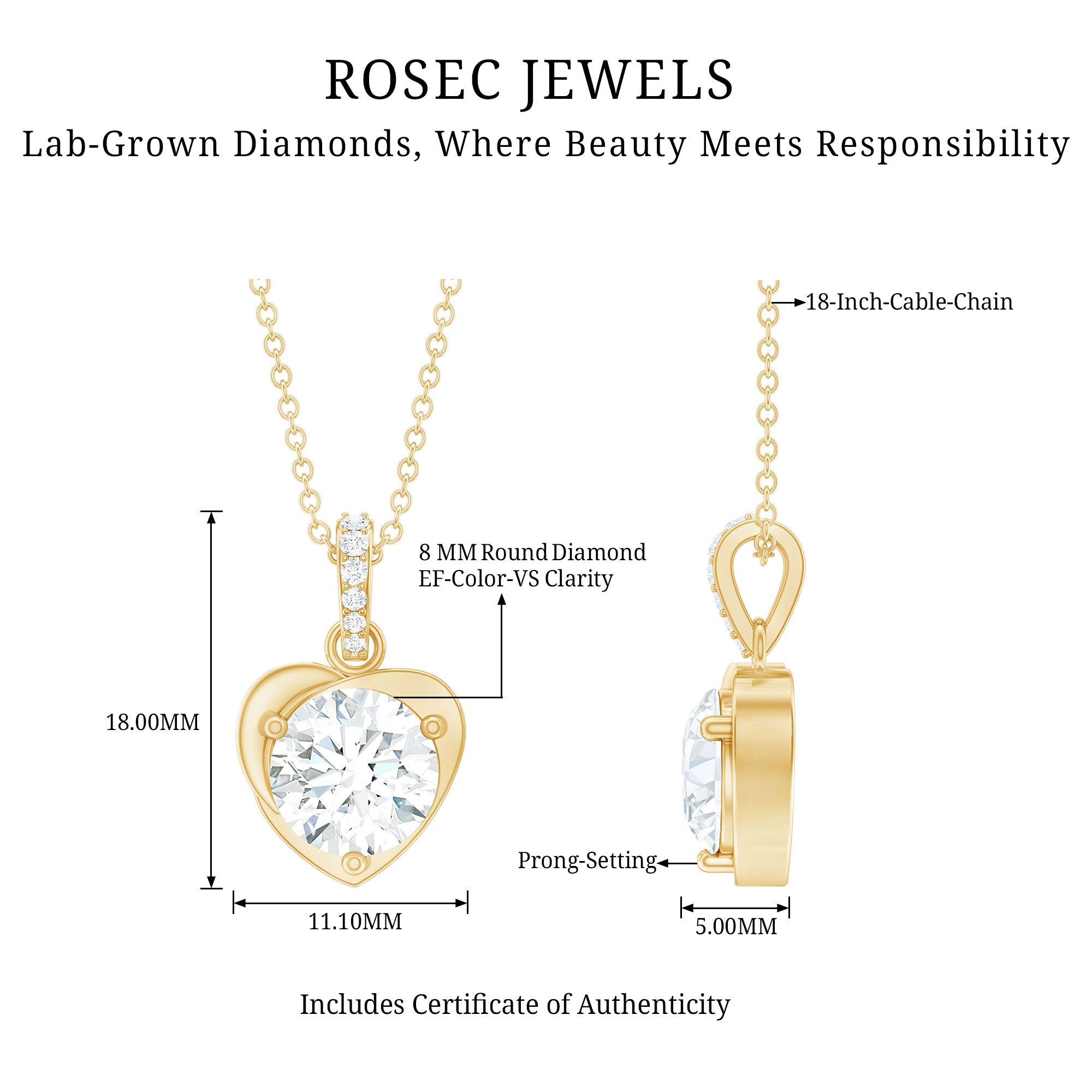 This Lab Grown Diamond Pendant symbolizes love and affection, making it an ideal gift for your beloved, something she will cherish and keep close to her heart. The Solitaire Pendant showcases a beautiful 8 MM Round Shape Diamond of EF-VS quality, elegantly set in Prong Setting within a charming Heart Shape Frame and gracefully hangs from a decorative bail. This Lab Created Diamond Necklace is certain to leave a lasting impression. To ensure its Quality, this Heart Shape Pendant comes with a certificate of authenticity, providing peace of mind.