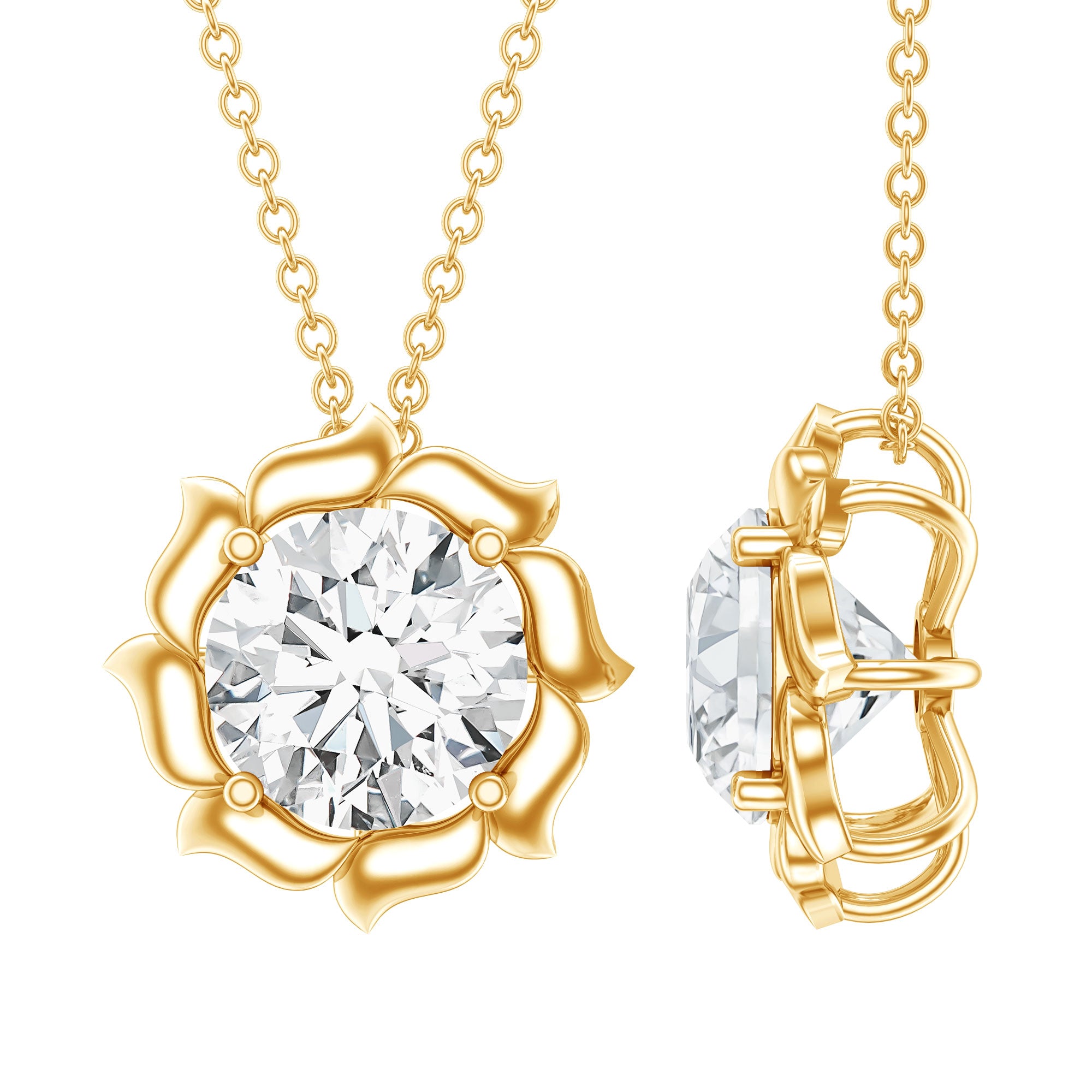 Natures brilliance captured in a single bloom - this exquisite Flower Pendant Necklace is a timeless expression of grace and beauty. Inspired by the elegance of a sunflower, the design features a 2 Carat Diamond of round shape set in prong setting and surrounded by sculpted petals. Whether you are heading to the office, dressing up for a special occasion, or simply elevating your everyday style, this Diamond Solitaire Necklace will give you the perfect look. A symbol of eternal beauty, this Round Diamond Pendant comes with a certificate of authenticity, ensuring its sparkle lasts as long as your love for her.