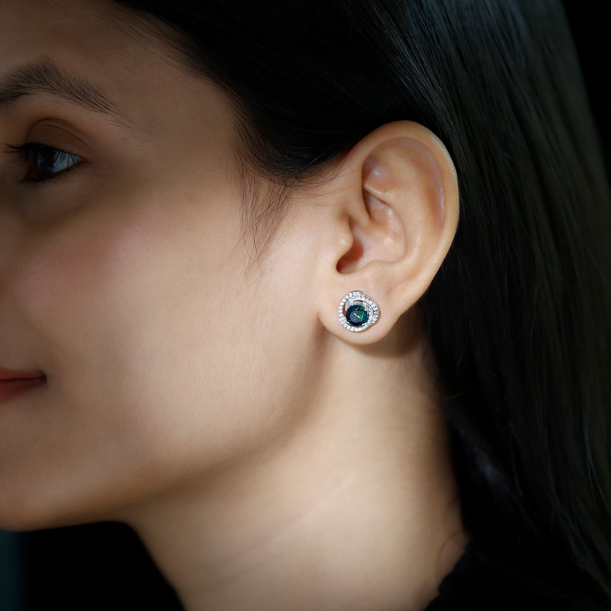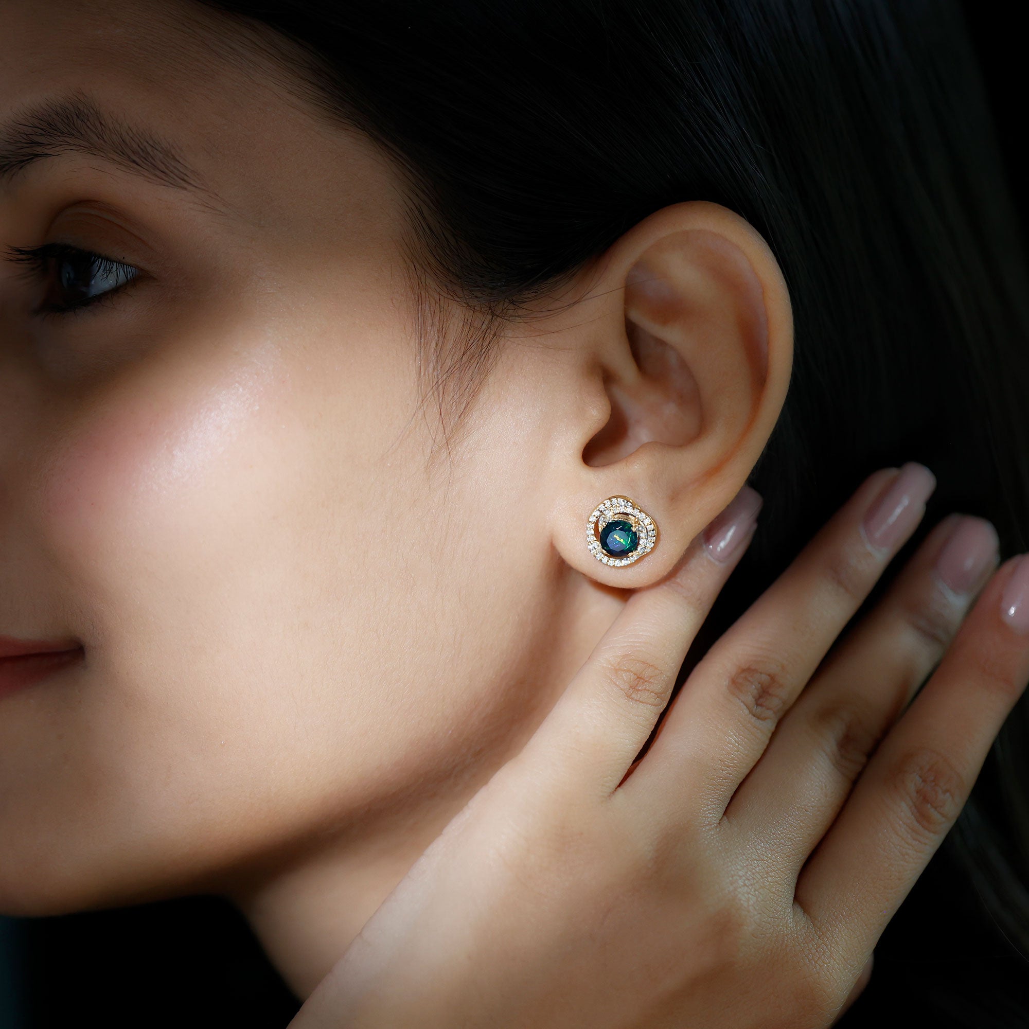 Movement and elegance come together beautifully in these stunning Black Opal Stud Earrings, designed to capture the soft flow of a spiral. They feature glowing 6MM round black opal stones, held securely in prong setting. Surrounding the opal is a swirl of sparkling round moissanites, arranged in a graceful spiral that catches the light from every angle. The swirling pattern gives the Dark Opal Stud Earrings a sense of gentle motion. With secure screw-back closures, these Opal and Moissanite Earrings stay comfortable and safe for all-day wear. Their elegant shape makes them perfect for upgrading any outfit, whether you are dressing up for a special event or adding a touch of charm to your everyday look. The spiral design represents harmony, balance, and beauty, making these Swirl Earrings a thoughtful gift for birthdays, anniversaries, or romantic moments. The rich colors of the black opal paired with the bright sparkle of moissanite create a striking contrast that feels both modern and timeless. More than just jewelry, these Spiral Earrings are a graceful expression of movement, light, and everlasting elegance.