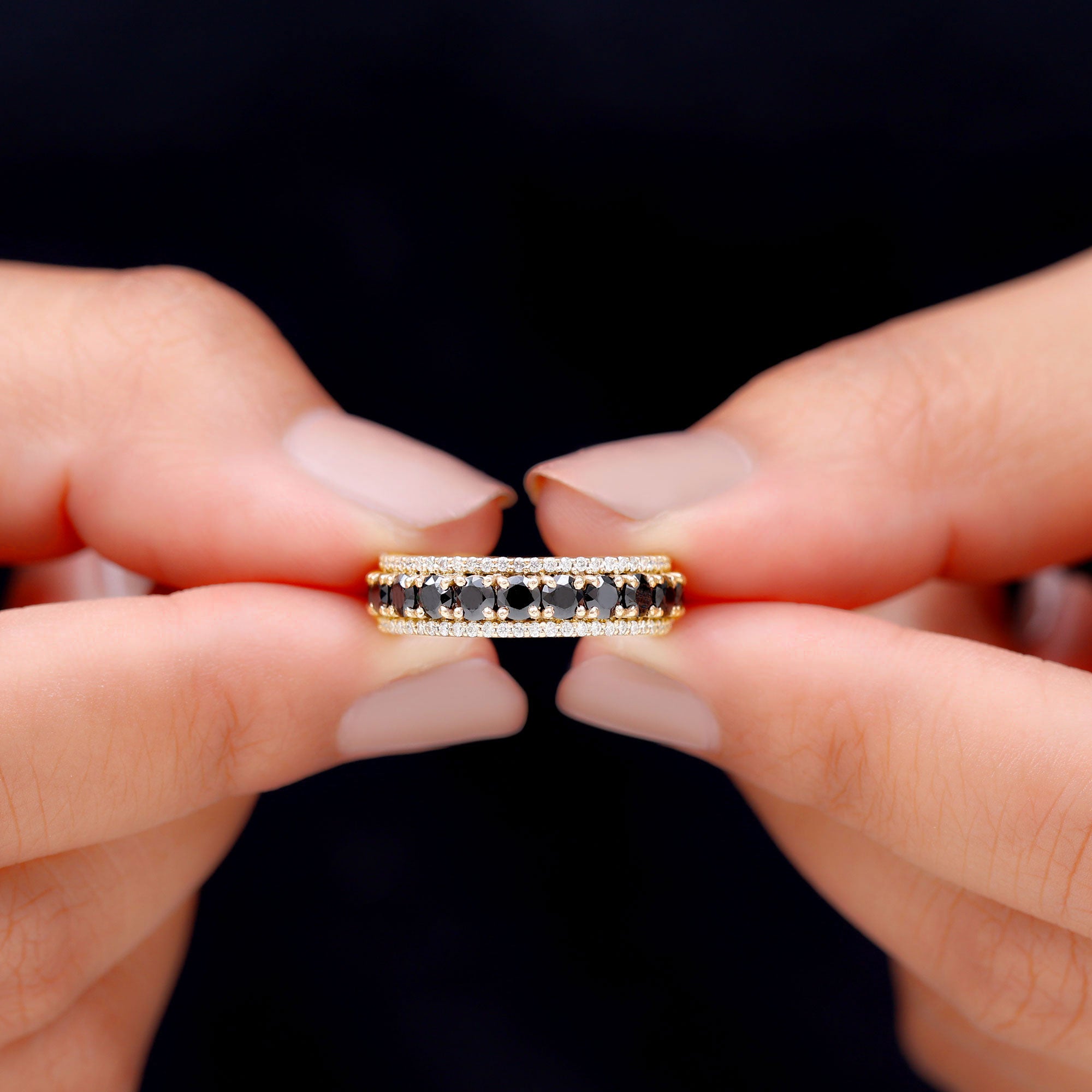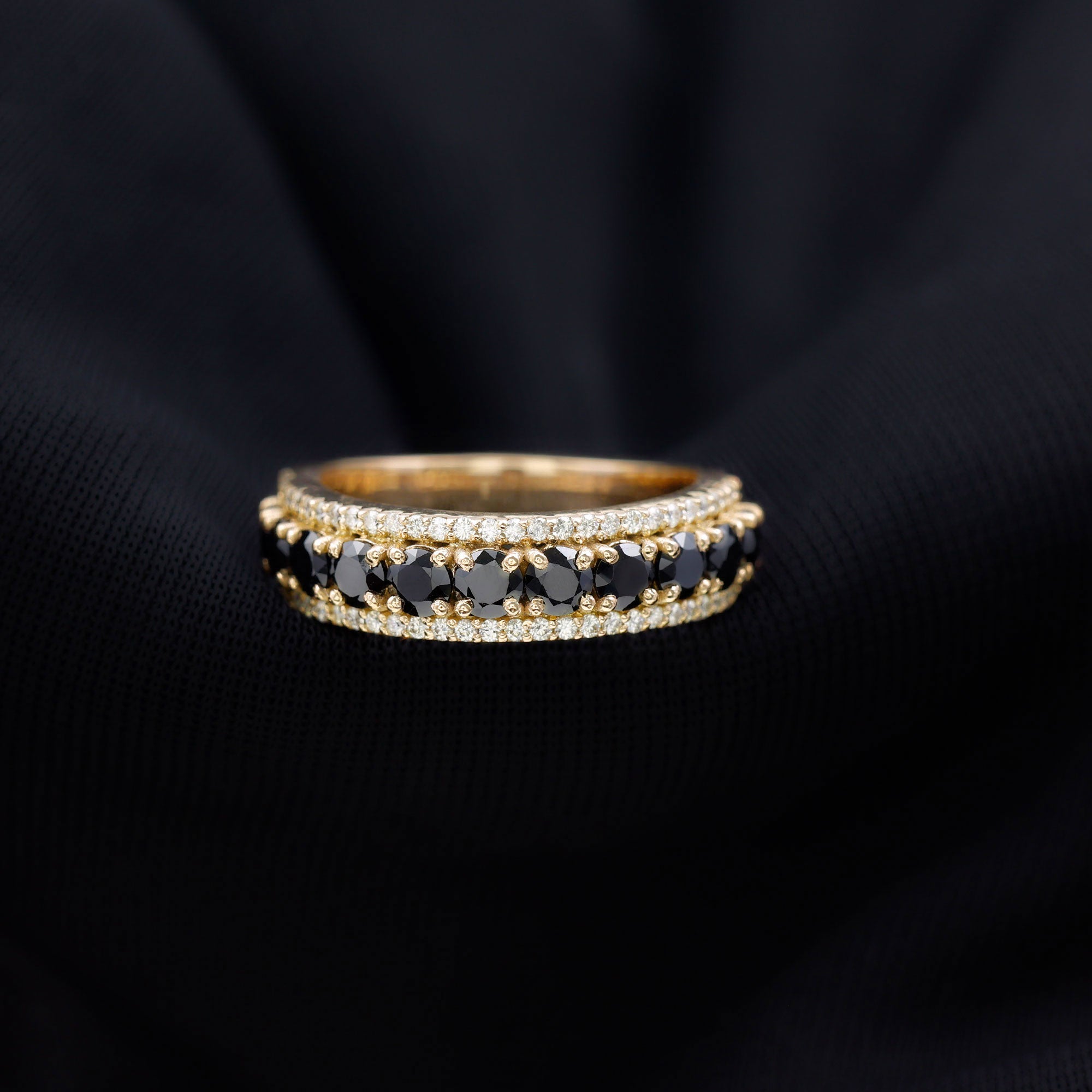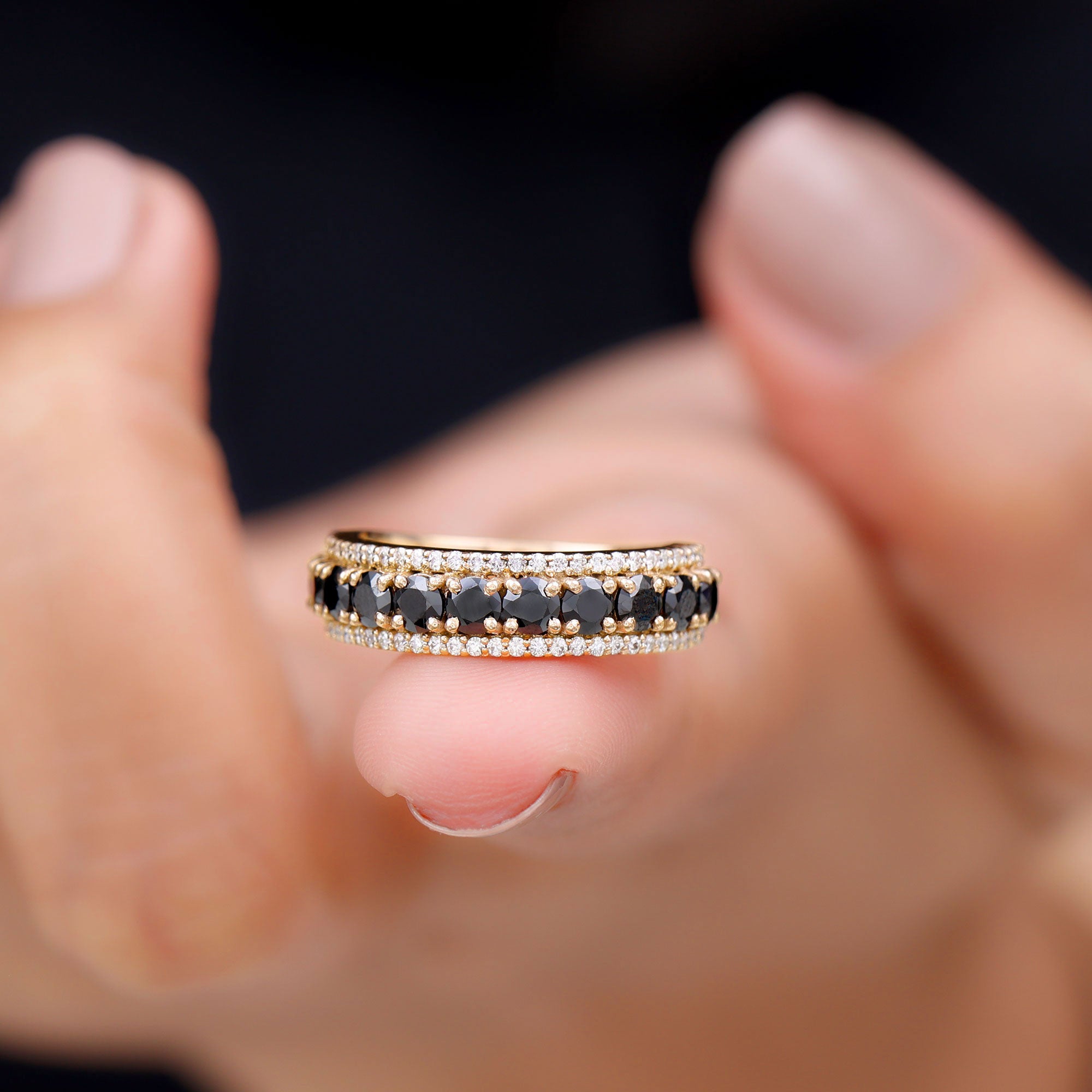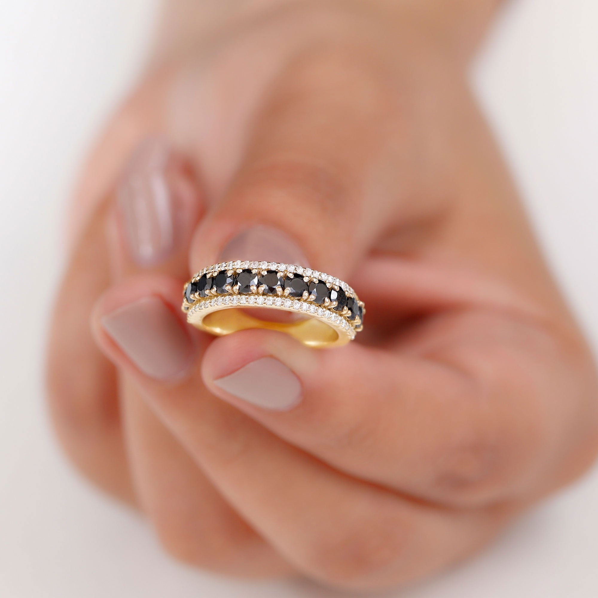 The Anniversary Ring features Round Shape Lab Created Black Diamonds in Prong Setting as middle row and surrounded by White Diamond Accents. This Solid Gold crafted Half Eternity Ring is a perfect trinket to commemorate the occasion.