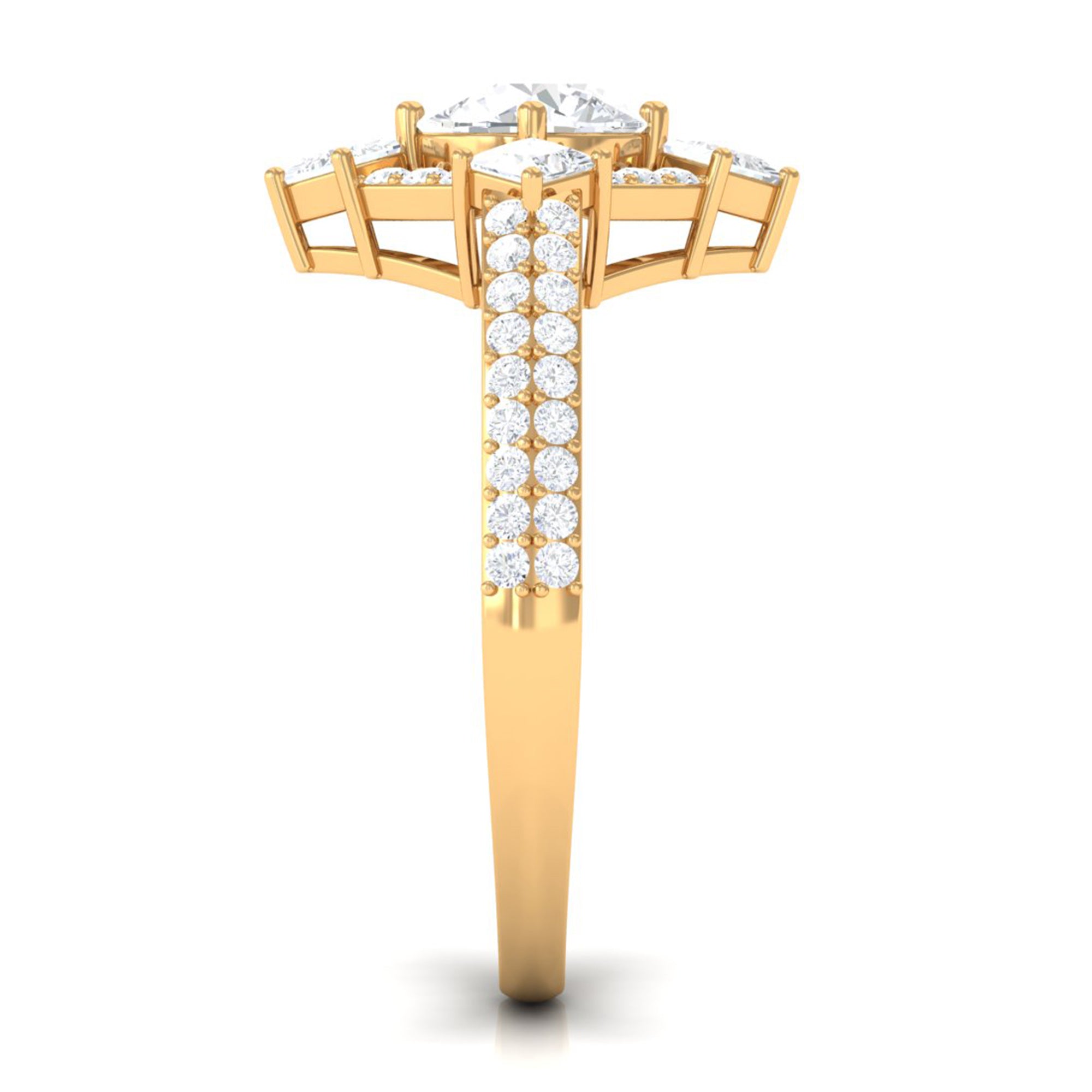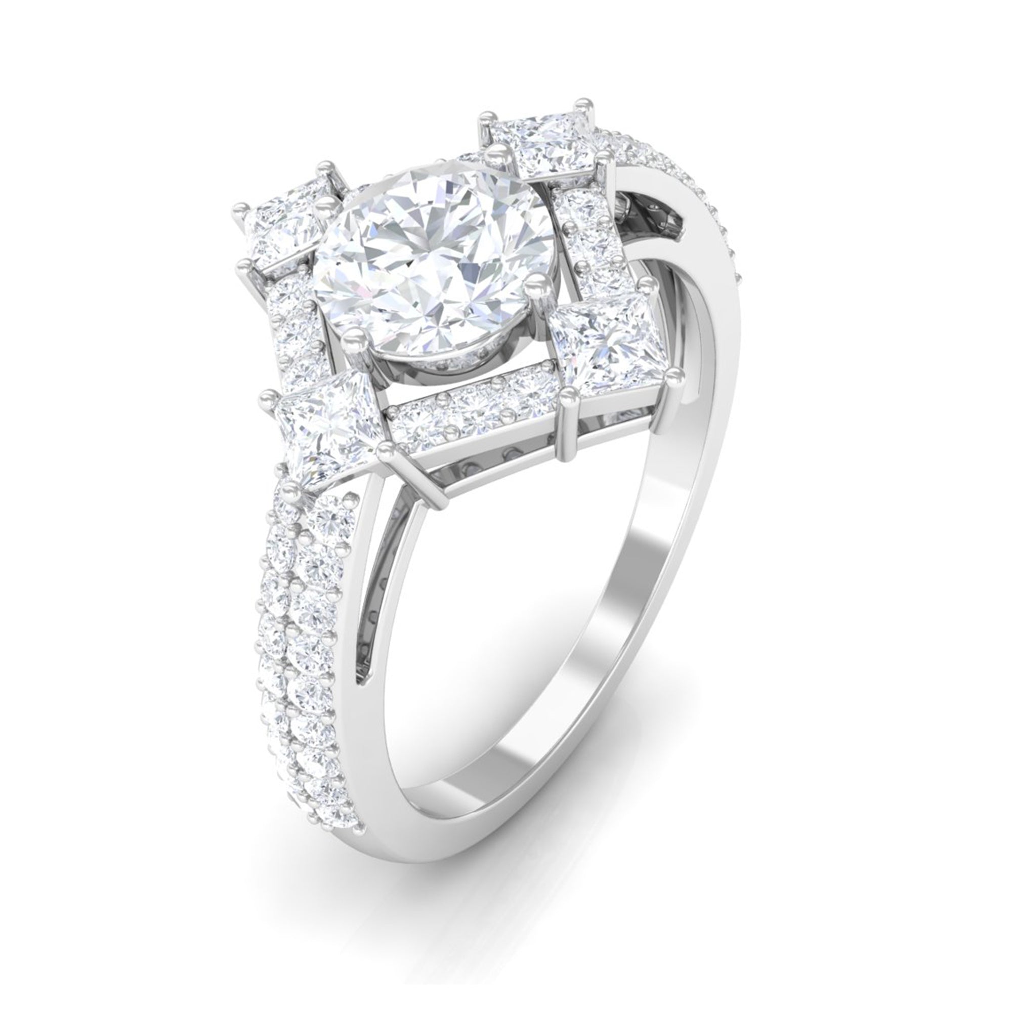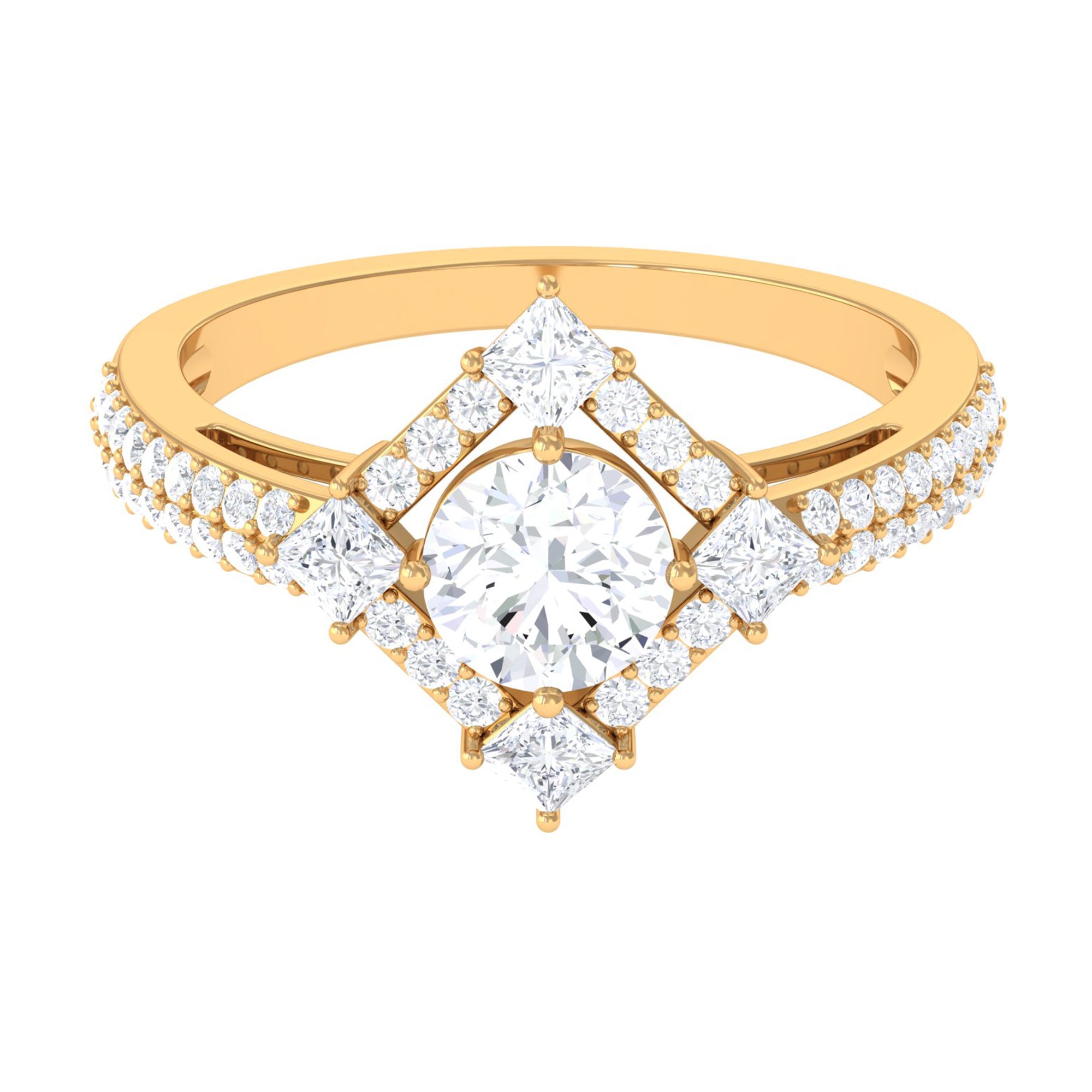Make a bright and beautiful statement donning a Zircon Engagement Ring embellished with Round Shape Zircon in Prong Setting and surrounded by princess and round cut cubic zirconia accent with side stones. Have been crafted in Gold, this Simulated Diamond Ring for Women goes paired up with any attire.