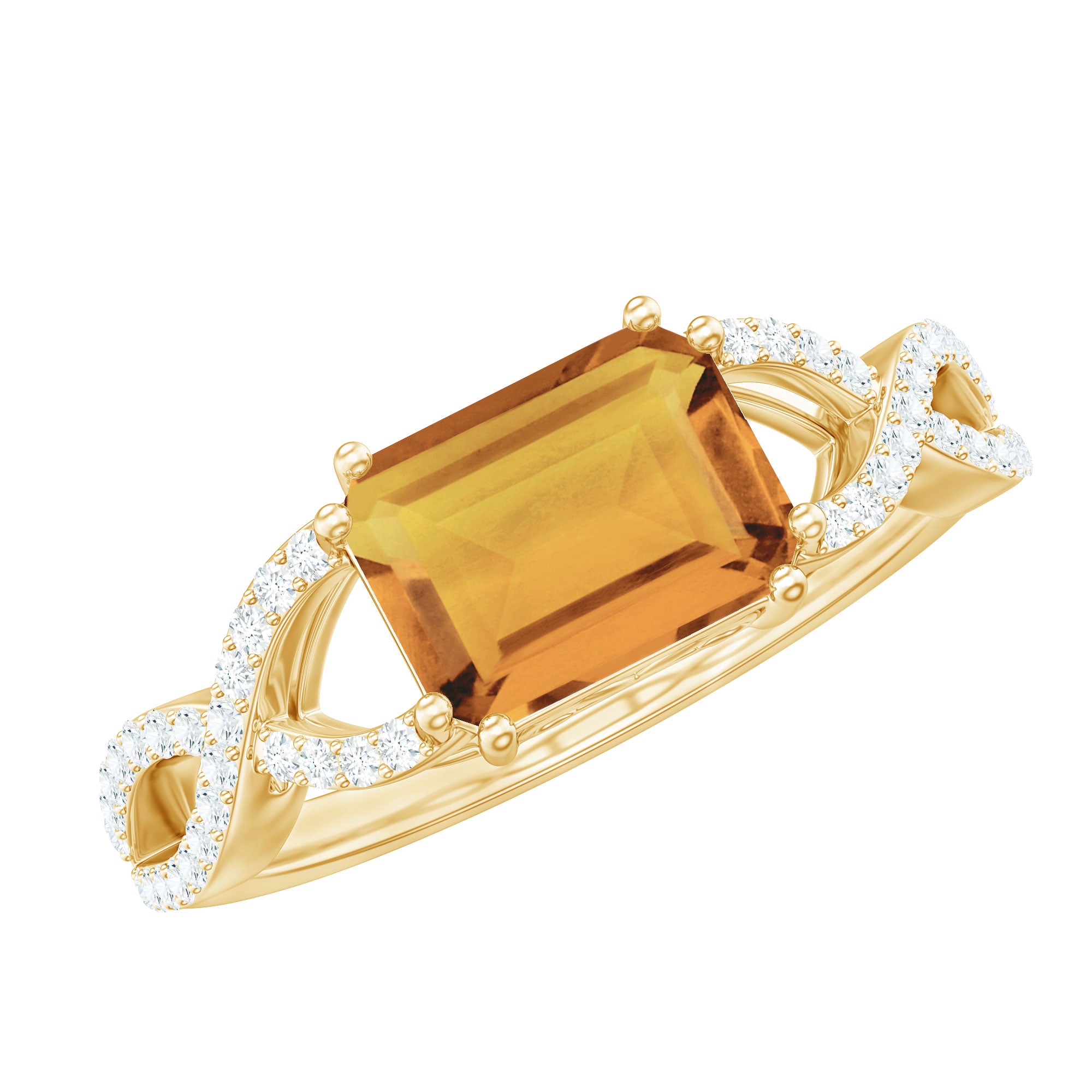 Introducing a stunning Designer Citrine Engagement Ring to enhance your beauty with its captivating yellow hue. Featuring an exquisite Emerald Cut Citrine gemstone set as a solitaire in an East-West style and embellished with Diamond on a Gold Crossover Shank, this Solitaire Ring is the perfect choice for women born in November.