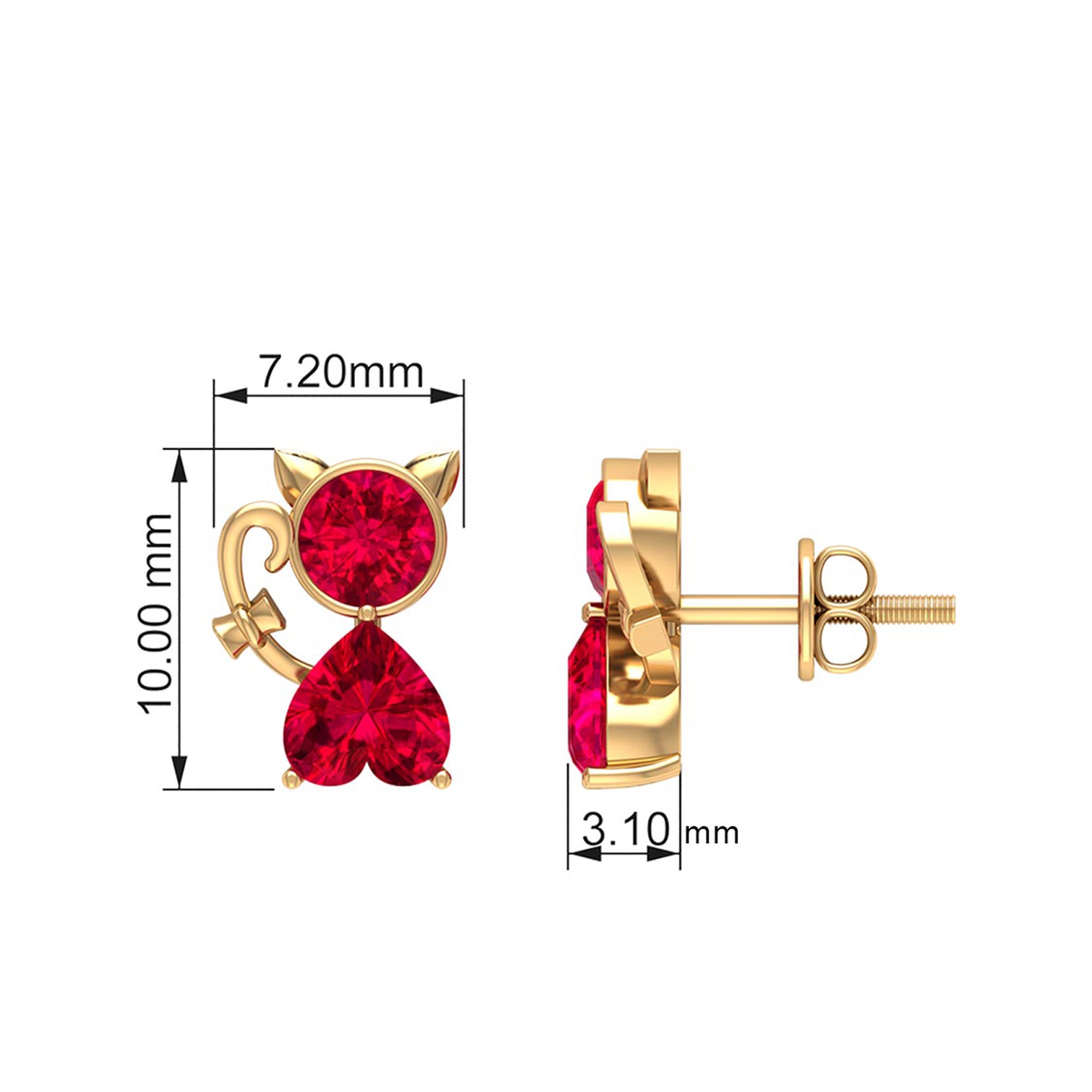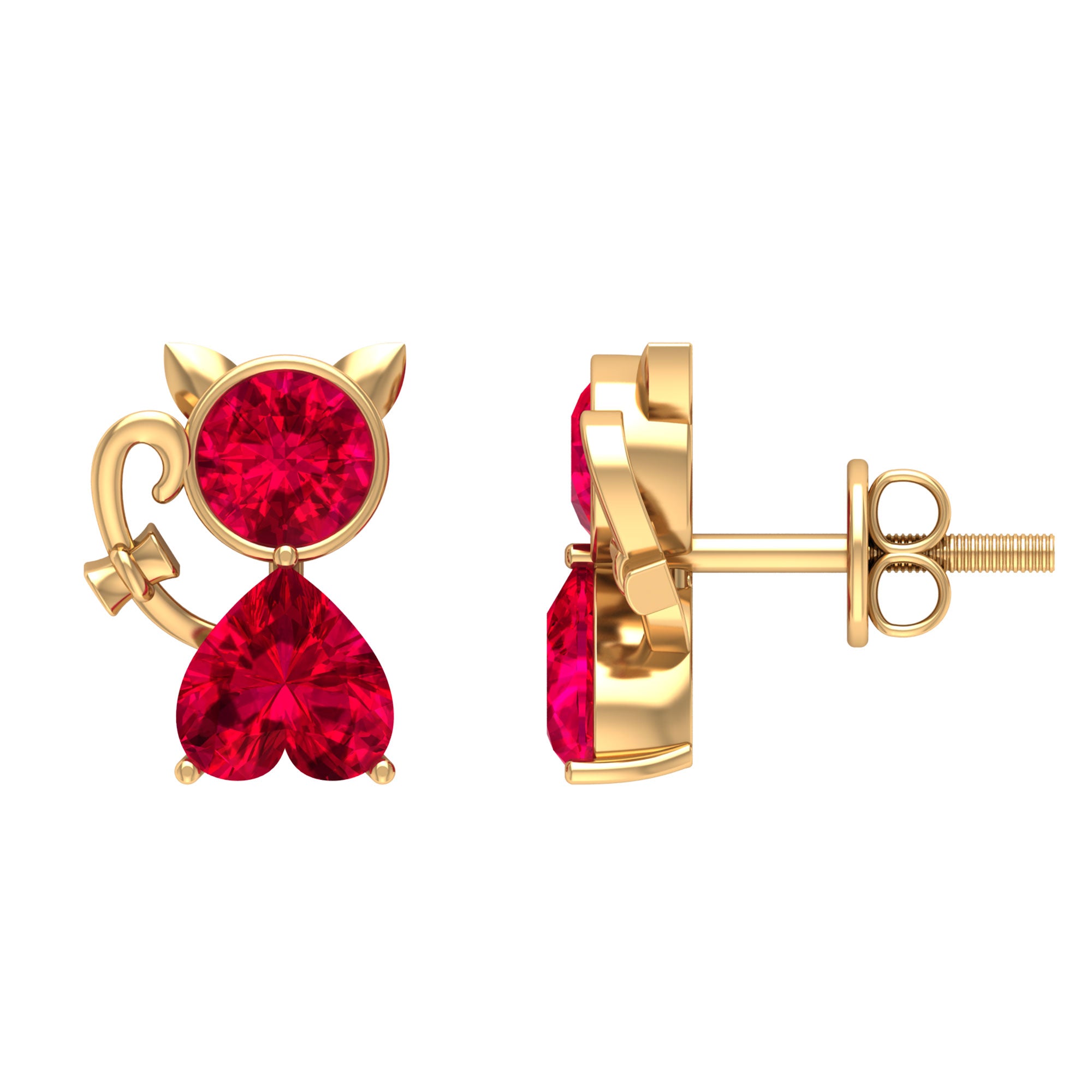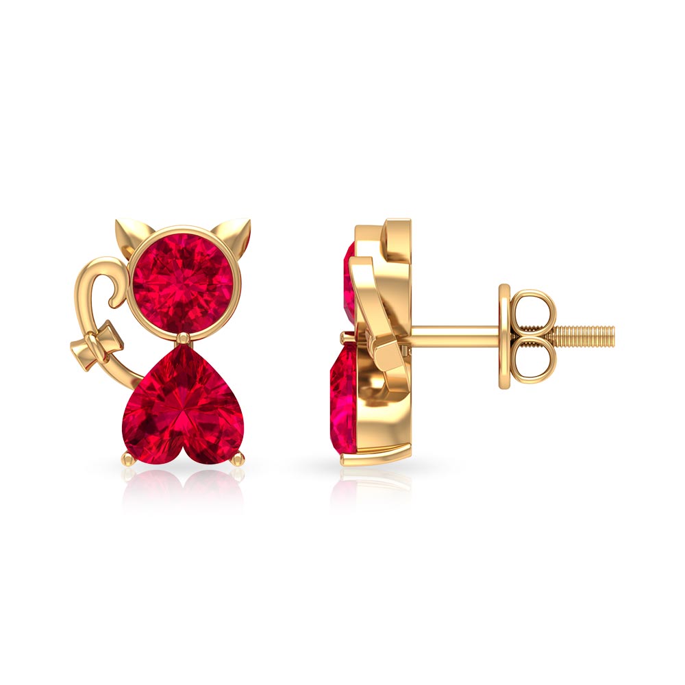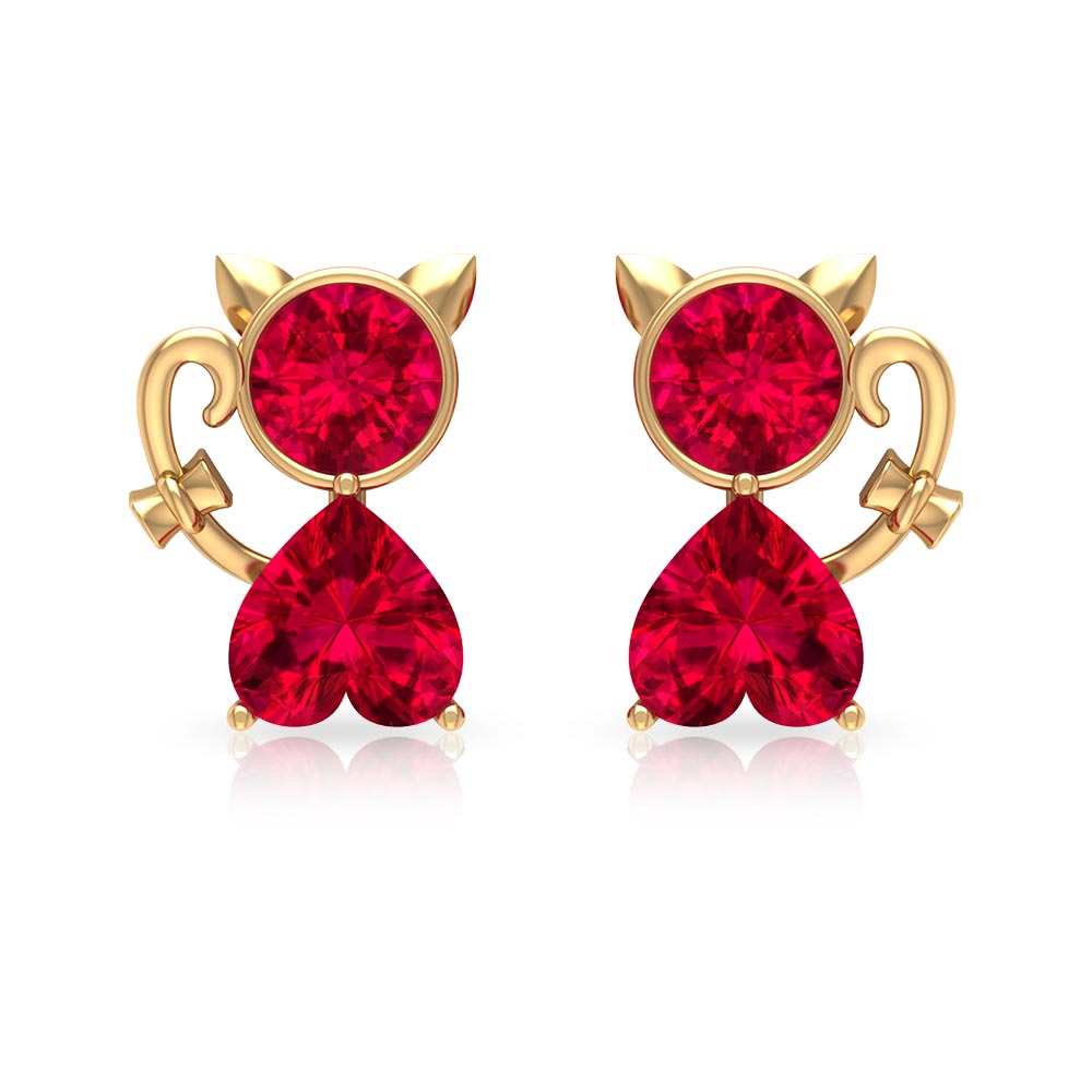 This Kitty Stud Earrings embellished with Round and Heart Shape Created Ruby Gemstones are set in Bezel and Prong Setting respectively, crafted in a Solid Gold.