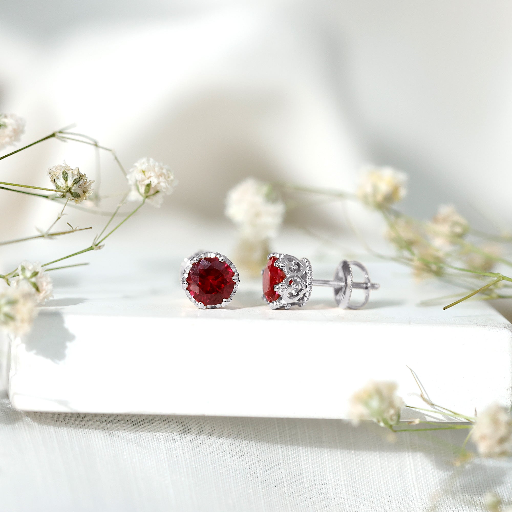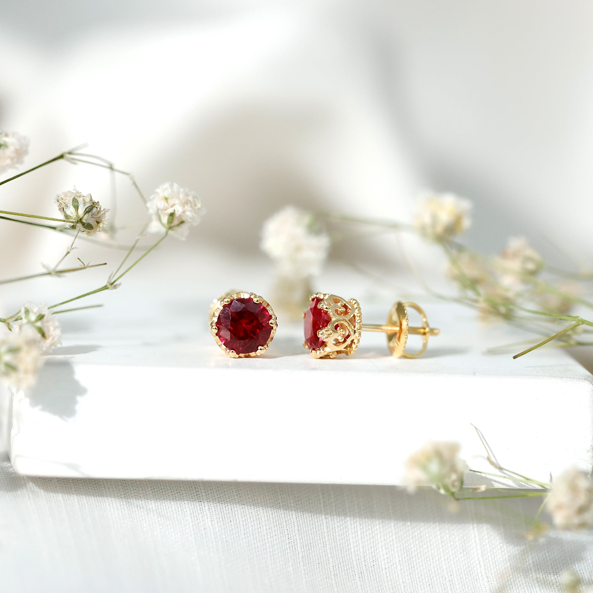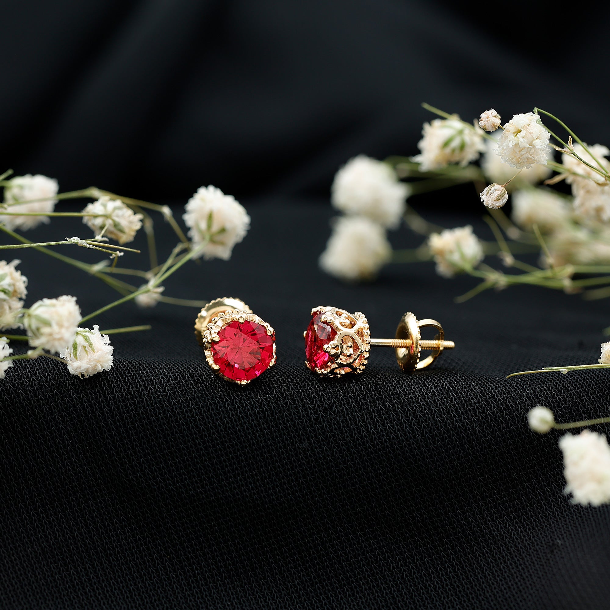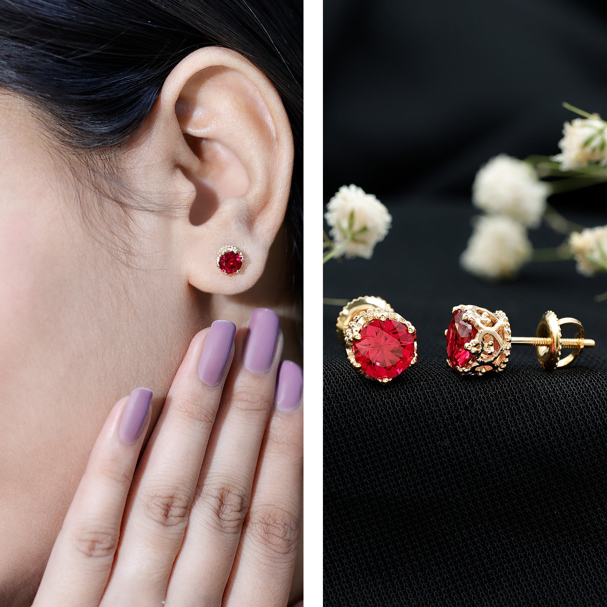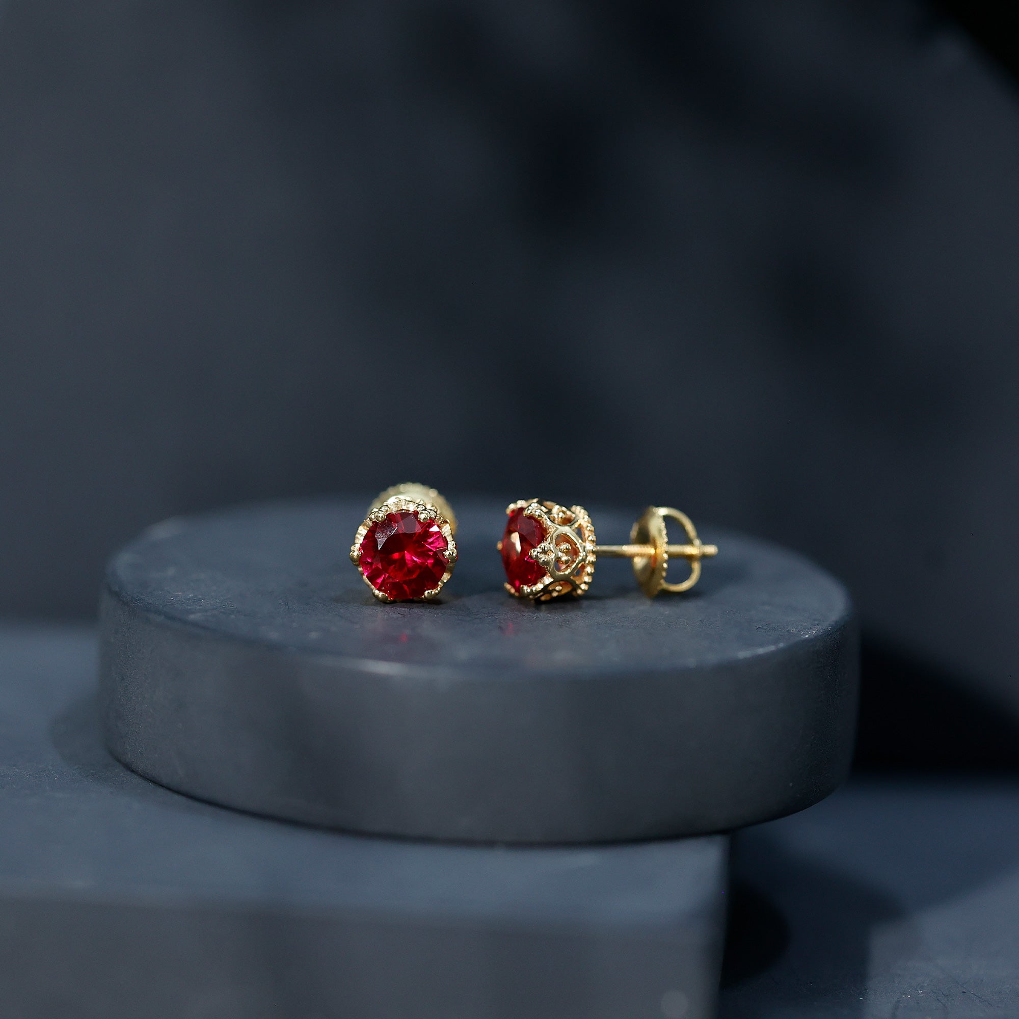 Presenting The Hand Picked Crown Stud Earring with Solitaire Gemstone to empower your Look. The Screw Back Finding Stud Earrings are embellished with 6 MM Round Cut Lab Created Ruby in Crown Setting studded as Single stone. Solid Gold composition of Crown Setting Creates a Charming Appeal.