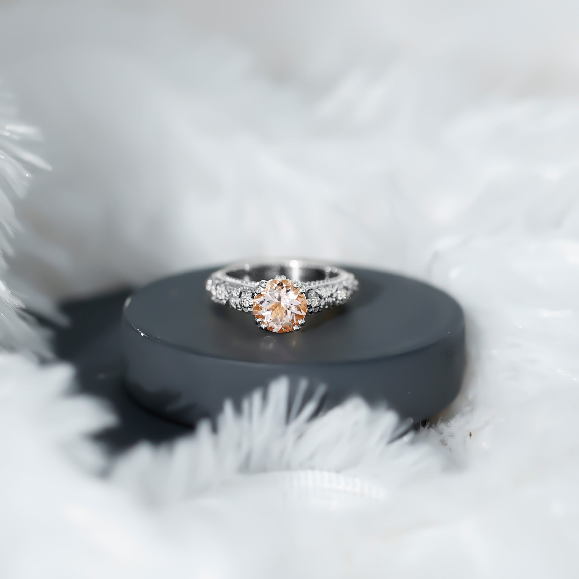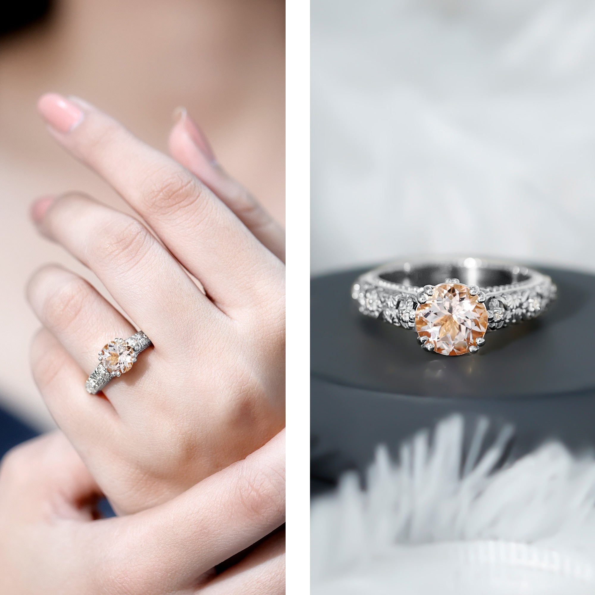 Make your special person feel like a princess by giving her this gorgeous Flower Engagement Ring on her big day. Featuring an 8 MM Round Shape Morganite Solitaire set at the center and Round Shape Diamond embracing the beauty of this Morganite Engagement Ring in prong setting.