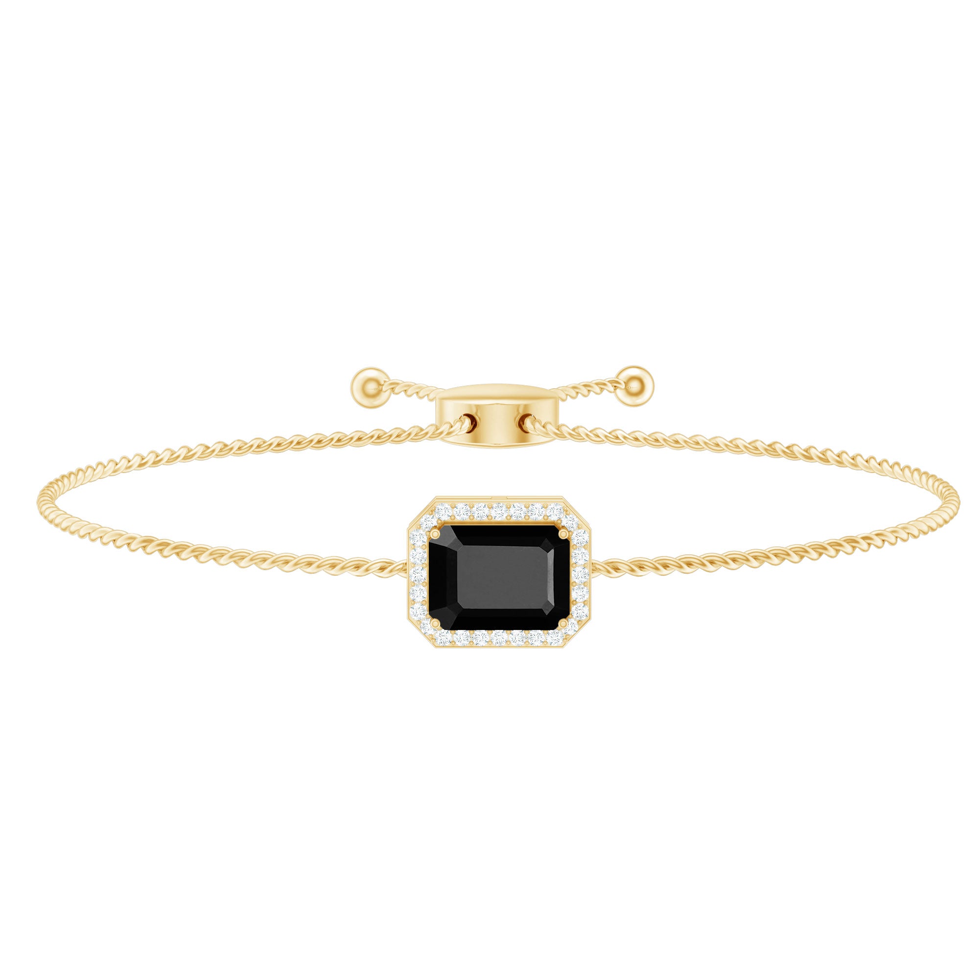 Elevate your personal style with our Bolo Chain Bracelet, which showcases a remarkable contrast. The emerald-cut Black Onyx is gracefully held in a prong setting, surrounded by delicate round diamonds that create a mesmerizing halo. The secure closures at both ends ensure safety and facilitate easy adjustments. The alluring blackish hue and timeless sparkle of the diamonds are sure to capture everyones attention and place you in the spotlight. Treat yourself or gift it to a loved one, as it makes a delightful birthday or anniversary present. This Natural Black Onyx Bracelet, with its extraordinary design, represents a blend of simplistic elegance and stunning beauty. Highlighting exquisite luxury, this Halo Chain Bracelet could be the perfect gift for weddings, anniversaries, or any special occasion for someone special in your life. Furthermore, Black Onyx is associated with the December birthstone, making it a considerate gift for her.