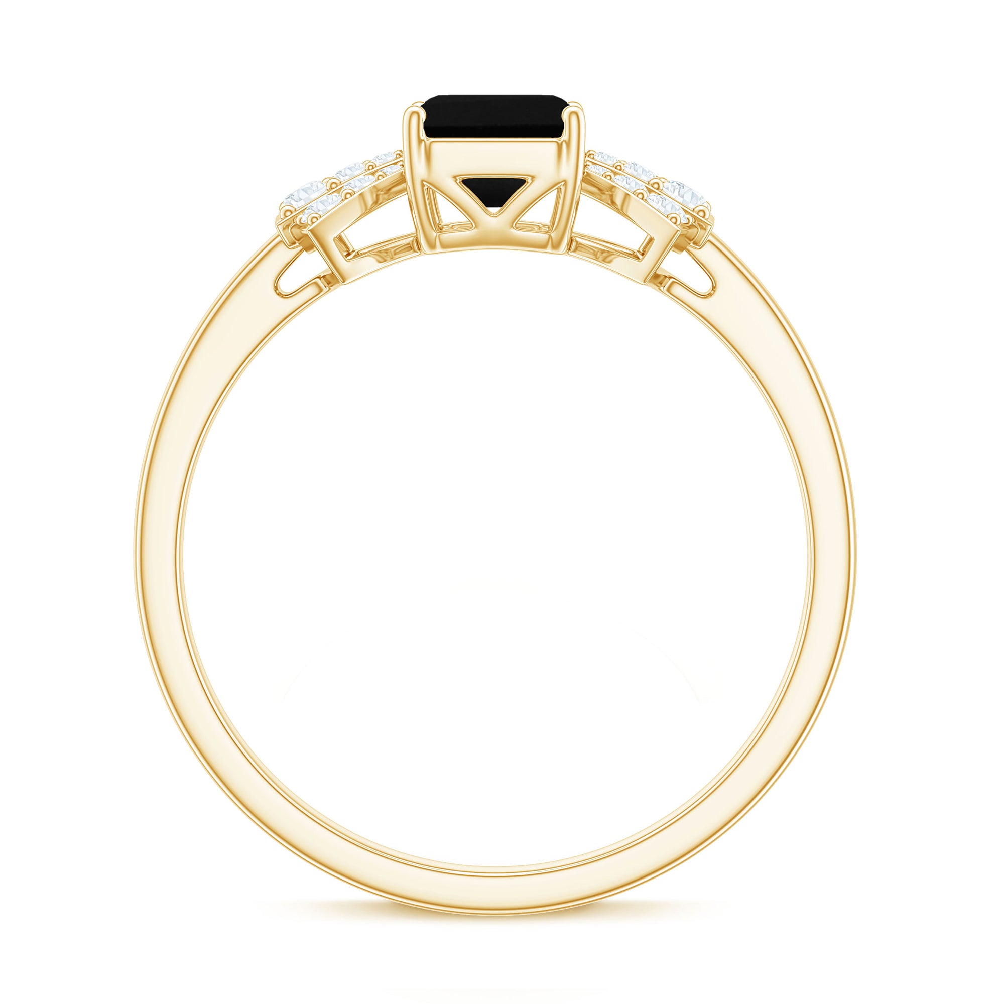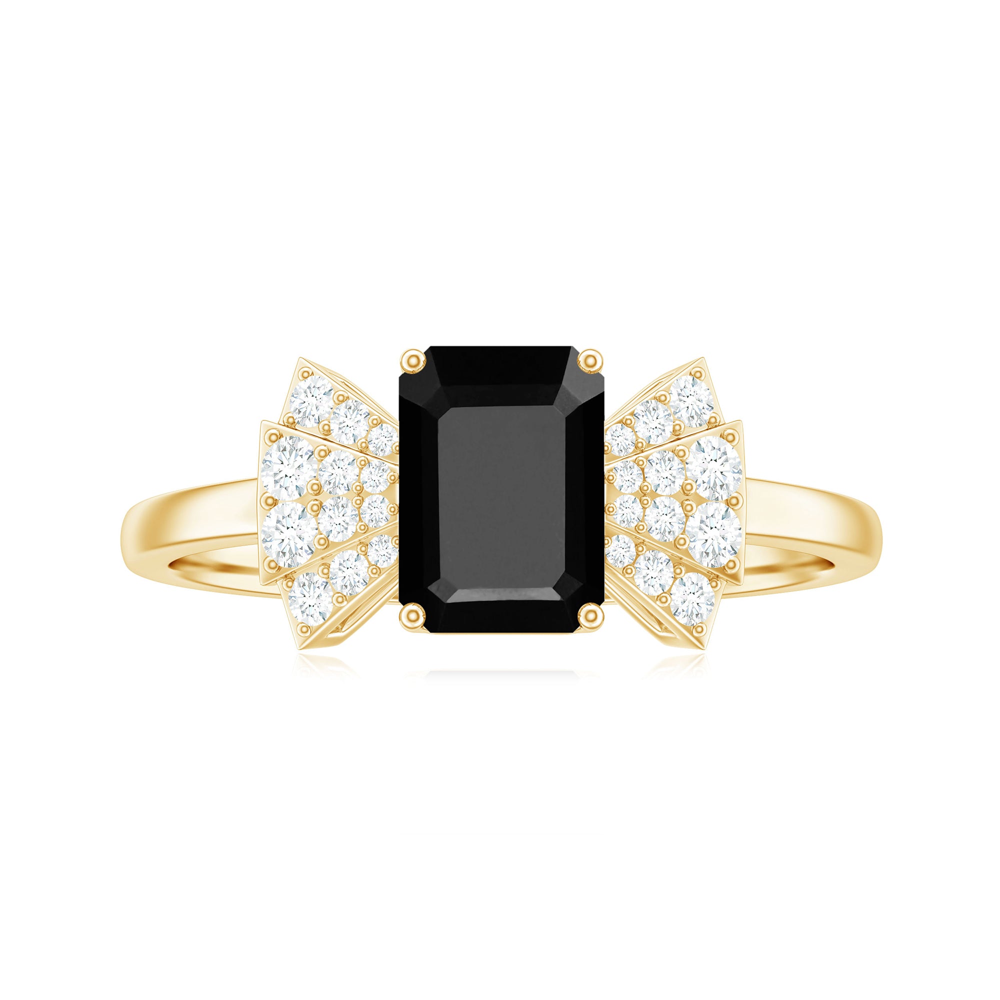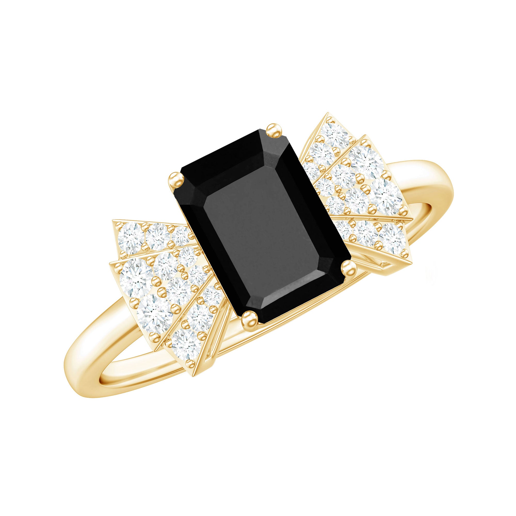 Make a bold statement with this one-of-a-kind Octagon Cut Created Black Diamond Engagement Ring. Its unique shape is sure to turn heads and adds an artistic touch to your look. The ring features a 6X8 MM octagon cut Created Black Diamond in a prong setting, surrounded by round Diamond stones for added sparkle.