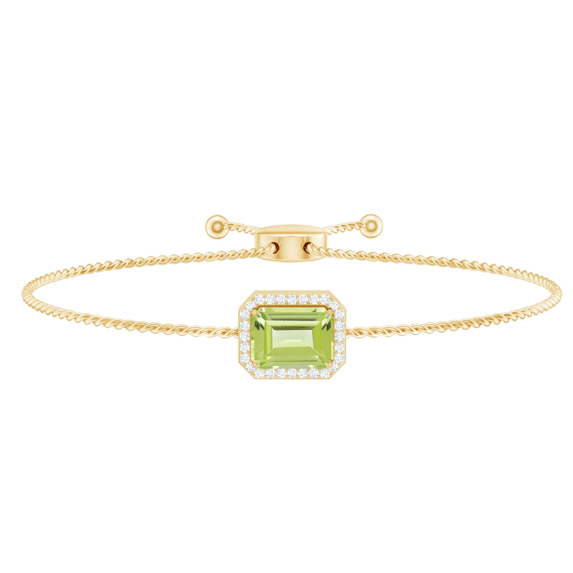 Enhance your Beauty with this Beautiful Gold Bolo Chain Bracelet embellished with Emerald Cut Peridot in Prong Setting with Diamond Accent, crafted in Solid Gold Metal.