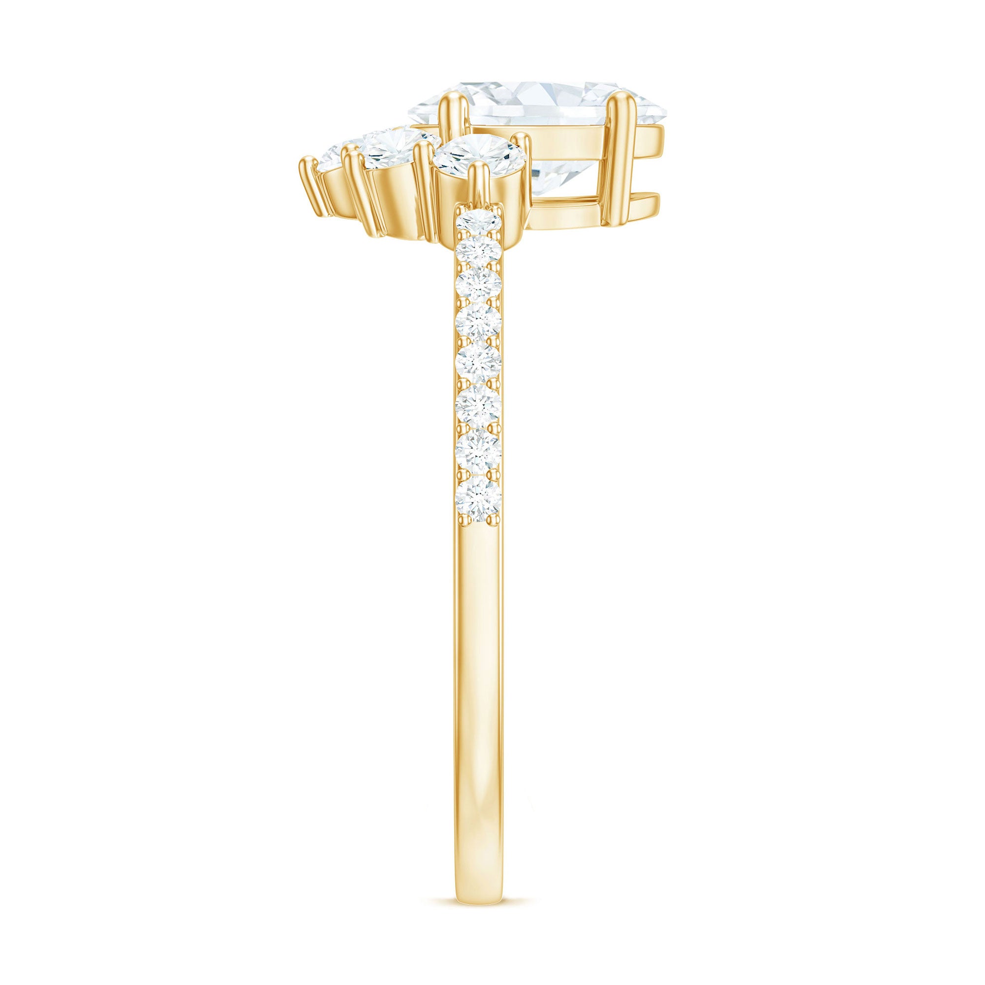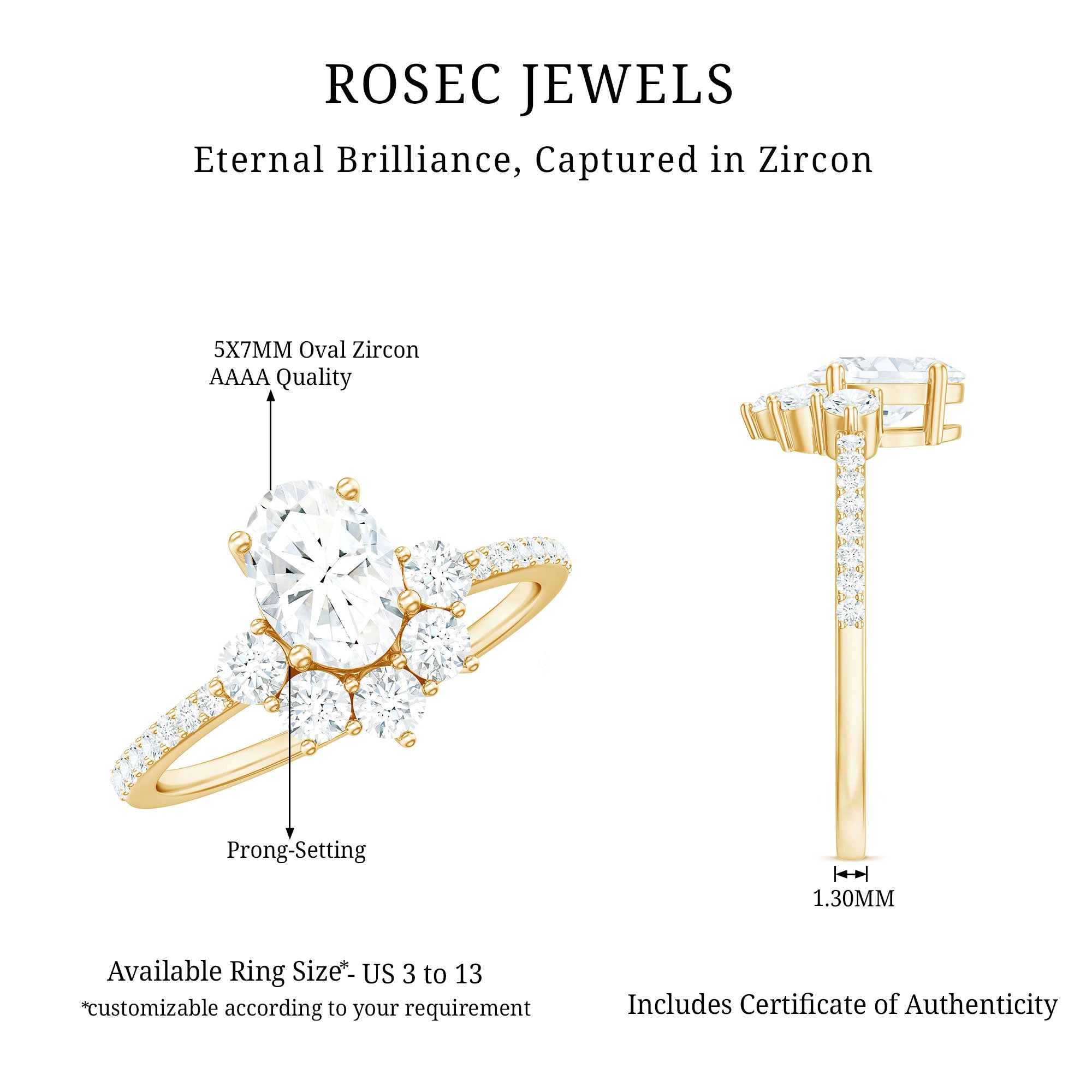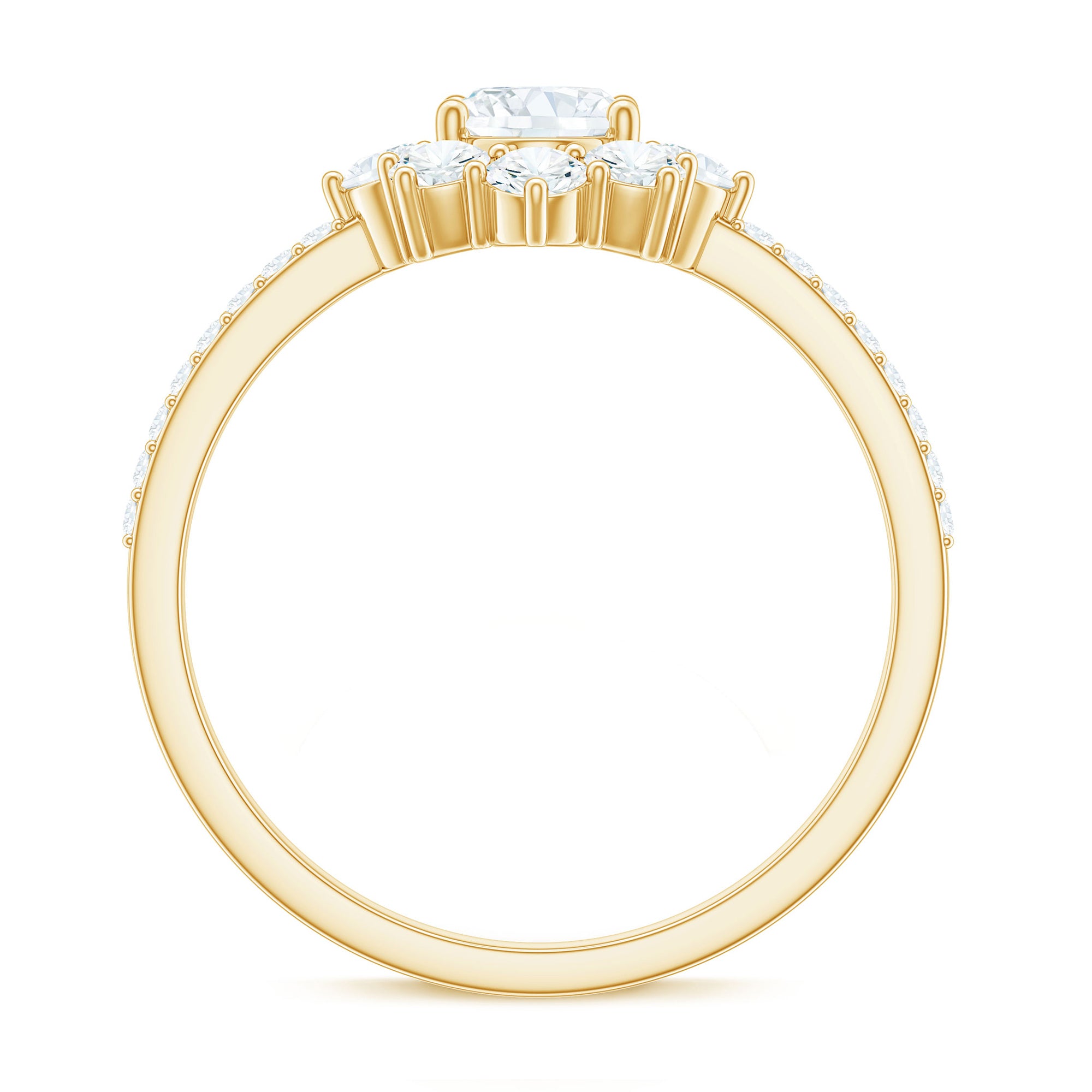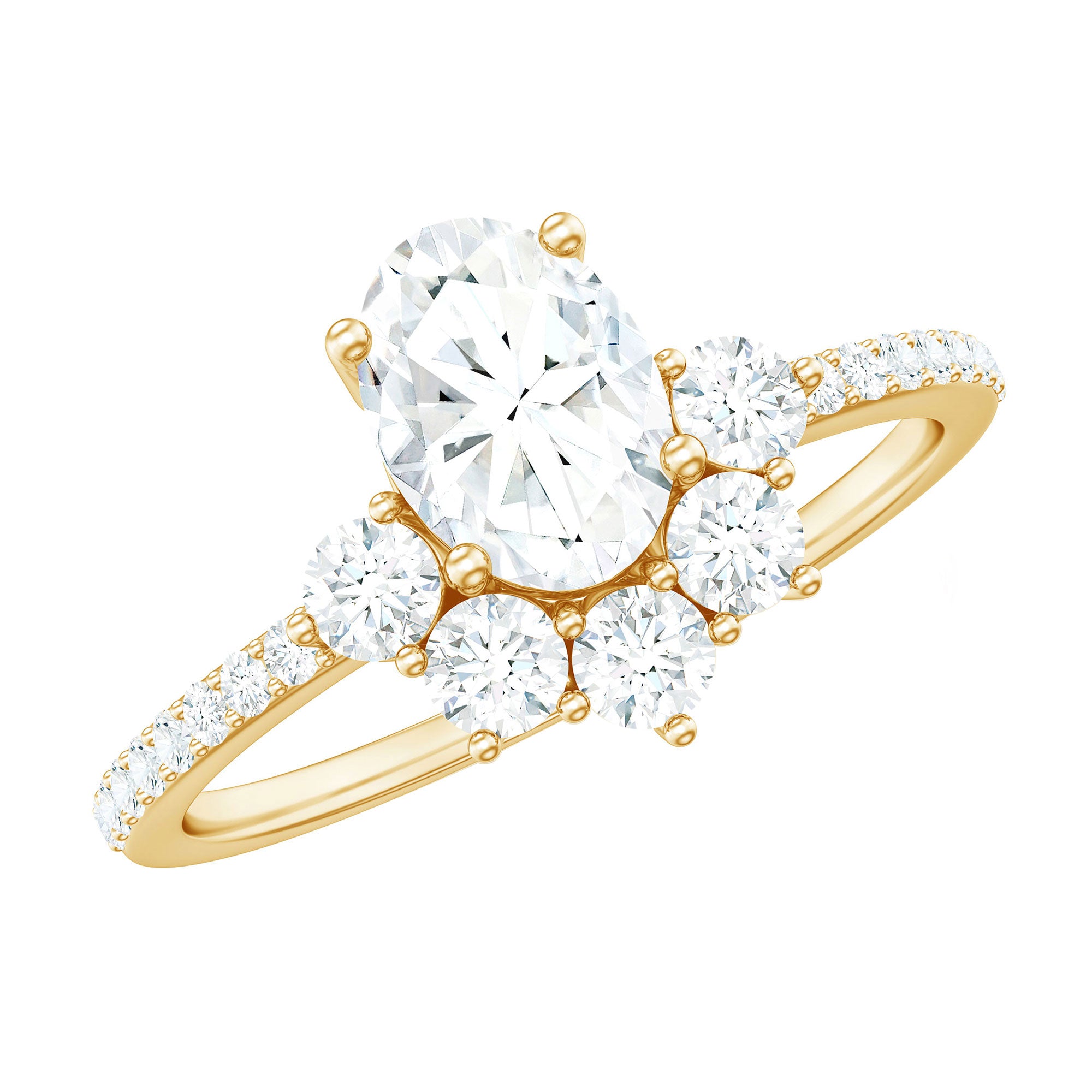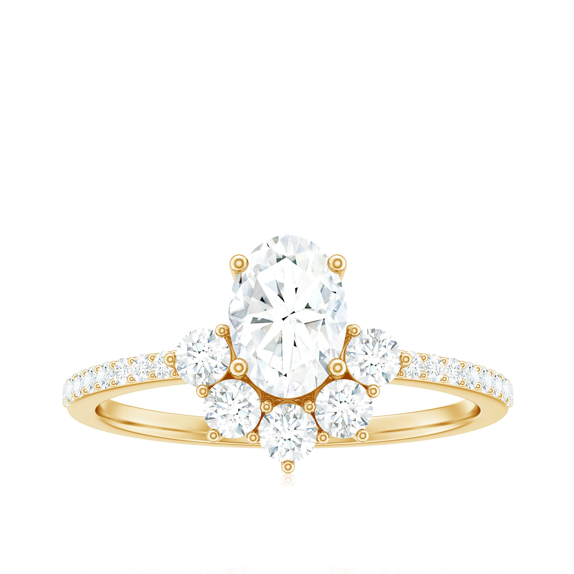 Radiating Oval Cut Zircon Engagement Ring is embellished with designer pattern created by Round Cubic Zircon. This CZ Ring will absolutely make you dazzle with its fine charm. The Half Halo created by zircon make this ring a creative look. Splendidly crafted in Gold, this Engagement Ring is stunning choice for your special day.