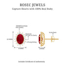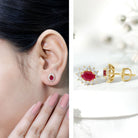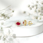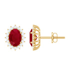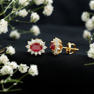 These Classic Starburst Stud Earrings are embellished with Oval Cut Ruby and are set as Solitaire in a Prong Setting encircled with small Round Shape Diamond stones, crafted in a Solid Gold Metal.
