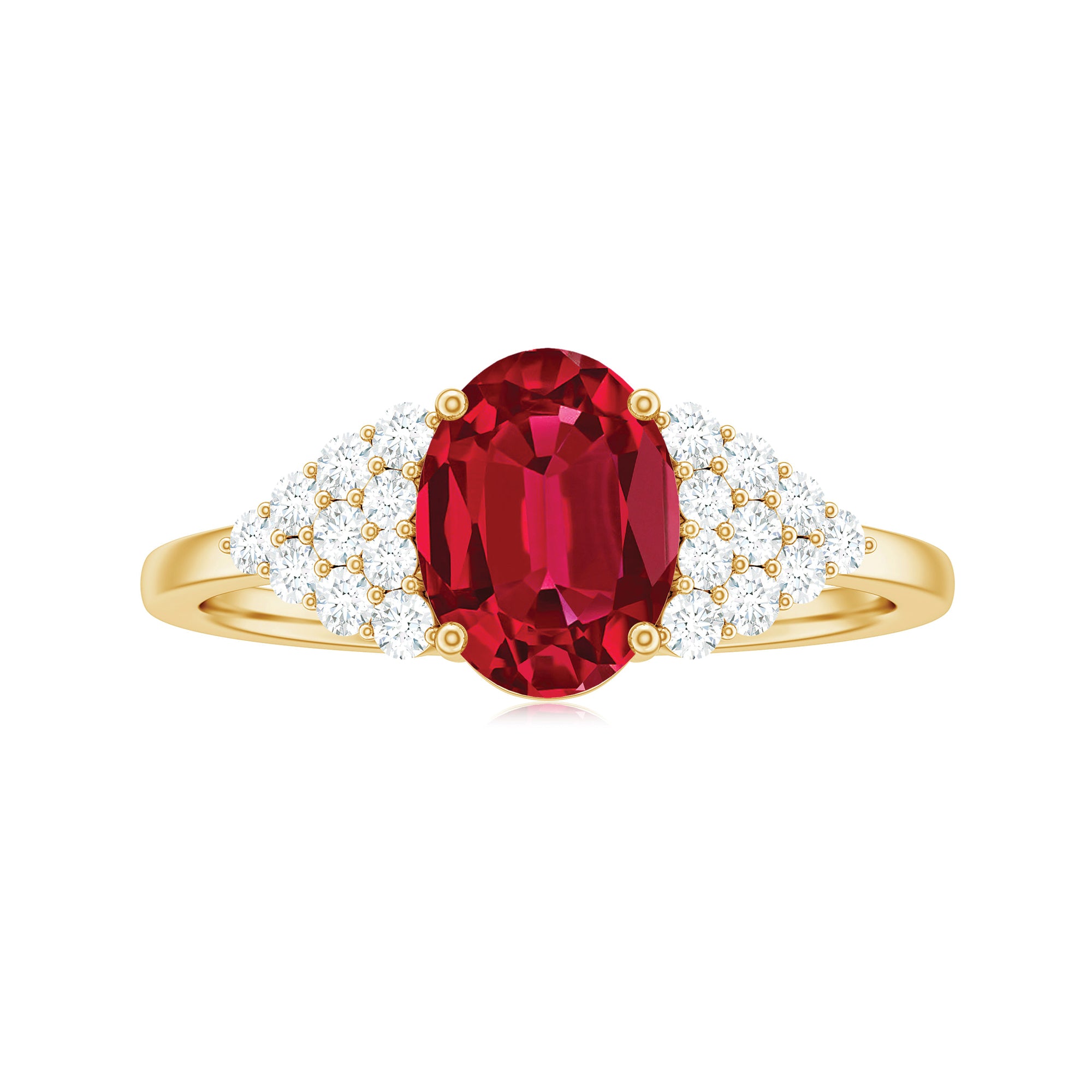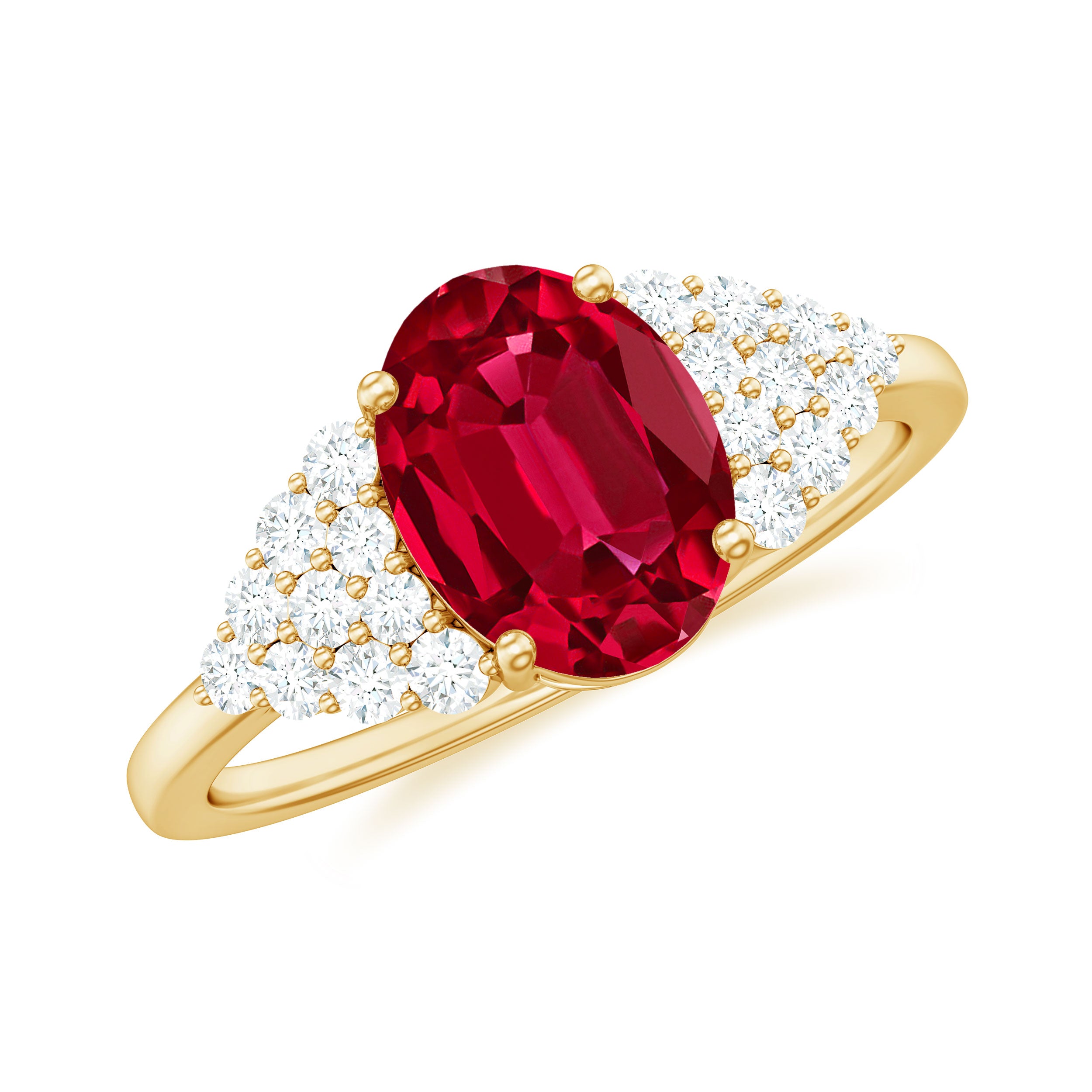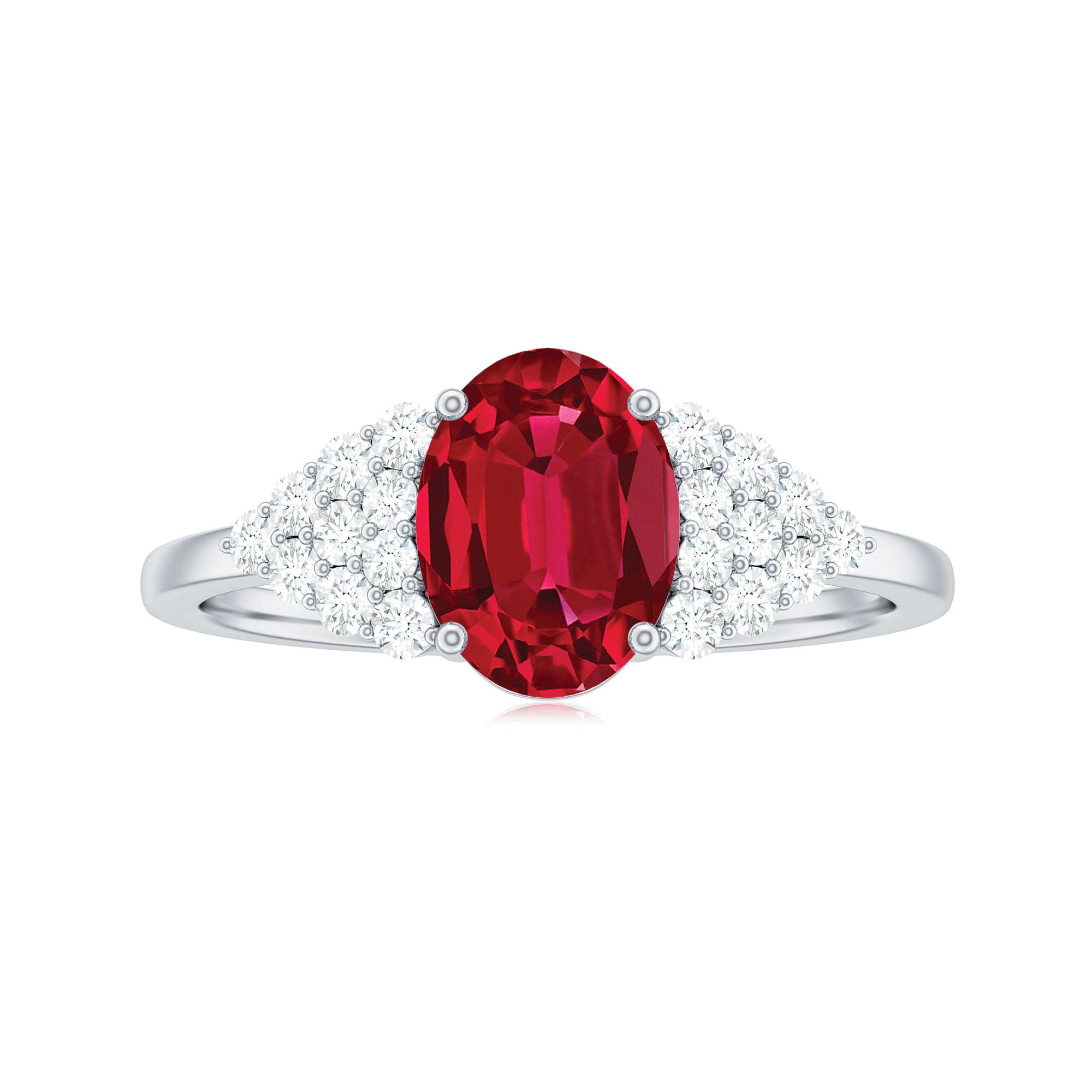 This stunning engagement ring features a gorgeous oval cut created ruby as the centerpiece, with a cluster of round Diamond stones as side stones. A perfect blend of classic elegance and modern glamour.