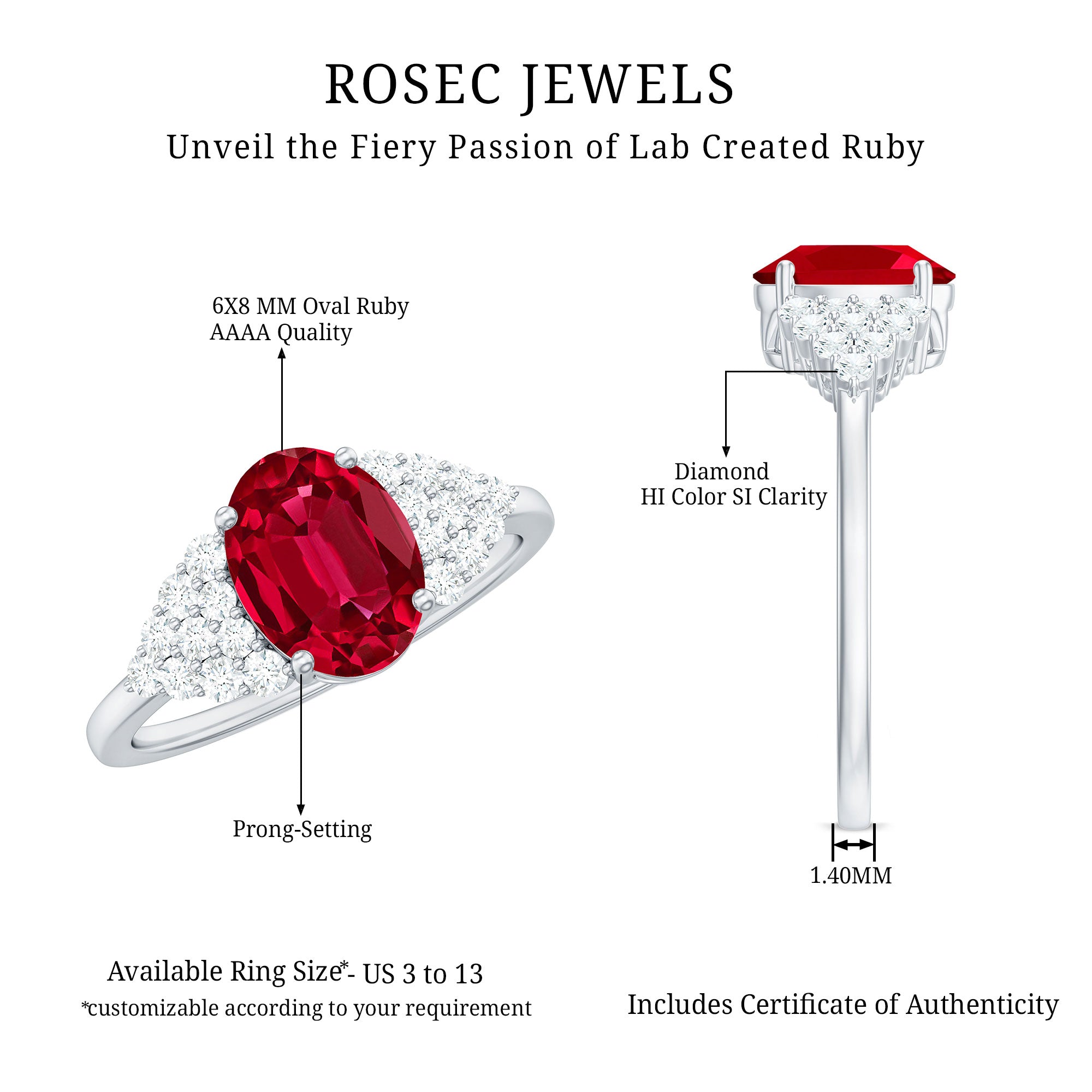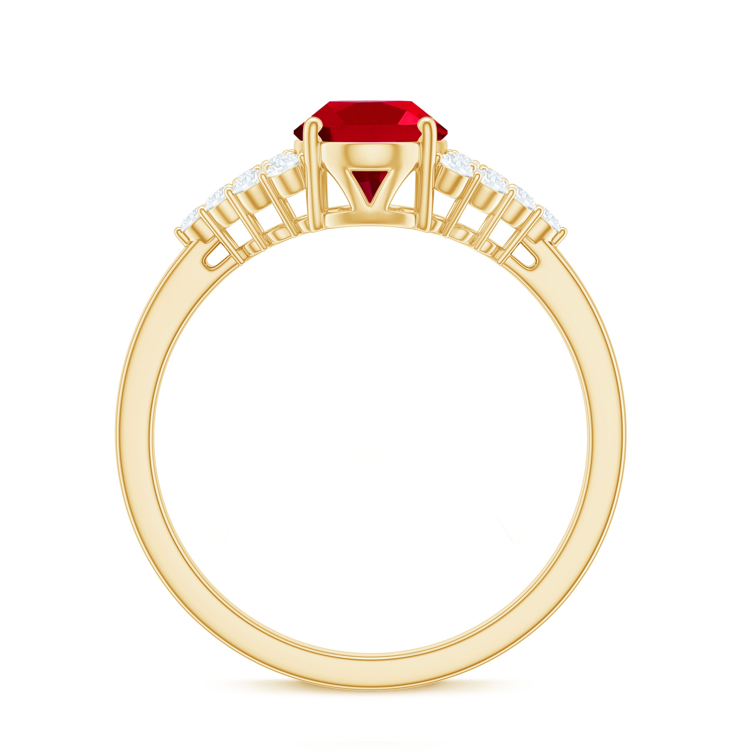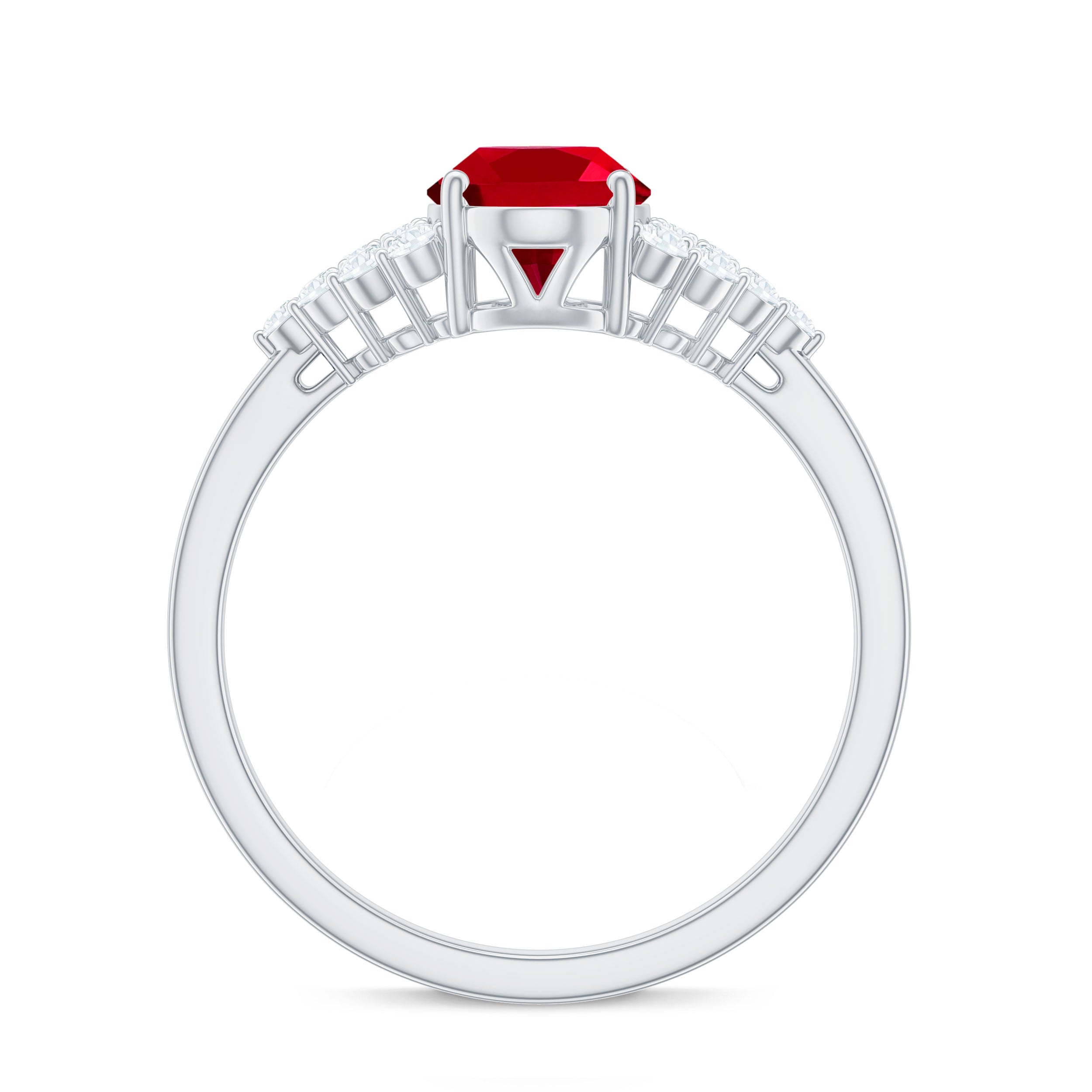 This stunning engagement ring features a gorgeous oval cut created ruby as the centerpiece, with a cluster of round Diamond stones as side stones. A perfect blend of classic elegance and modern glamour.