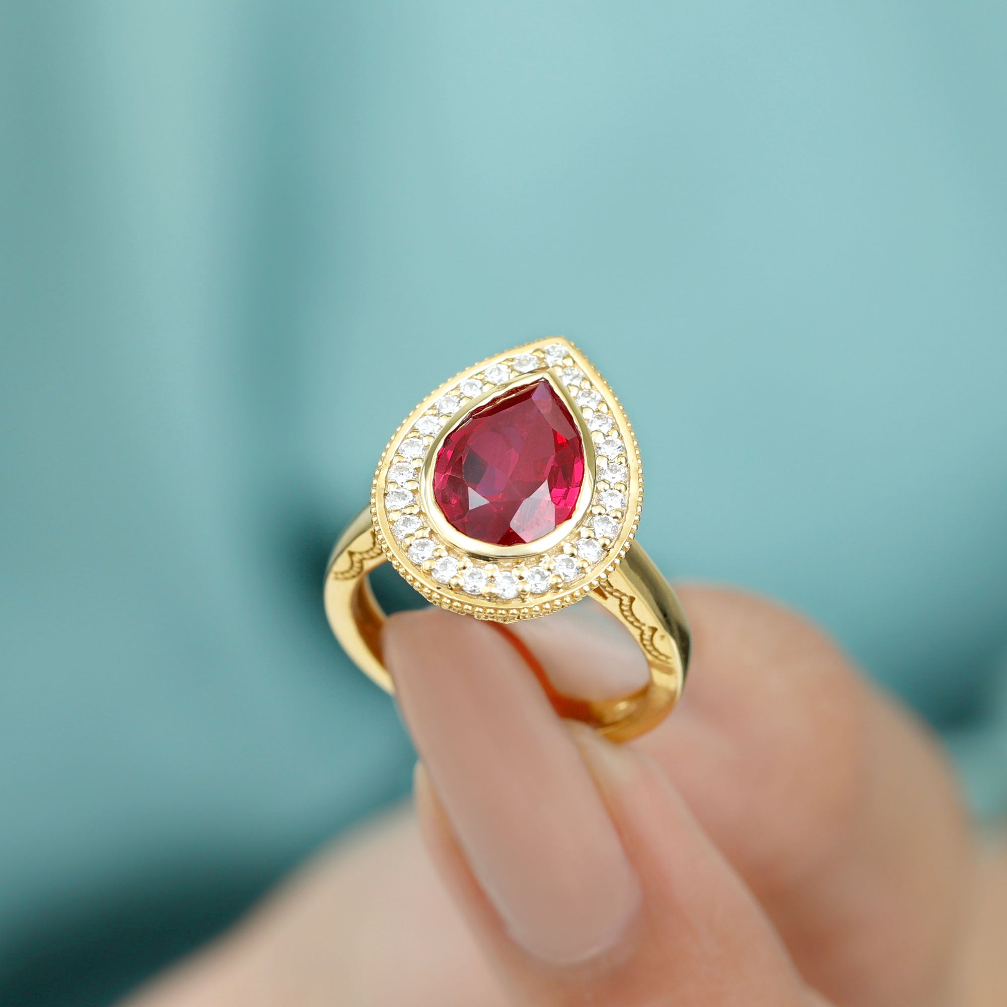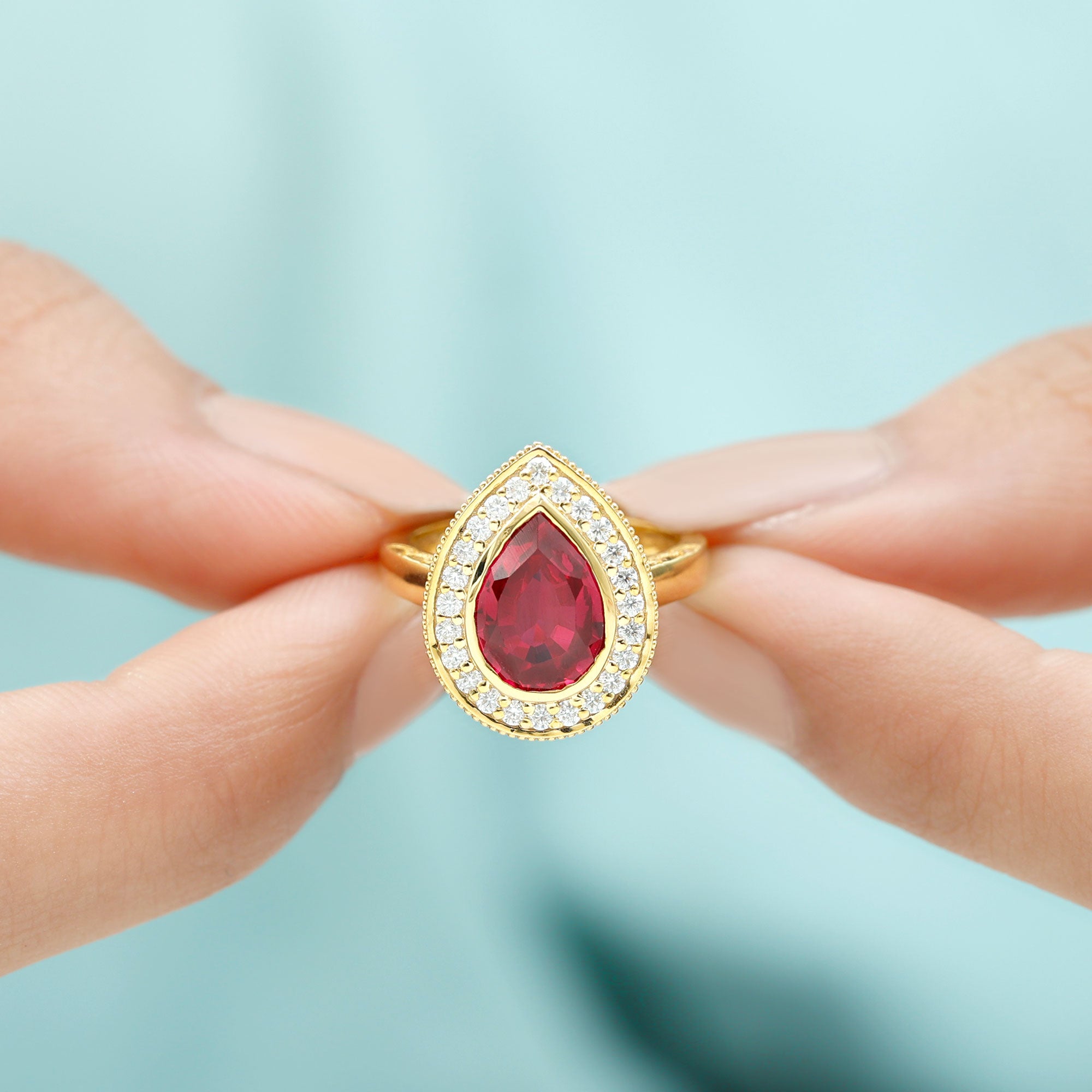 Enhance your Look with this beautiful Solitaire Ring. The Pear Cut Created Ruby as Solitaire in Bezel Setting encircled with Round Shape Diamond stud in Halo. This Ring is Mounted in Solid Gold. Grab This Beautiful Halo Ring for your love as Valentine Gift