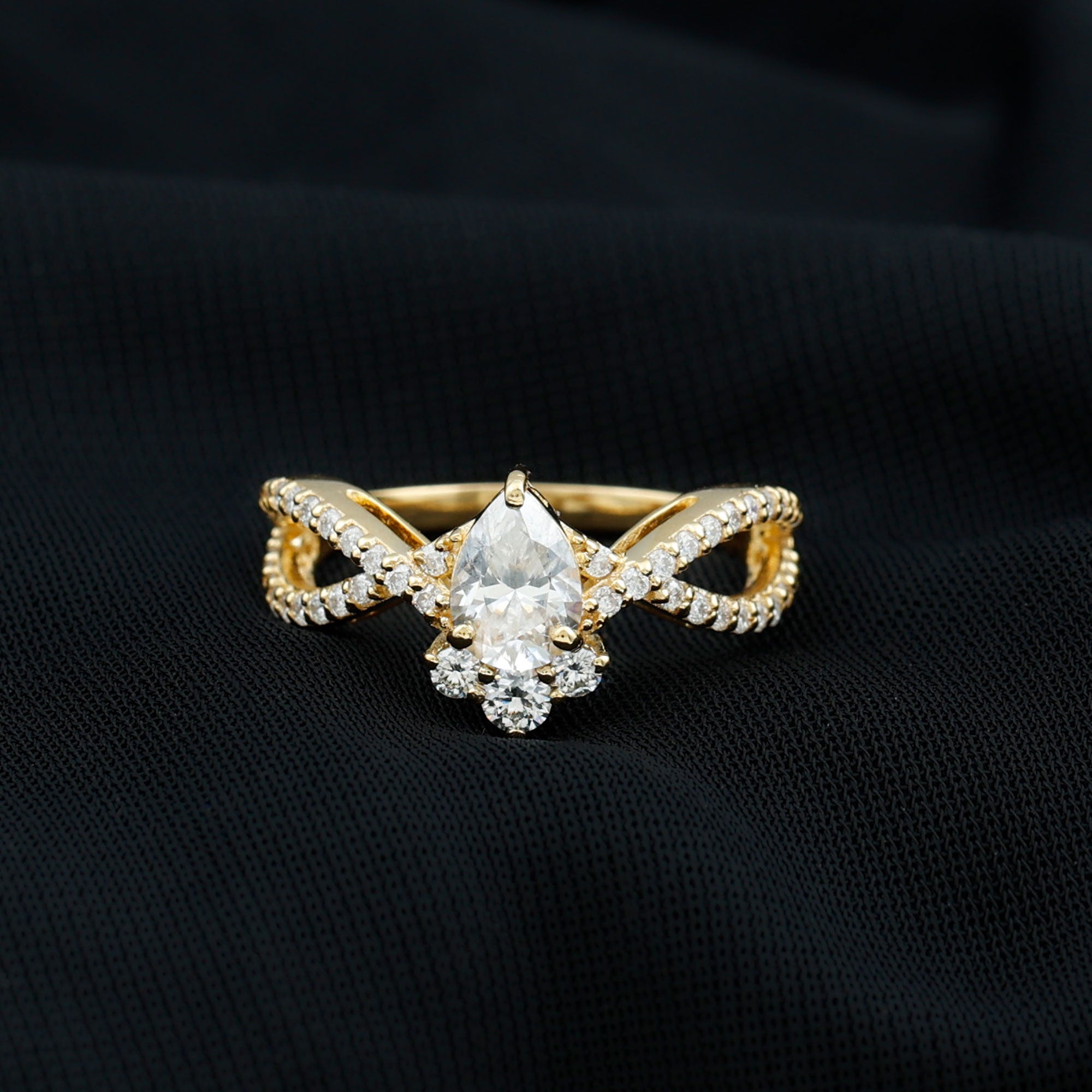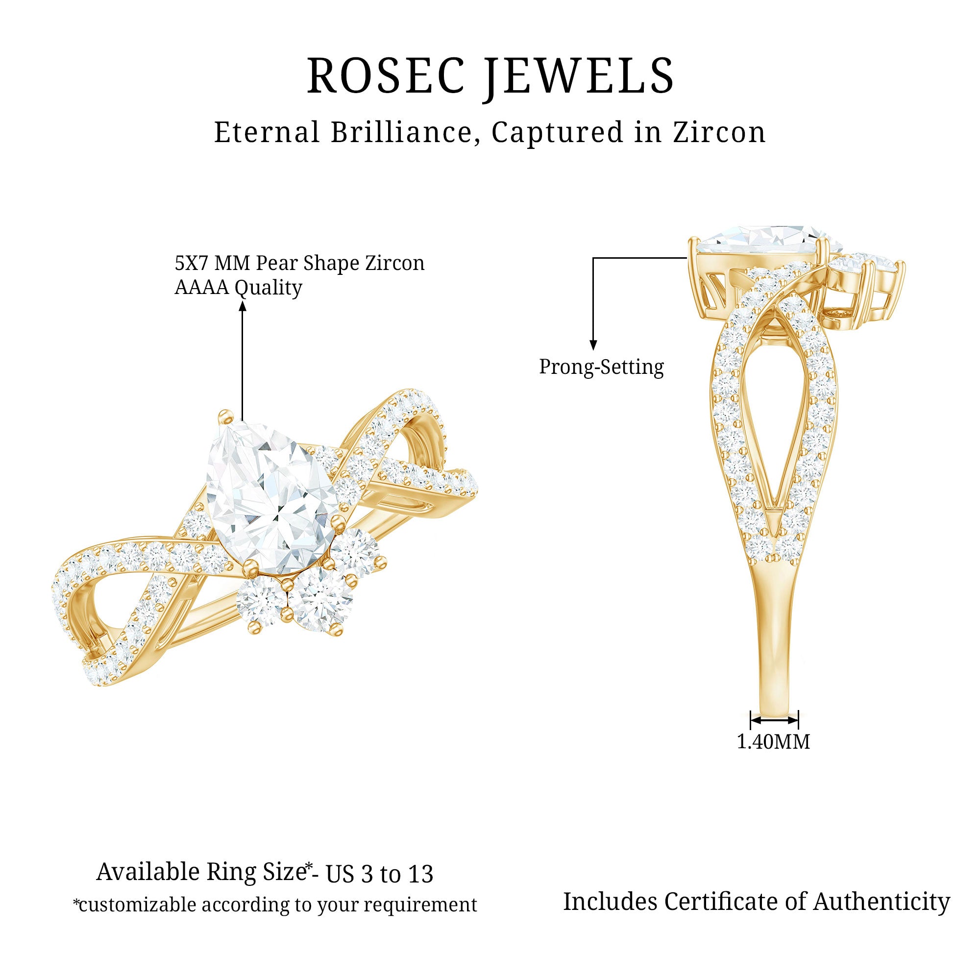 Discover your soul in the form of perfect Crossover Engagement Ring. The Pear Shape Zircon Engagement Ring has intricate design of crossover gold shank, embellished with Round zircon accent, creating a vintage look that has timeless beauty. This Designer Cubic Zirconia Engagement Ring is crafted in gold for a sumptuous appeal.
