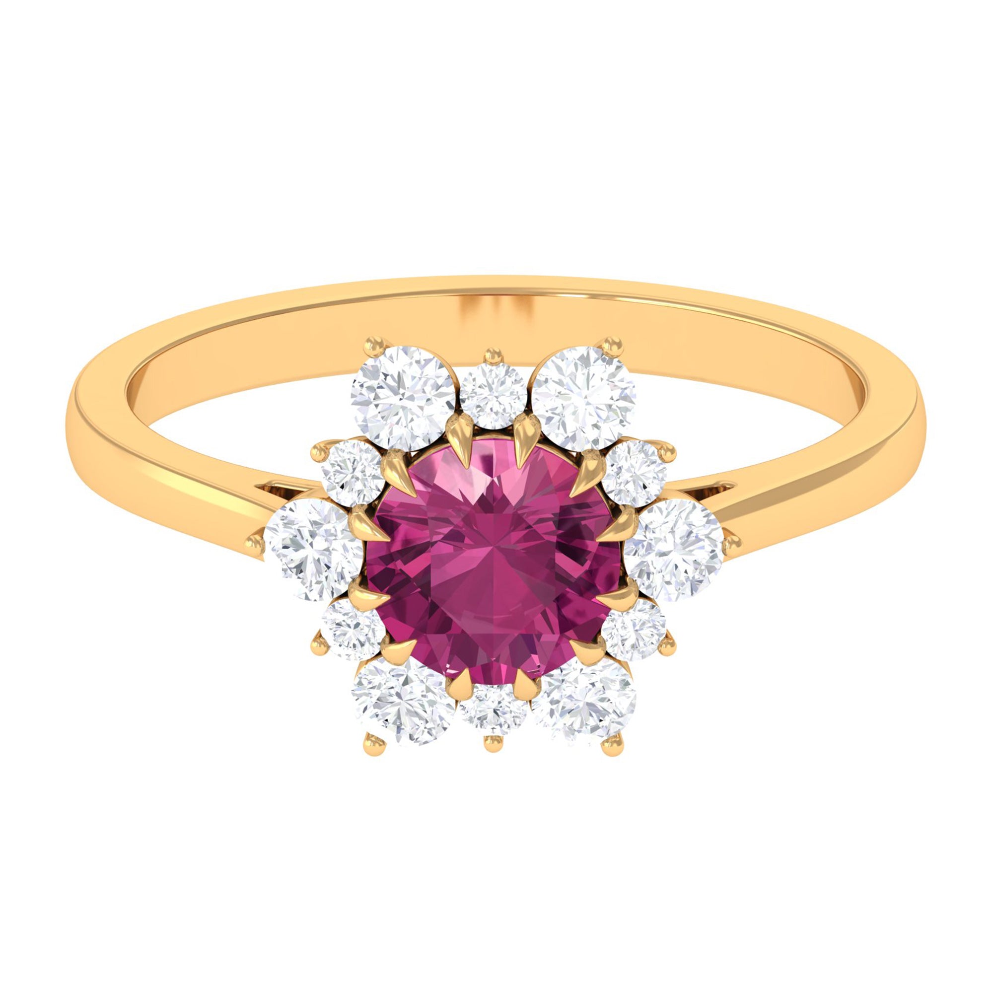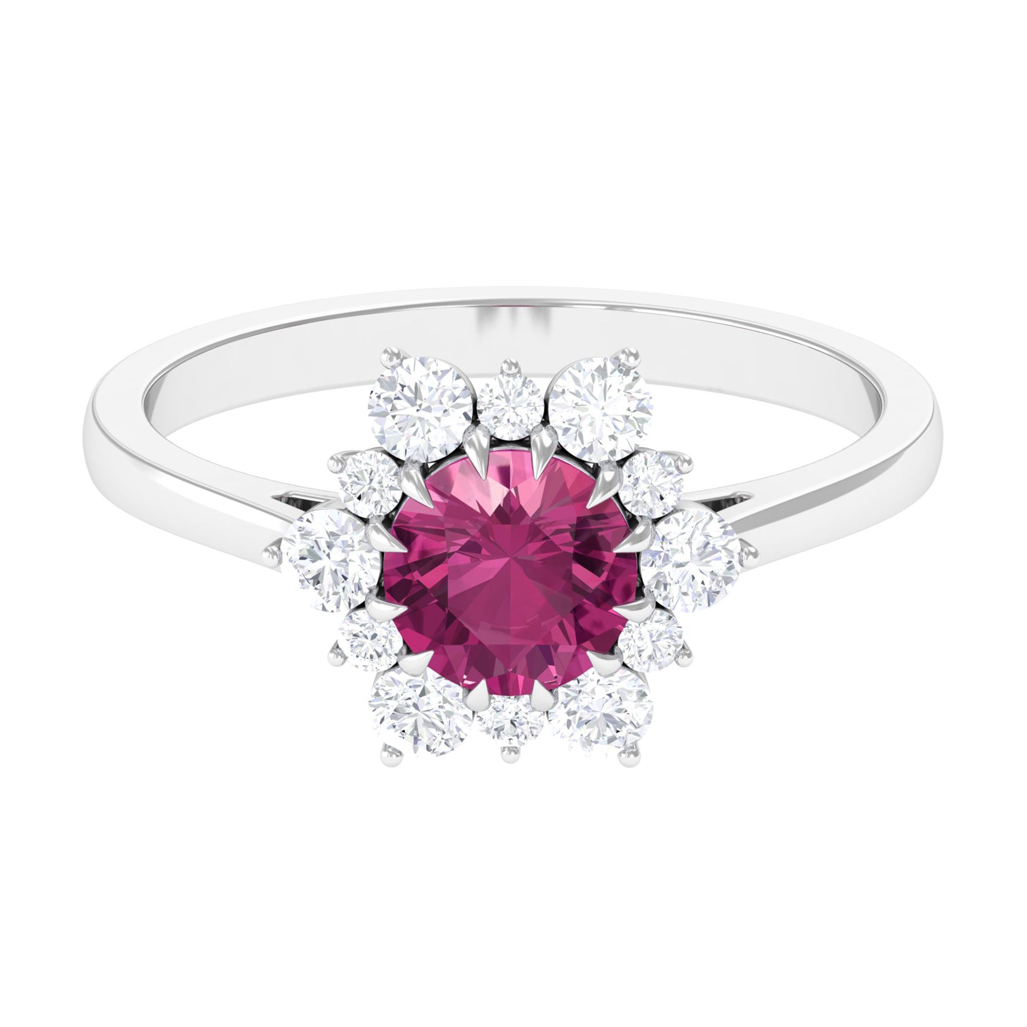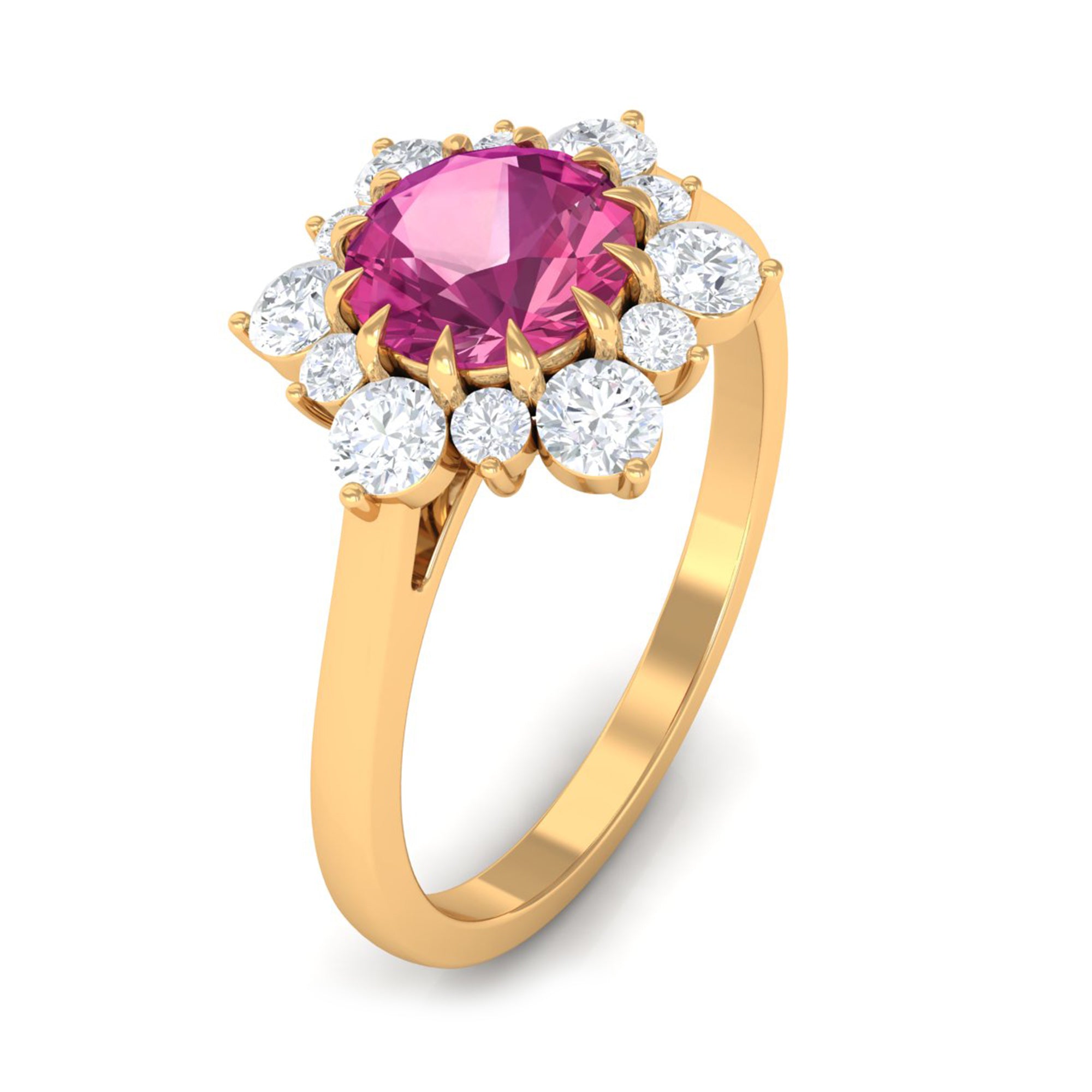 This elegant gold engagement ring for women features a round-cut Pink Tourmaline at its center in a claw setting, surrounded by a dazzling halo of Diamond stones. The stunning Pink Tourmaline and sparkling Diamond combination makes for a truly striking design, perfect for any woman who loves classic, timeless pieces. This Pink Tourmaline engagement ring is a beautiful choice for anyone seeking a stylish and sophisticated way to show their affection and appreciation.