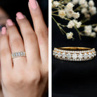 Designed to shine with simple beauty, this Moissanite Band Ring is a lovely reminder of love, joy, and special memories. The Half Eternity Band features round cut moissanite stones set in shared prong setting. Each stone is placed carefully to reflect light from every angle, creating a gentle shimmer that catches the eye without being too bold. Adding extra sparkle, smaller moissanite stones are set along the edges, giving the Wedding Anniversary Band a rich and textured appearance. The D-VS1 quality moissanites shine brightly and add a fresh glow to the design. This Moissanite Wedding Band beautifully blends modern style with classic charm, making it an easy match with engagement rings or perfect to wear on its own. The smooth finish and rounded edges make it very comfortable to wear all day long, while the even sparkle gives it an elegant feel. Designed to fit easily into any look, this Moissanite Eternity Band brings the right amount of shine to both casual and formal occasions. Whether it is a wedding band, anniversary ring, or a simple gift of love, this piece is a meaningful symbol of lasting connection.