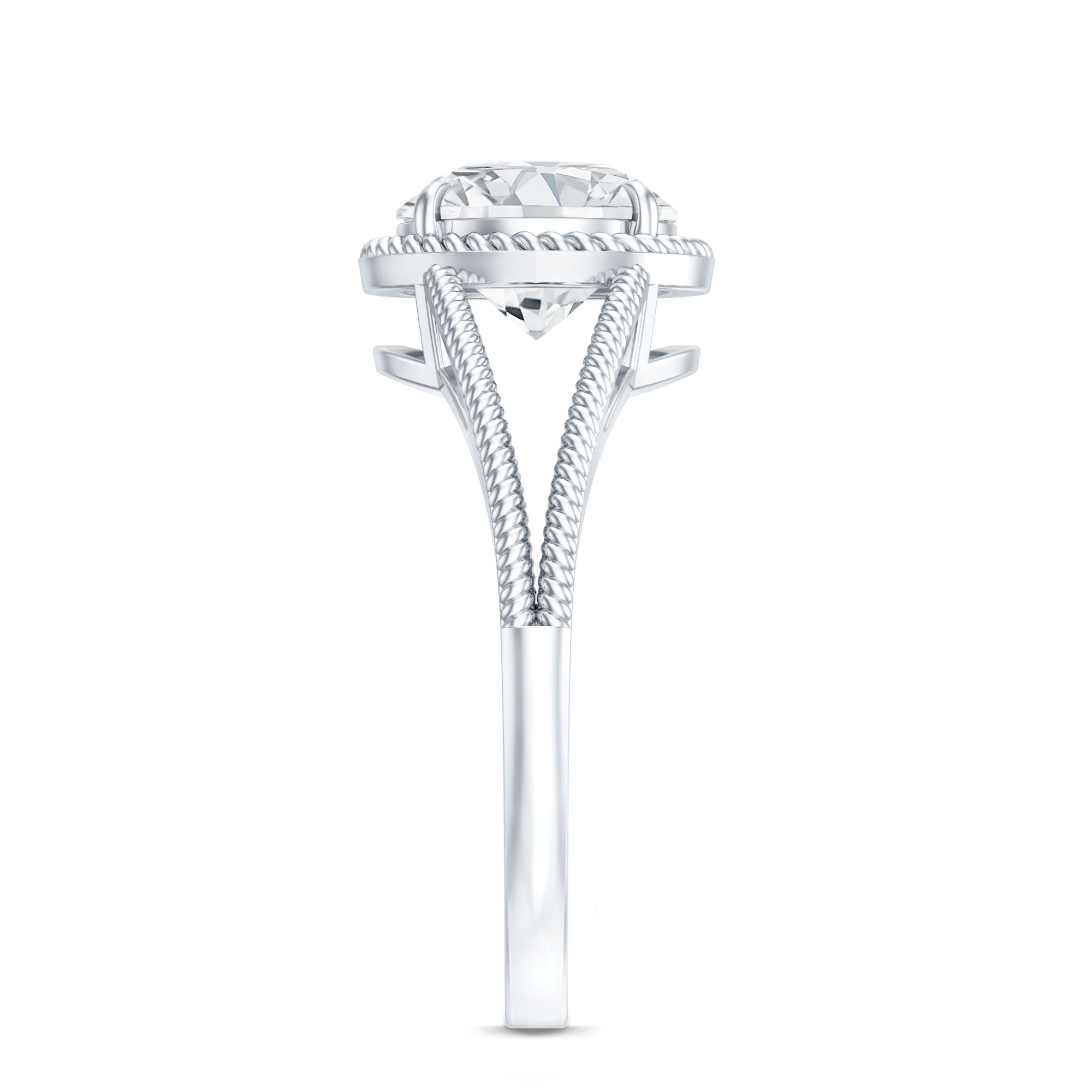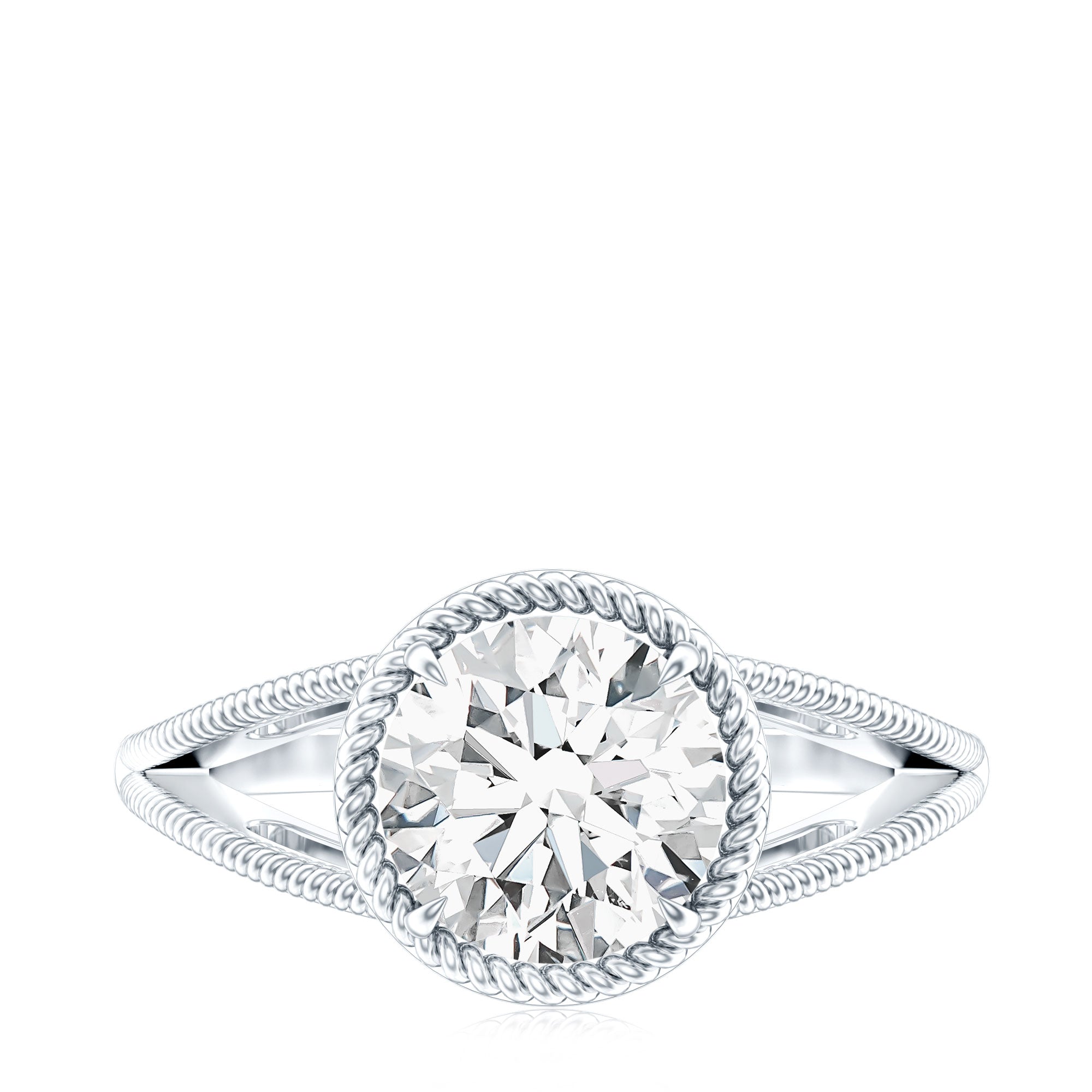 Celebrate your special day with an engagement ring that boasts both elegance and trendiness - the Split Shank Engagement Ring. Featuring a sparkling Round Shape Moissanite solitaire set in a claw setting, this ring is further adorned with a complementing twisted rope frame made of solid gold. The result is a beautifully crafted moissanite engagement ring that is both aesthetically pleasing and perfect for your engagement.