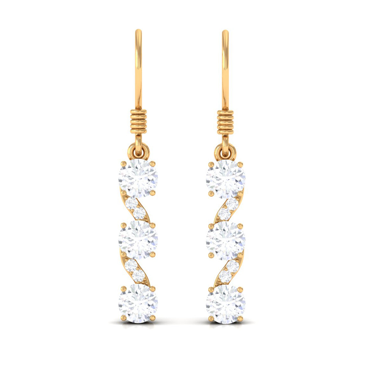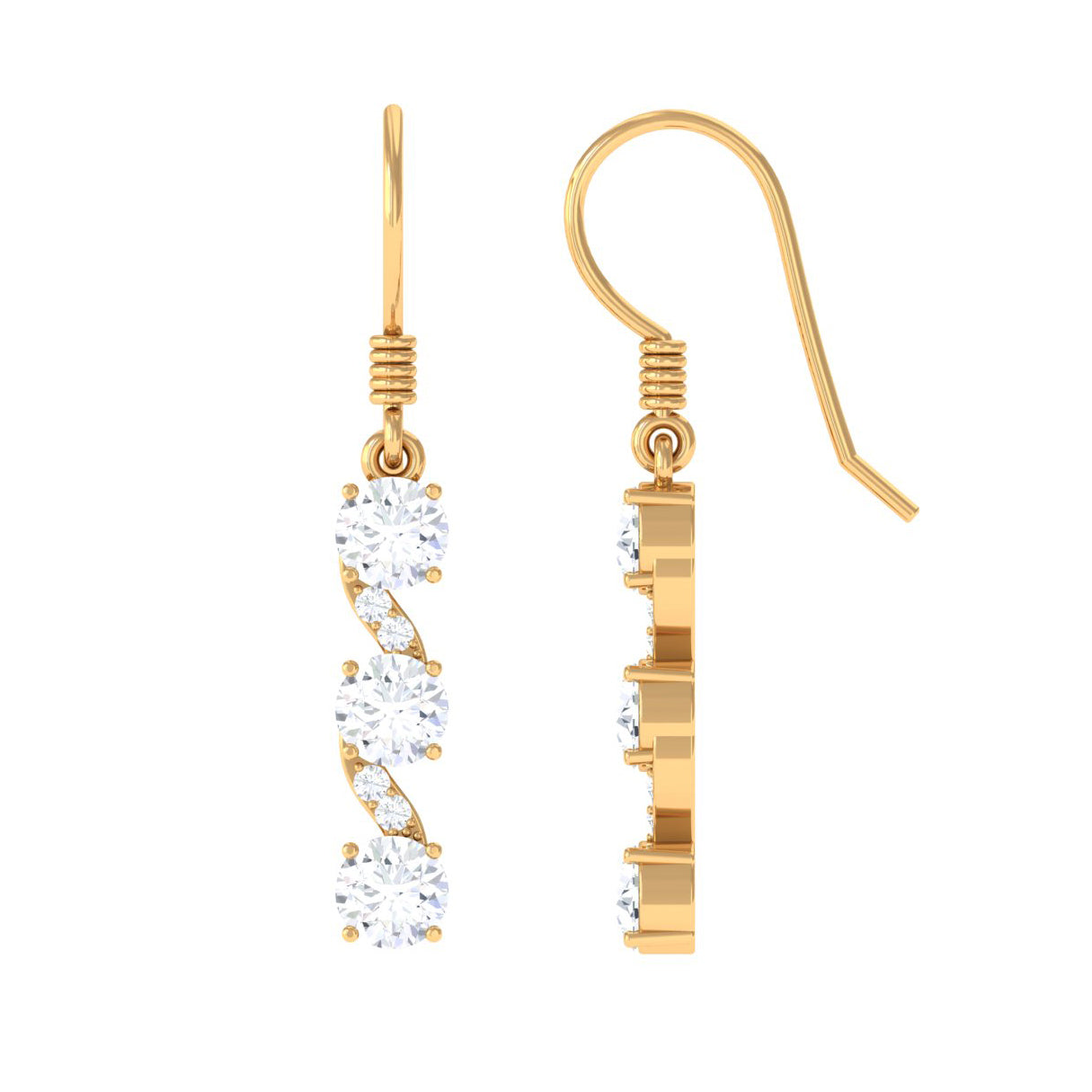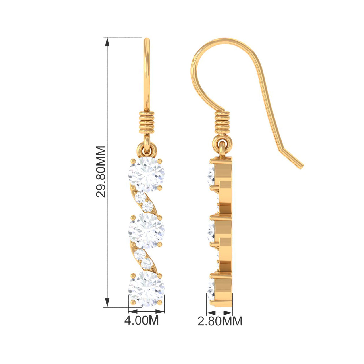 Elevate your style with round Moissanite three stone dangle drop earrings. A captivating design that combines sophistication and brilliance.