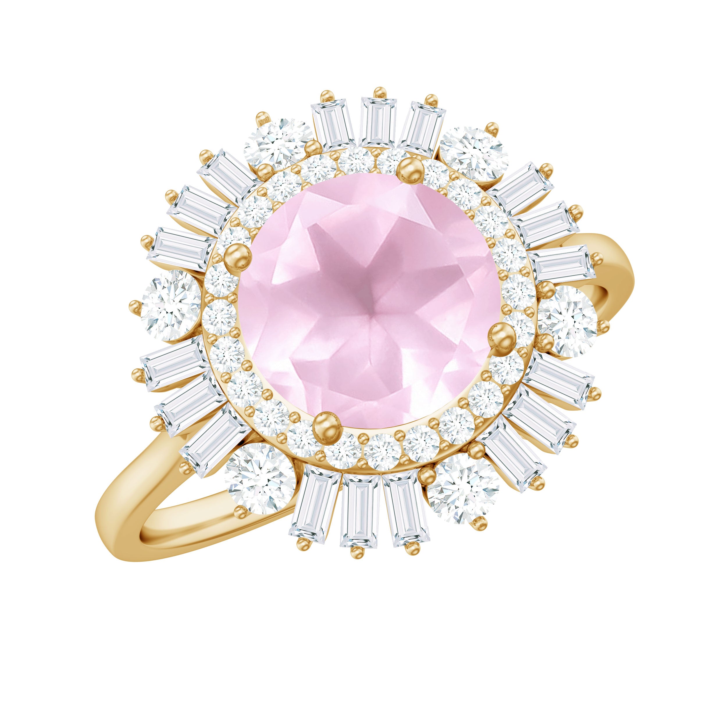Add a touch of elegance to any outfit with this beautiful cocktail ring featuring a round rose quartz center stone in prong setting, surrounded by a double halo of sparkling baguette and round shape moissanite stones. The soft pink hue of the rose quartz, combined with the brilliance and fire of the moissanite stones, creates a feminine and elegant look that is perfect for a special occasion or everyday wear. This ring is a beautiful addition to any jewelry collection, and its versatility makes it a great gift for any woman who loves delicate and romantic pieces.