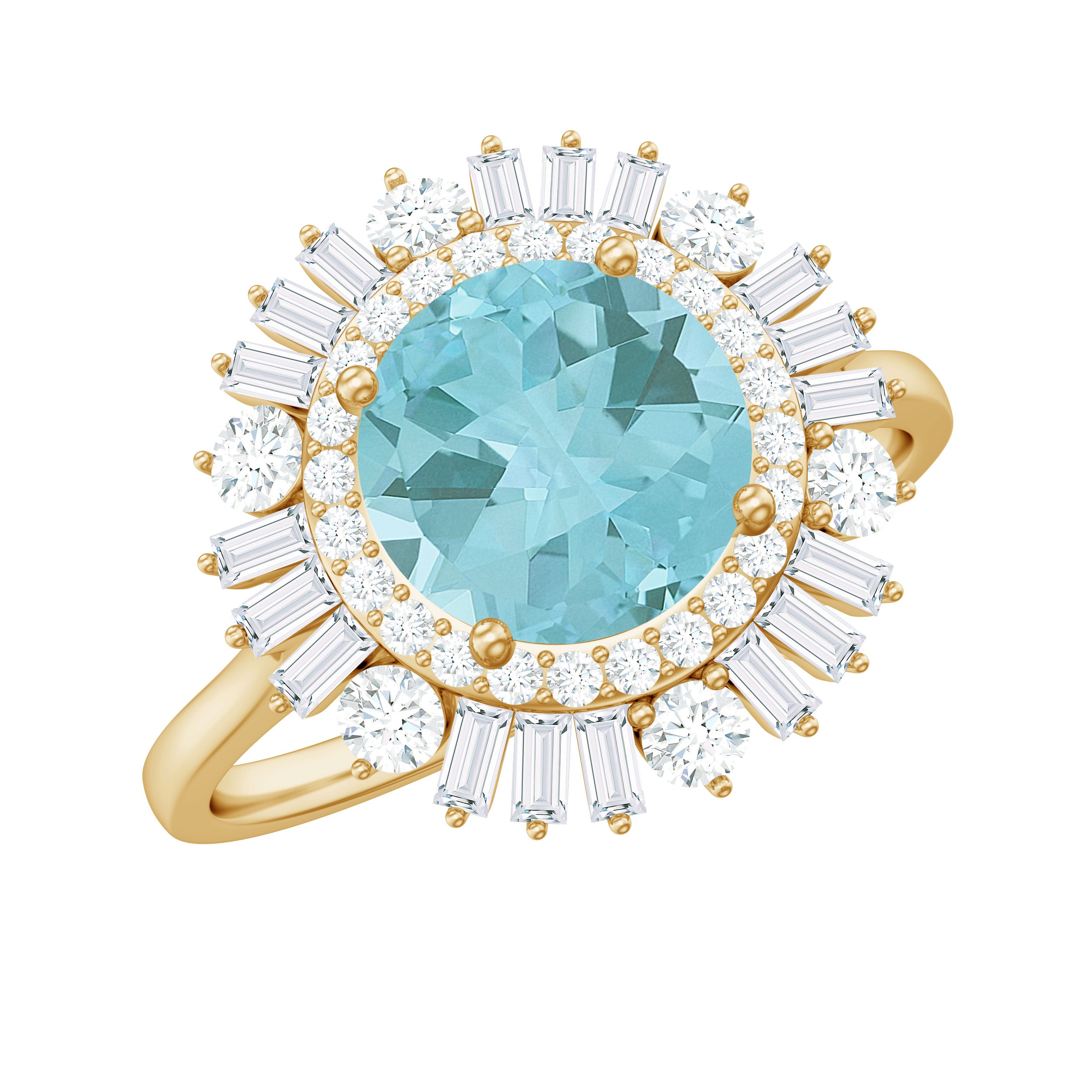 A perfect ring is a more precise ways to express emotions to your better half. This beautiful ring will make her feel on cloud nine, the Sky Blue Topaz Engagement Ring effortlessly draws your attention. This ring is embellished with Round Sky Blue Topaz in center surrounded with Round and Baguette Cut Moissanite Halo, creating a glistening appeal. This Ring is excellent choice for Cocktail Engagement jewelry.