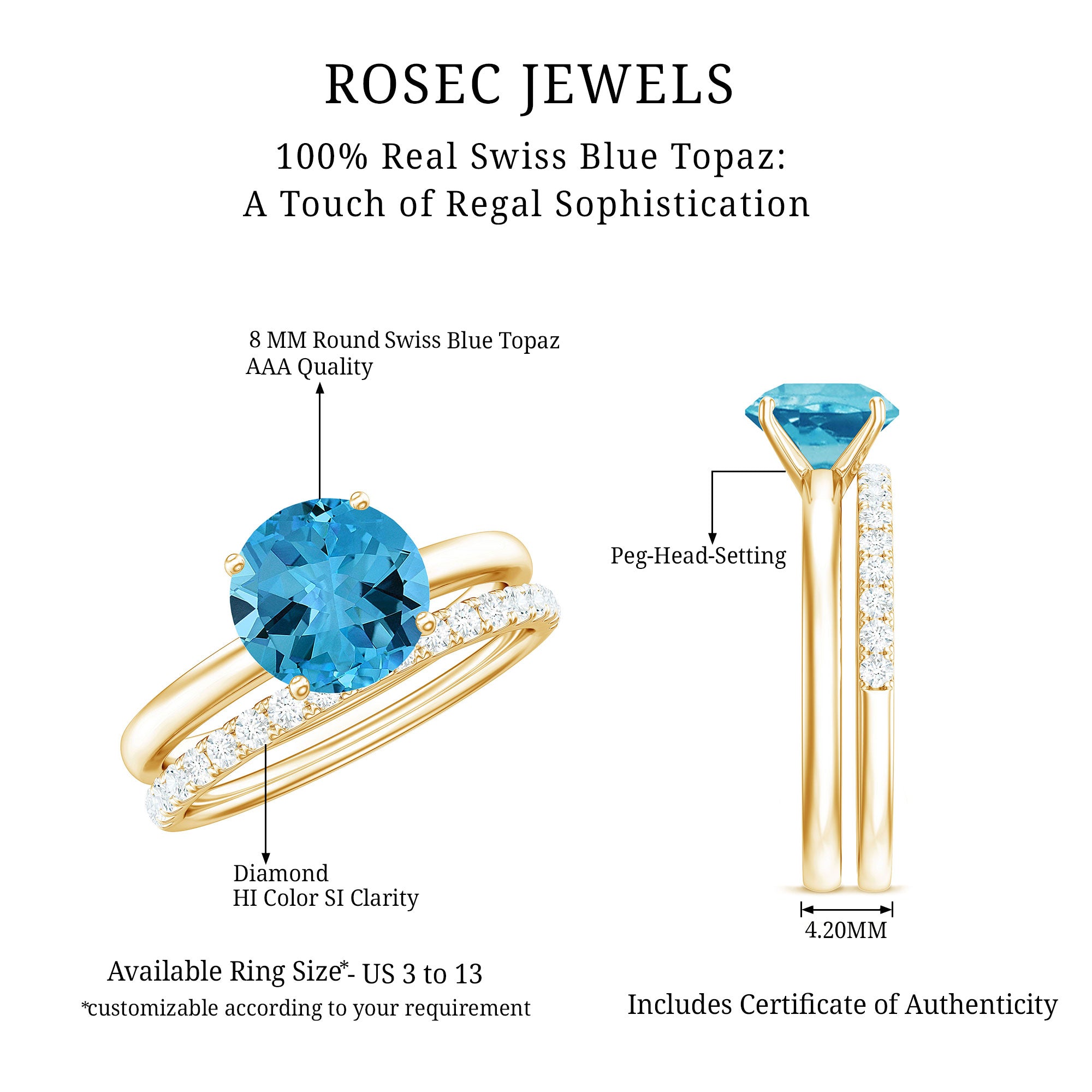 Shine like a diva on your special day by wearing this elegant Swiss Blue Topaz and Diamond Bridal Ring Set. Swiss Blue Topaz - Brilliant Cut Swiss Blue Topaz Gemstone exhibits AAA Quality and possess vibrant color. Semi-Precious December Birthstone summons prosperity and wealth. It is Natural and Certified, helps in bringing abundance, joy, and perfection to the wearer. Its Durability and Luster is enhanced by Heat and Irradiated Treatment, to further make it a captivating and desirable gem. Diamond - HI-SI Quality exhibited by Brilliant Cut Diamond give justice to its incredible value. Diamond summons beauty, attractiveness and unbreakable love. It is Certified and helps in bringing success and luxury to the wearer. Its Durability and Luster is enhanced by Lab Created Treatment, to further make it a captivating and desirable gem.