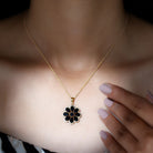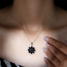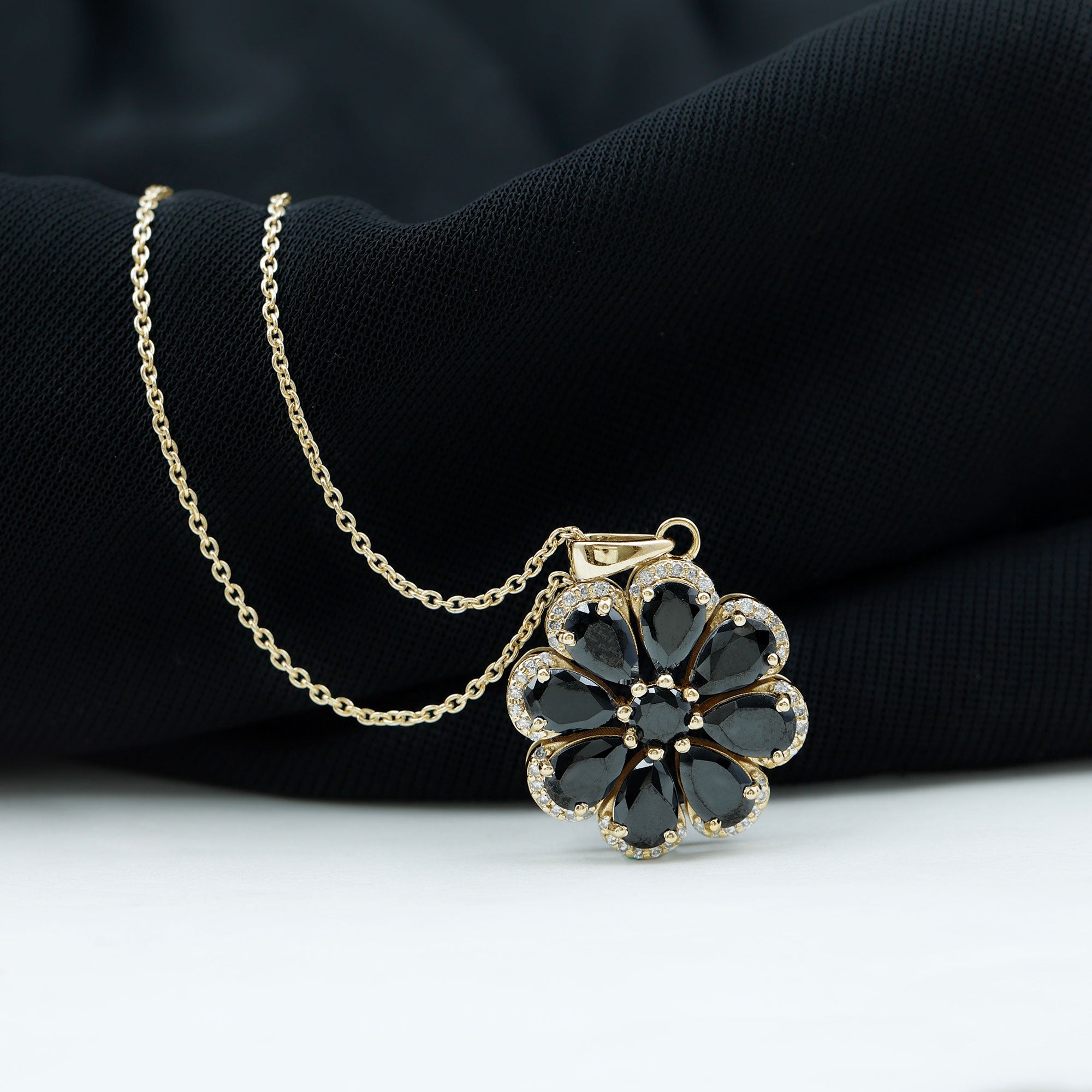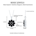 Rosec Jewels Black Spinel Flower Necklace is a striking blend of elegance and modern design. The pendant features a round black spinel at the center, creating a bold and captivating focal point. Surrounding it are pear shaped black spinel stones arranged like flower petals, giving the design a graceful and artistic look. A delicate halo of sparkling round moissanite stones frames the floral shape, adding a gentle glow and enhancing the contrast against the deep black spinel. Carefully crafted with attention to detail, this Black and White Pendant is designed to be both stylish and meaningful. The combination of AAA quality black spinel and D-VS1 quality moissanite results in a necklace that feels luxurious yet easy to wear. Suspended from a chain, the Black Spinel Pendant Necklace rests beautifully along the neckline. Its balanced design makes it perfect for everyday wear, while the bold color and sparkle make it equally suitable for special occasions. This Floral Pendant adds a touch of sophistication, confidence, and timeless charm to any jewelry collection.