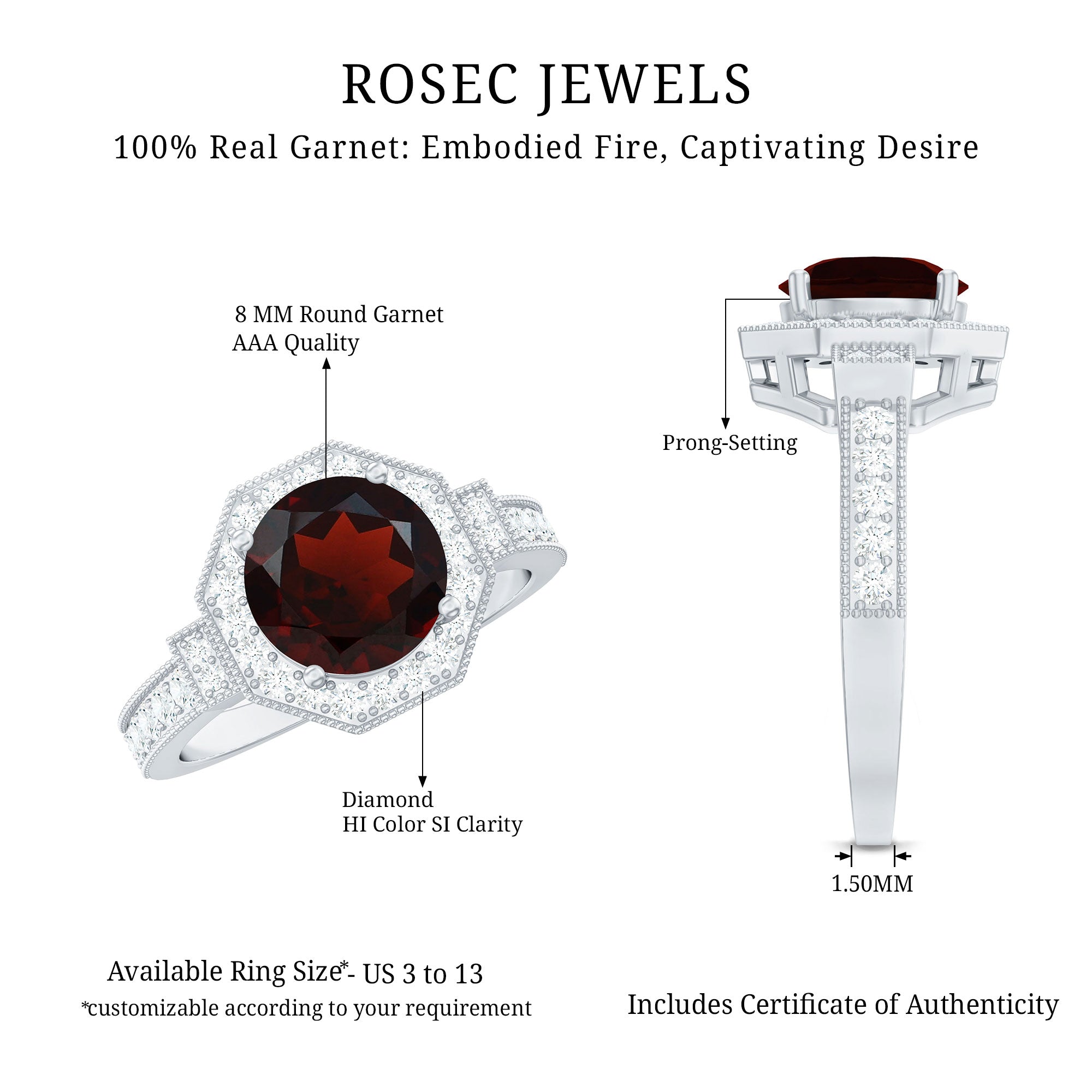 Surprise her with this breathtaking Art Deco Engagement Ring, a piece that brings together bold elegance and romantic charm in the most unforgettable way. This Fine Engagement Ring features a stunning 8 mm Round Shape Garnet set in Prong Setting, glowing with a deep, rich red that feels full of passion and meaning. Surrounding the center stone is a dazzling Diamond Halo set in a geometric pattern that shimmers beautifully with every movement, creating a glow that feels almost magical. Sparkling Side Stones add extra brilliance, while the delicate Beaded Detailing along the band gives the entire design that Art Deco flair, stylish, timeless and wonderfully unique. Every curve and sparkle of this Garnet Engagement Ring is crafted to honor the love you share. Available in various ring sizes, this Halo Engagement Ring with Garnet offers a comfortable, meaningful fit for the woman who captures your heart. This Garnet and Diamond Ring is a dazzling expression of the future you are ready to create together.