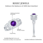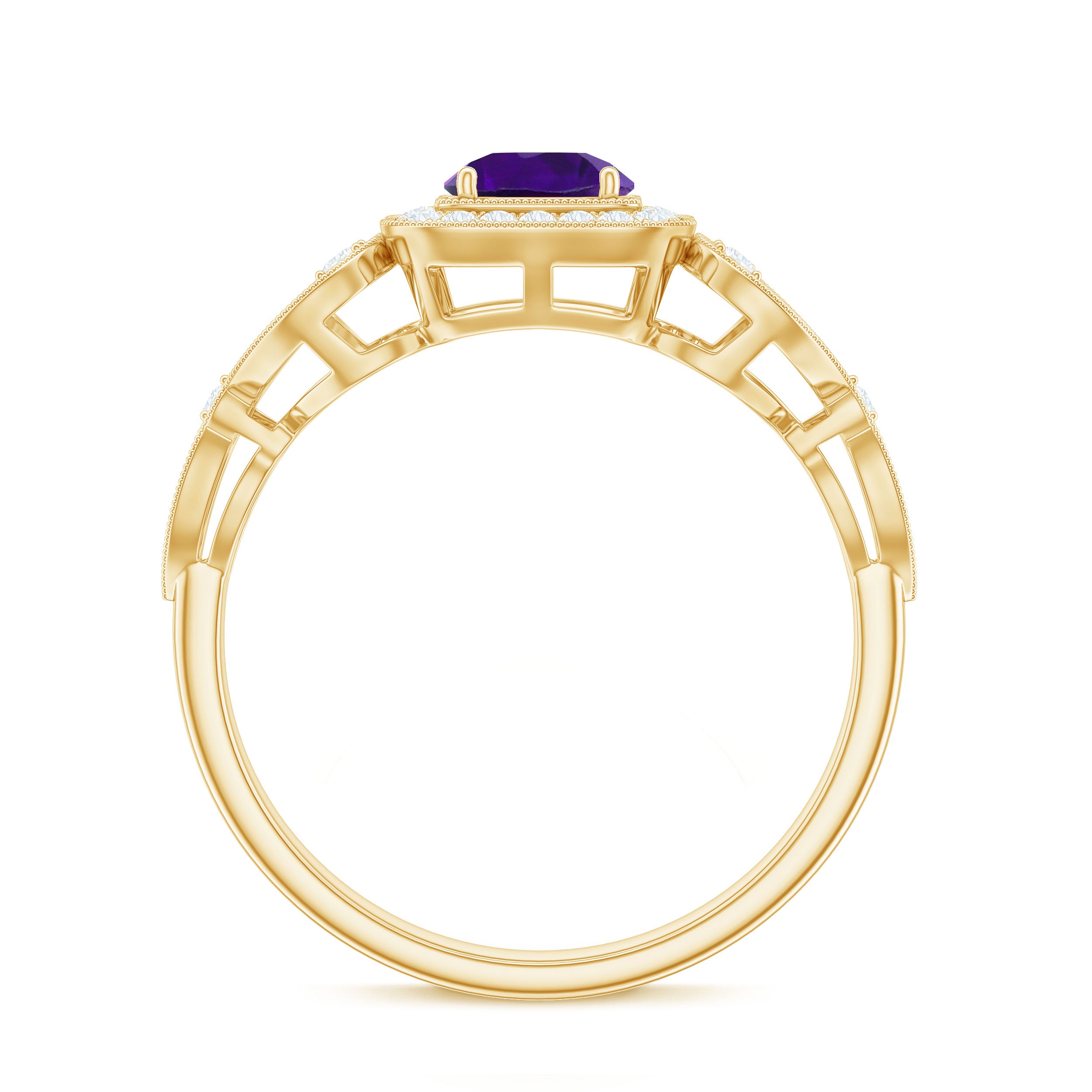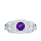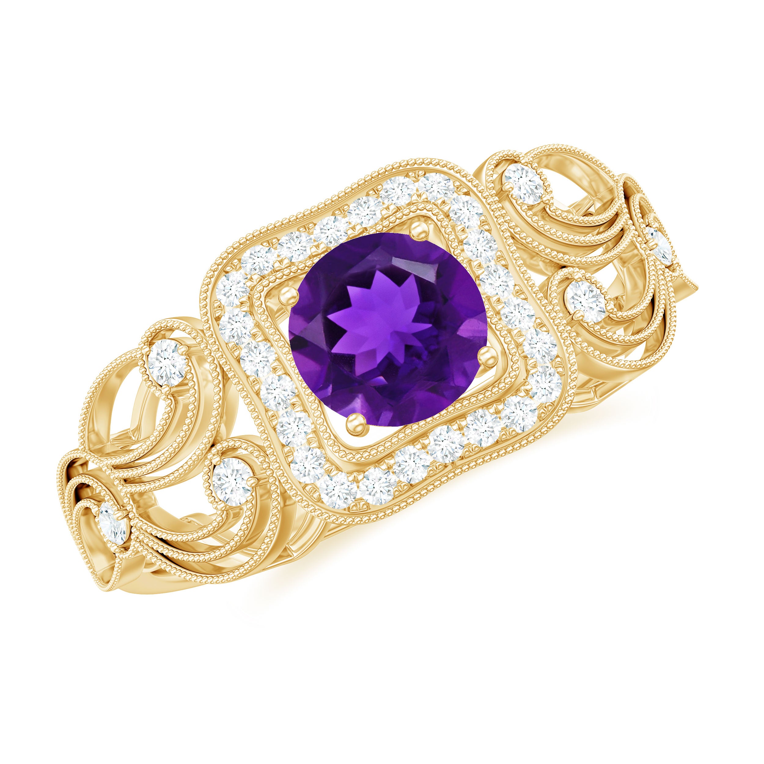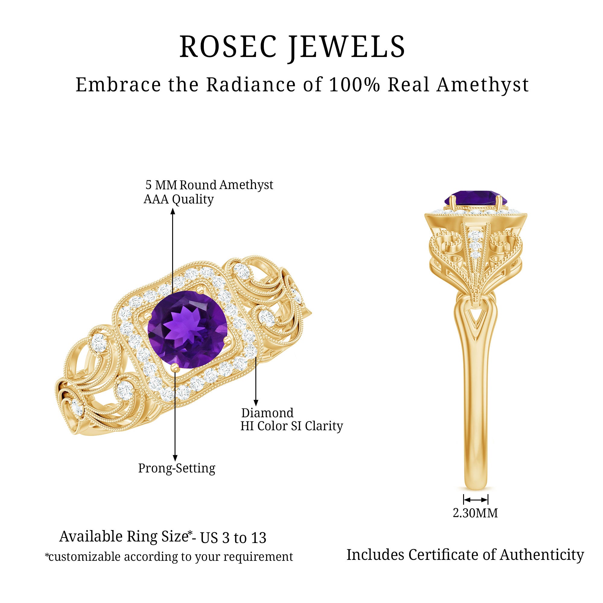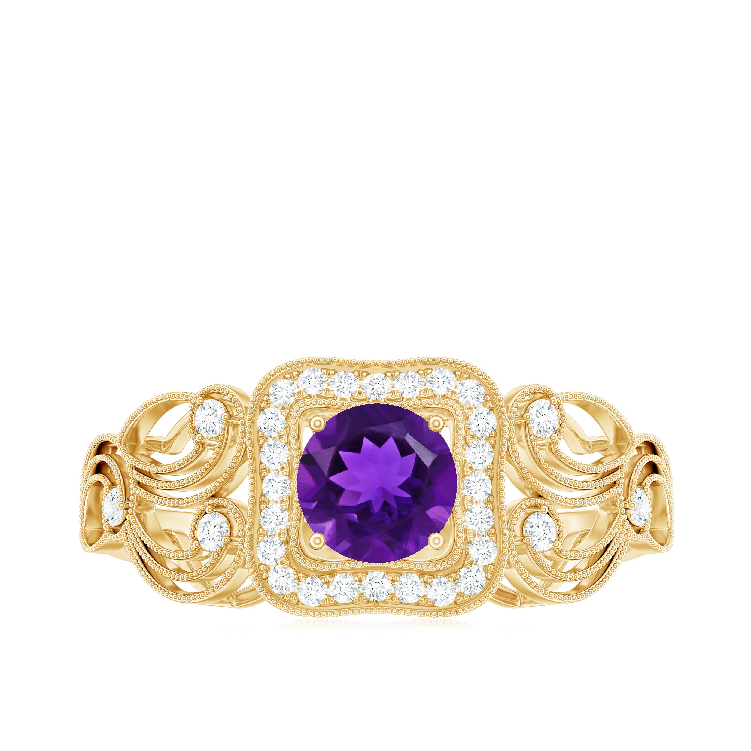 Unique Art Deco Engagement Ring is the beautiful vintage jewelry encrusted with Round Shape Amethyst in the center with Round Shape Diamond are set in a Halo. Milgrain floral design set with Diamond magnifies the piece. Art Deco Engagement Ring is mounted in Solid Gold.