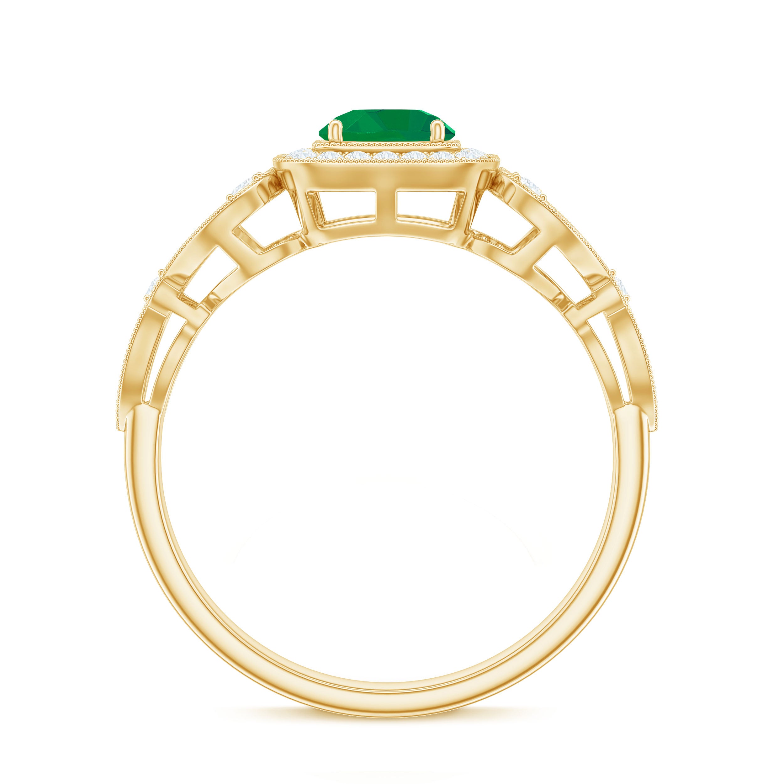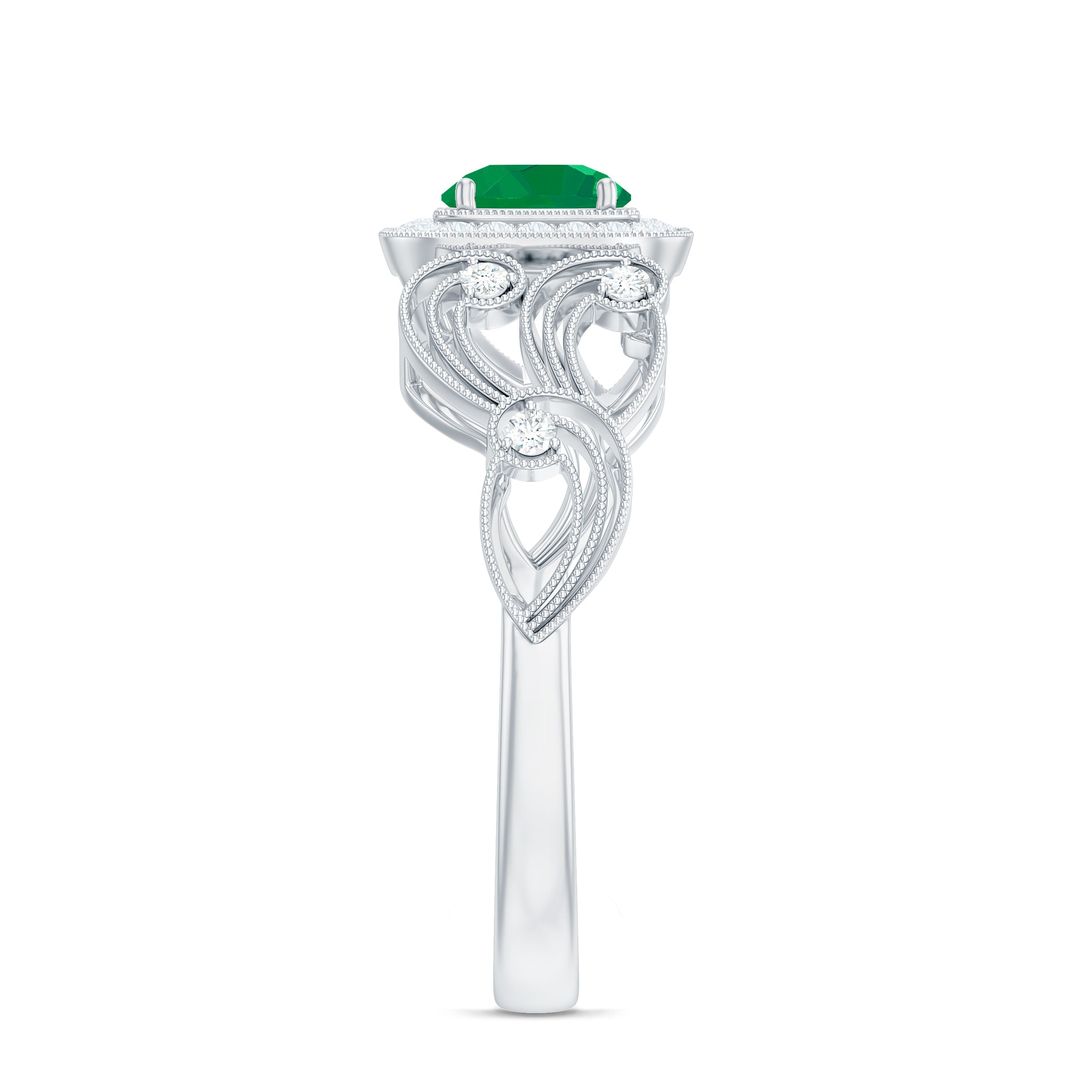 Bring the old-world charm to your modern love story with this enchanting Vintage Looking Engagement Ring, a masterpiece that beautifully bridges timeless romance and elegance. At its center lies a vivid 5 mm Round Shape Emerald set in Prong Setting, glowing with deep green brilliance, a gemstone long cherished as a symbol of hope, harmony and eternal love. Surrounding it, a Halo of sparkling Diamond stones enhances its radiant allure, while the Beaded Detailing and dainty Diamond stones along the band add an irresistible touch of vintage sophistication. Perfect for the woman who treasures classic beauty with a hint of nostalgia, this Emerald Diamond Engagement Ring captures the essence of forever in its intricate design. Whether it marks a promise, a proposal or a cherished milestone, this Halo Engagement Ring with Emerald is destined to become a keepsake passed through generations. Presented in an elegant jewelry box and available in various sizes, this exquisite Emerald Engagement Ring is ready to gift, a symbol of love that transcends time.