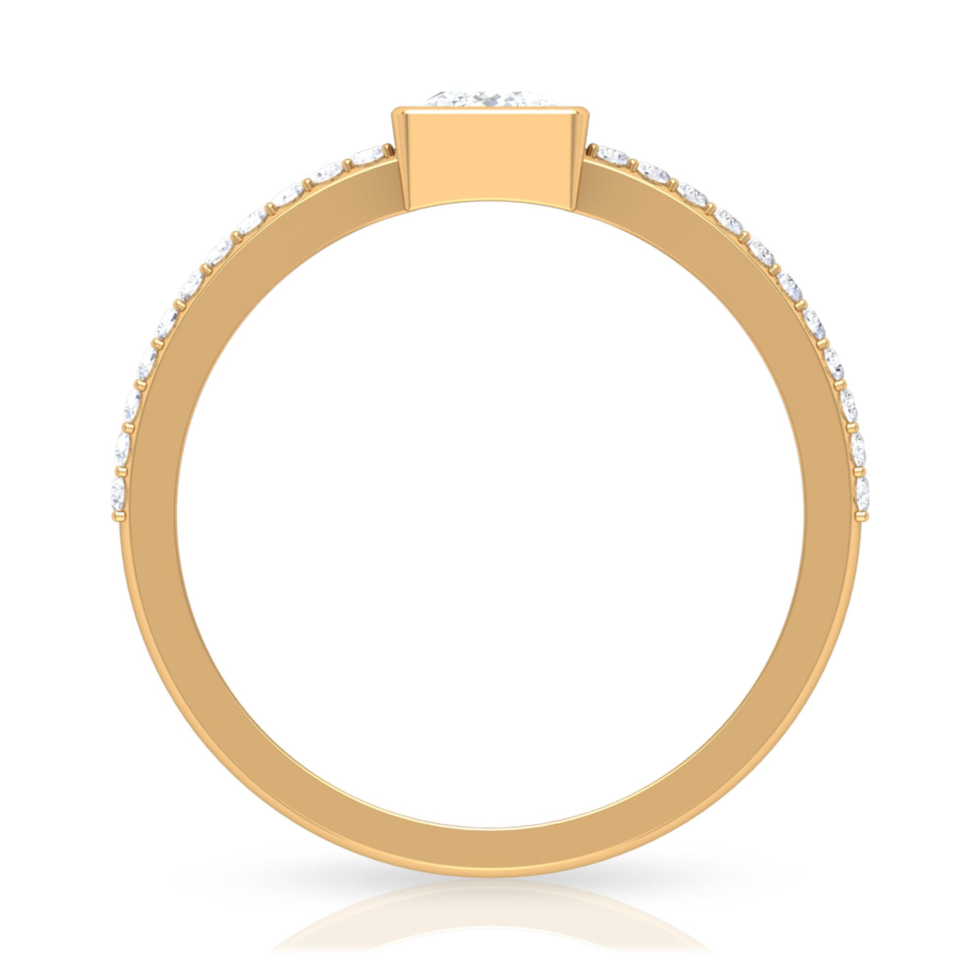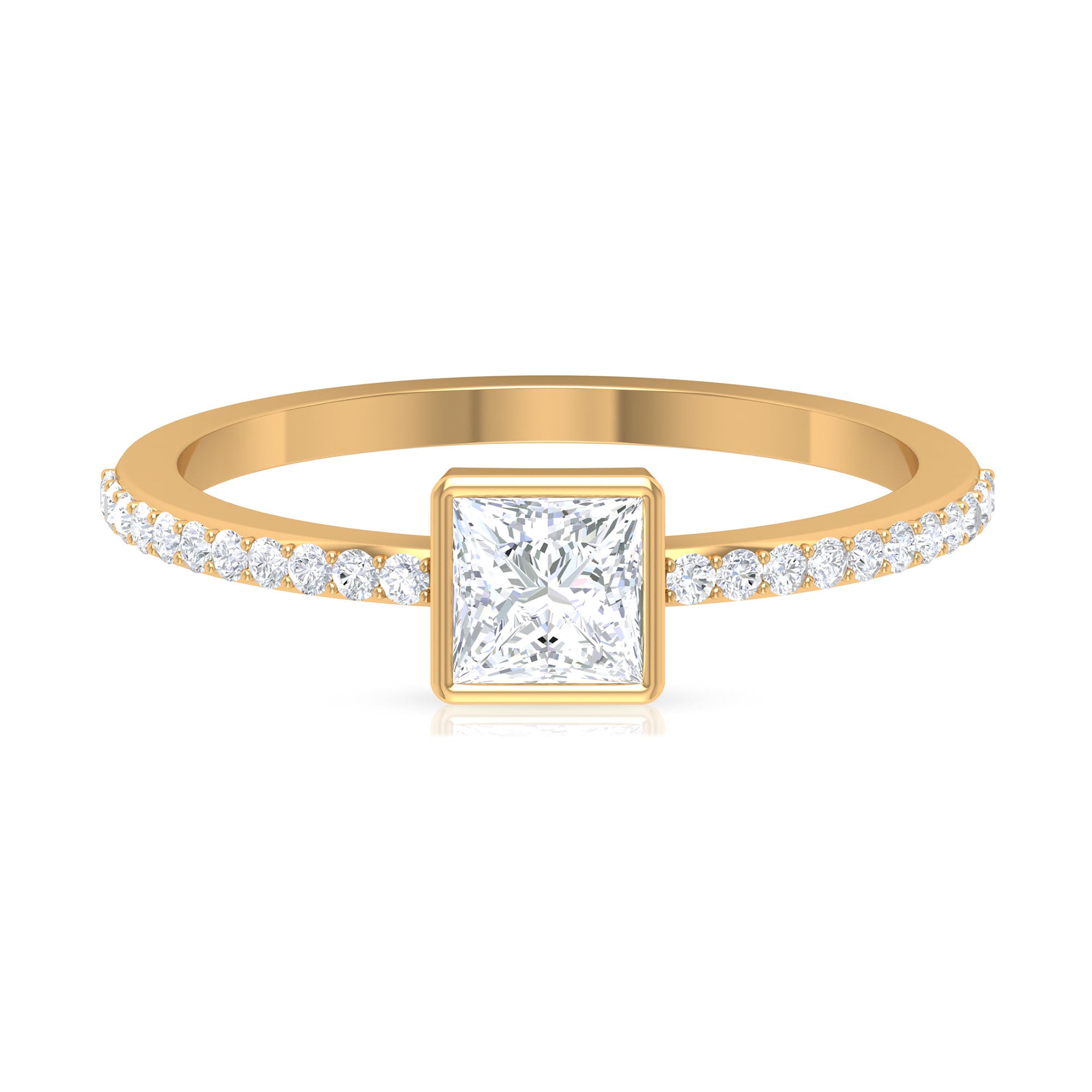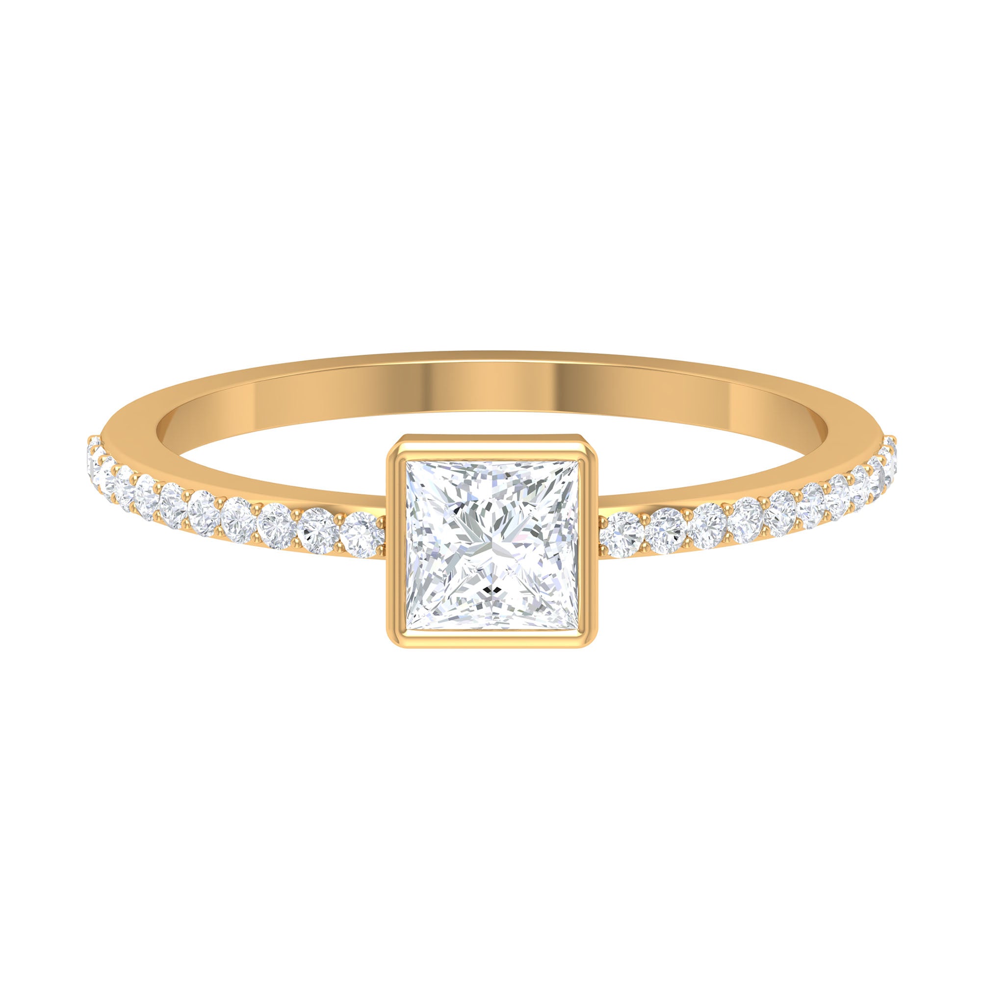 Flaunt in the parties with this Bezel Set Zircon Solitaire Ring. This Solitaire Ring is embellished with Princess Cut zircon set in Bezel Setting with CZ Side Stones, crafted in Gold Metal.