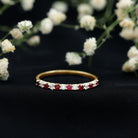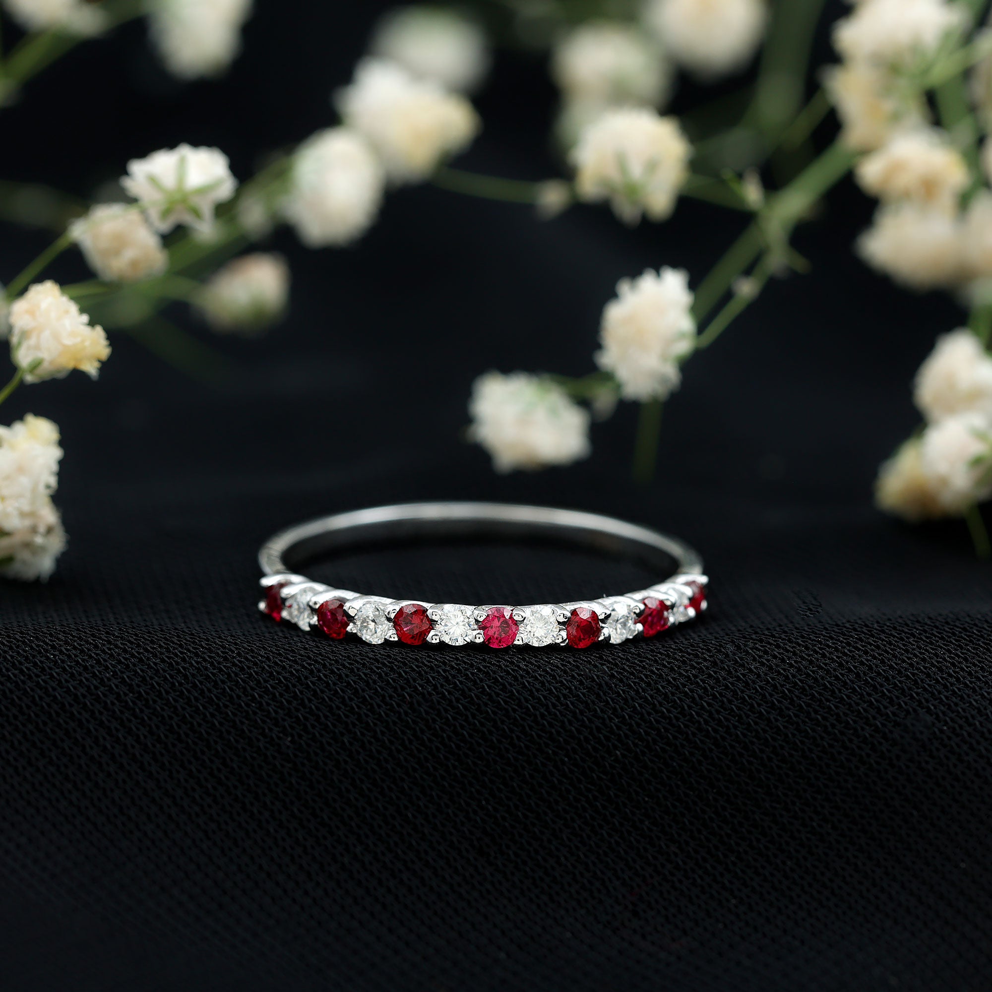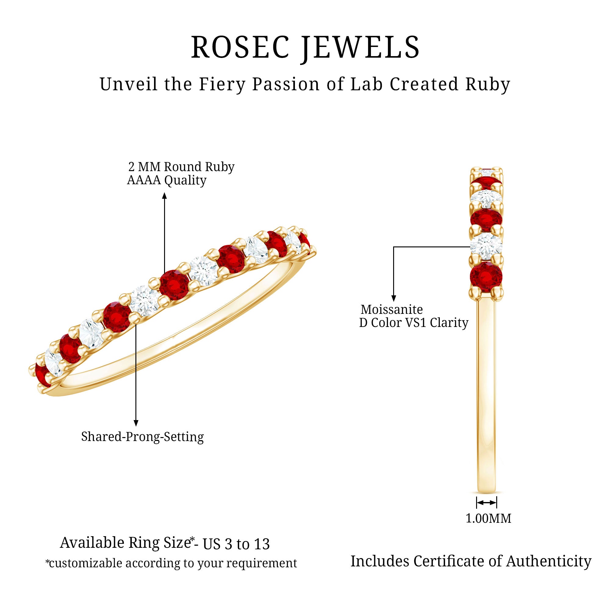 The delicate, elegant Lab Ruby Ring adds a minimalist touch when worn alone, but also pairs beautifully with other bands or serves as an engagement ring. This band ring exudes brilliance and shine, making it a perfect way to enhance your look. Featuring a vibrant hue and a mesmerizing combination of Lab Ruby and Moissanite, this Lab Ruby Stackable Ring is embellished with Round Shape Lab Created Ruby and Moissanite in a Shared Prong Setting. This unique Lab Ruby Half Eternity Ring offers a special way to express your individual style. The versatility of this Ruby Stackable Ring is designed to add a touch of sophistication to any ensemble.