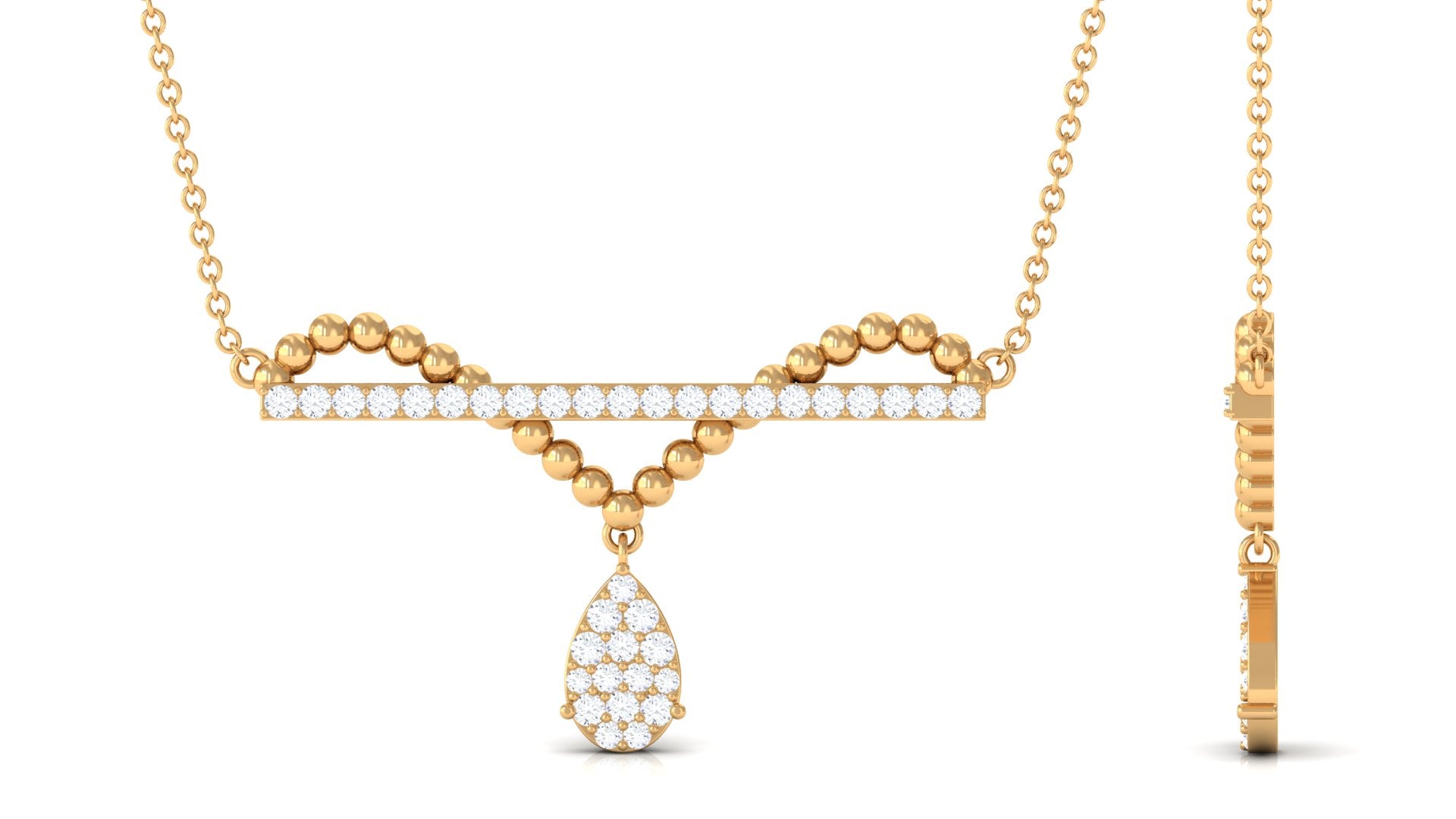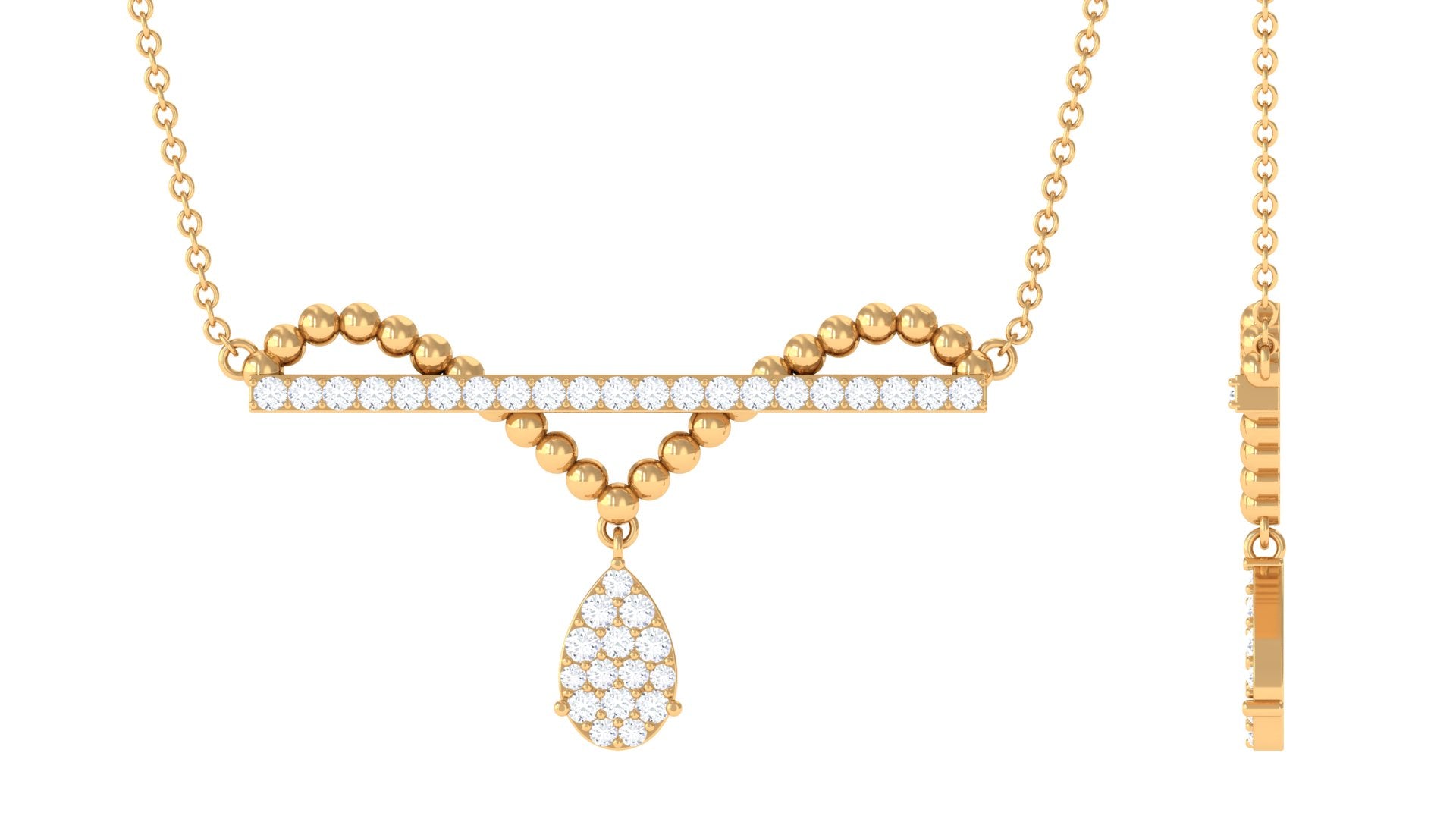 Transform a simple moment into a romantic one by presenting her with this exquisite Moissanite Bar Necklace. This drop necklace, designed by a certified expert, features a row of sparkling round-cut Moissanite gems arranged in a dazzling pave setting. Crafted from high-quality solid gold, this Moissanite Drop Pendant Necklace is sure to elevate her style and leave her feeling glamorous.