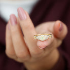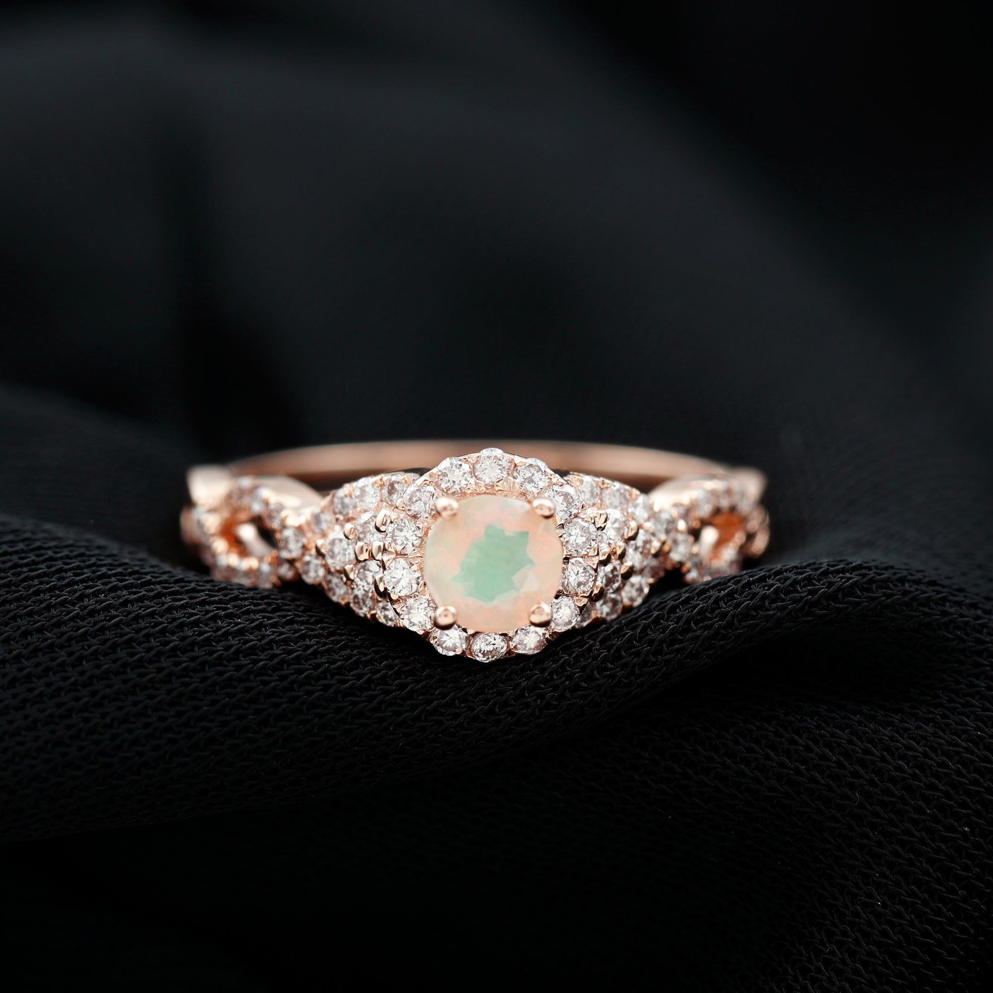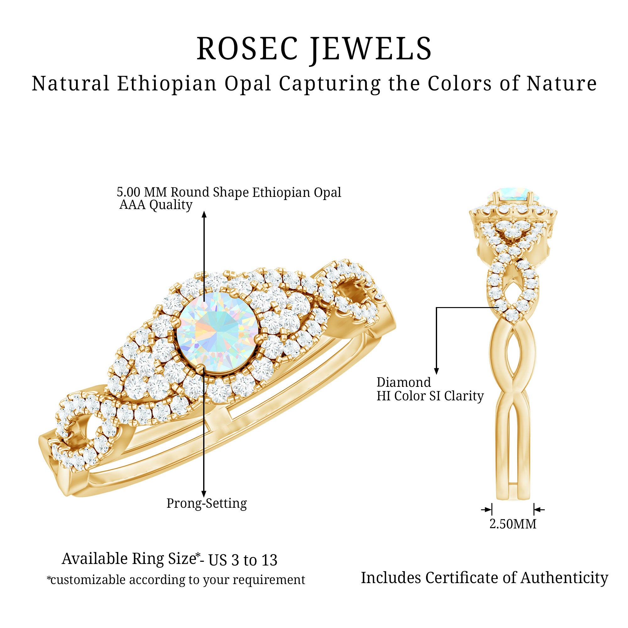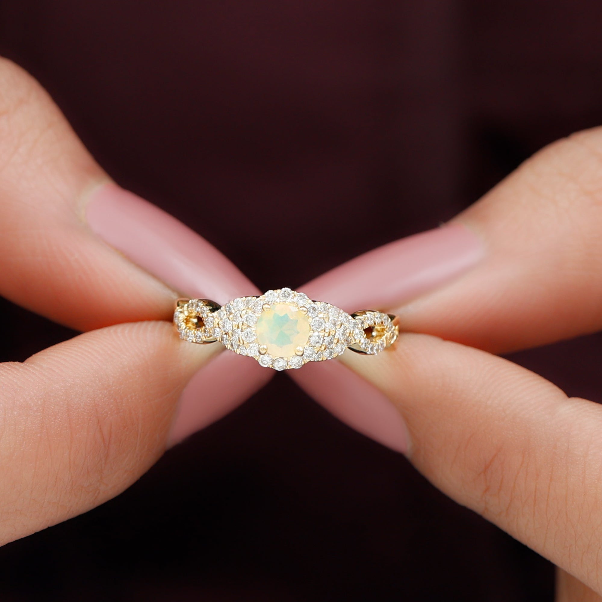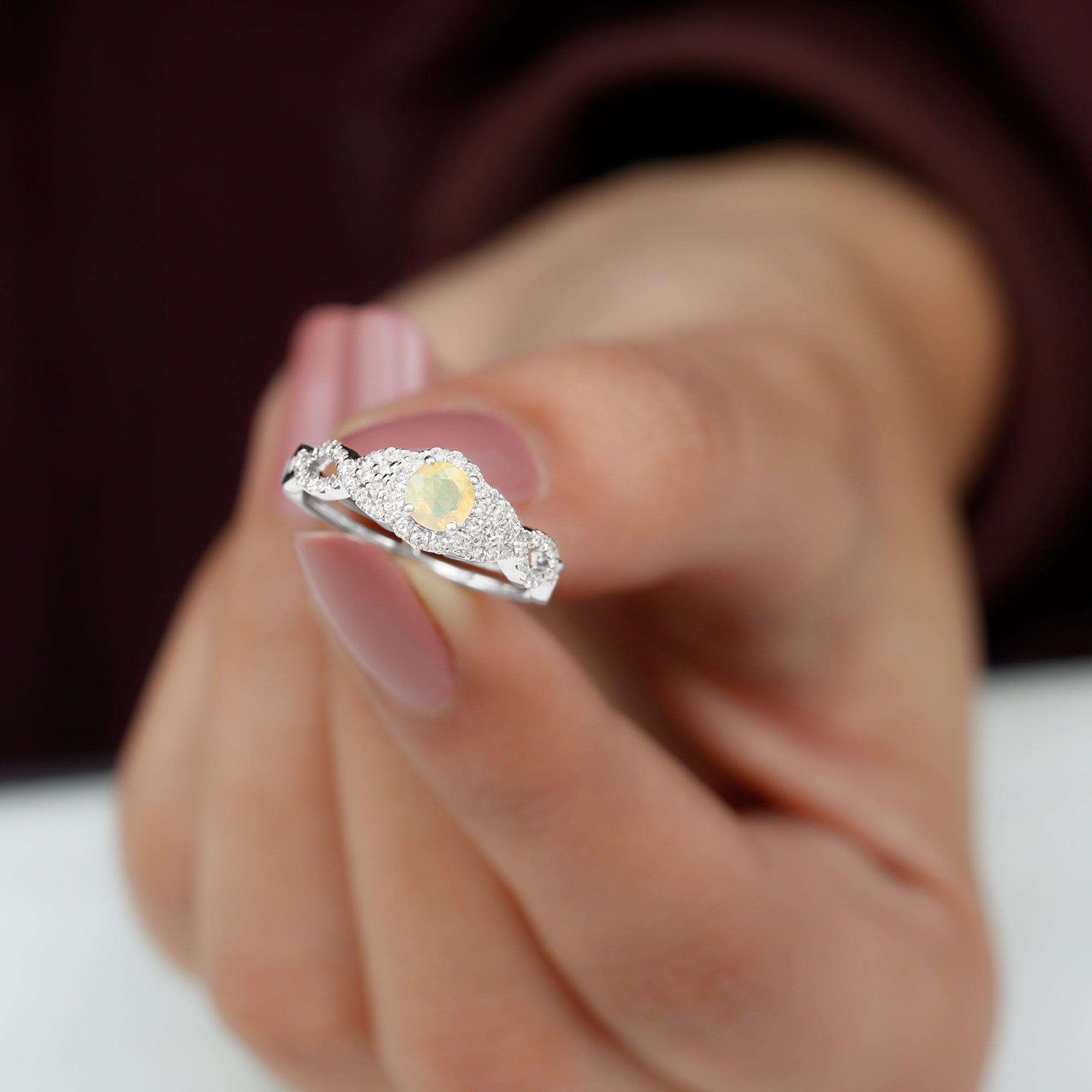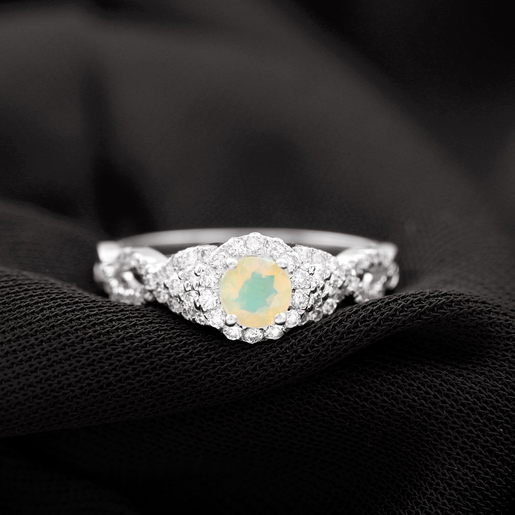 This Vintage Looking Engagement Ring represents timeless romance with a twist. At the center of this Fine Ring glows a mesmerizing 5 mm Round Shape Ethiopian Opal, full of mystery and color that dances in the light like a love that never fades. Framed by a sparkling Diamond Halo and set atop a uniquely Criss Cross Band adorned with Diamond stones, this Opal Engagement Ring blends vintage elegance with modern flair. The intricate criss cross band symbolizes two lives weaving together, creating one unforgettable path, perfect for expressing eternal love in the most meaningful way. The shifting hues of opal make it a one-of-a-kind gem, just like the person wearing it. Whether you are planning a romantic proposal or gifting a lasting promise, this Opal and Diamond Engagement Ring offers sparkle and soul. Arriving in a signature jewelry box and available in various ring sizes, this Criss Cross Ring is ready to make a statement that is both classic and uniquely yours. Elegant, enchanting and endlessly symbolic, this is the kind of piece that turns a promise into forever.