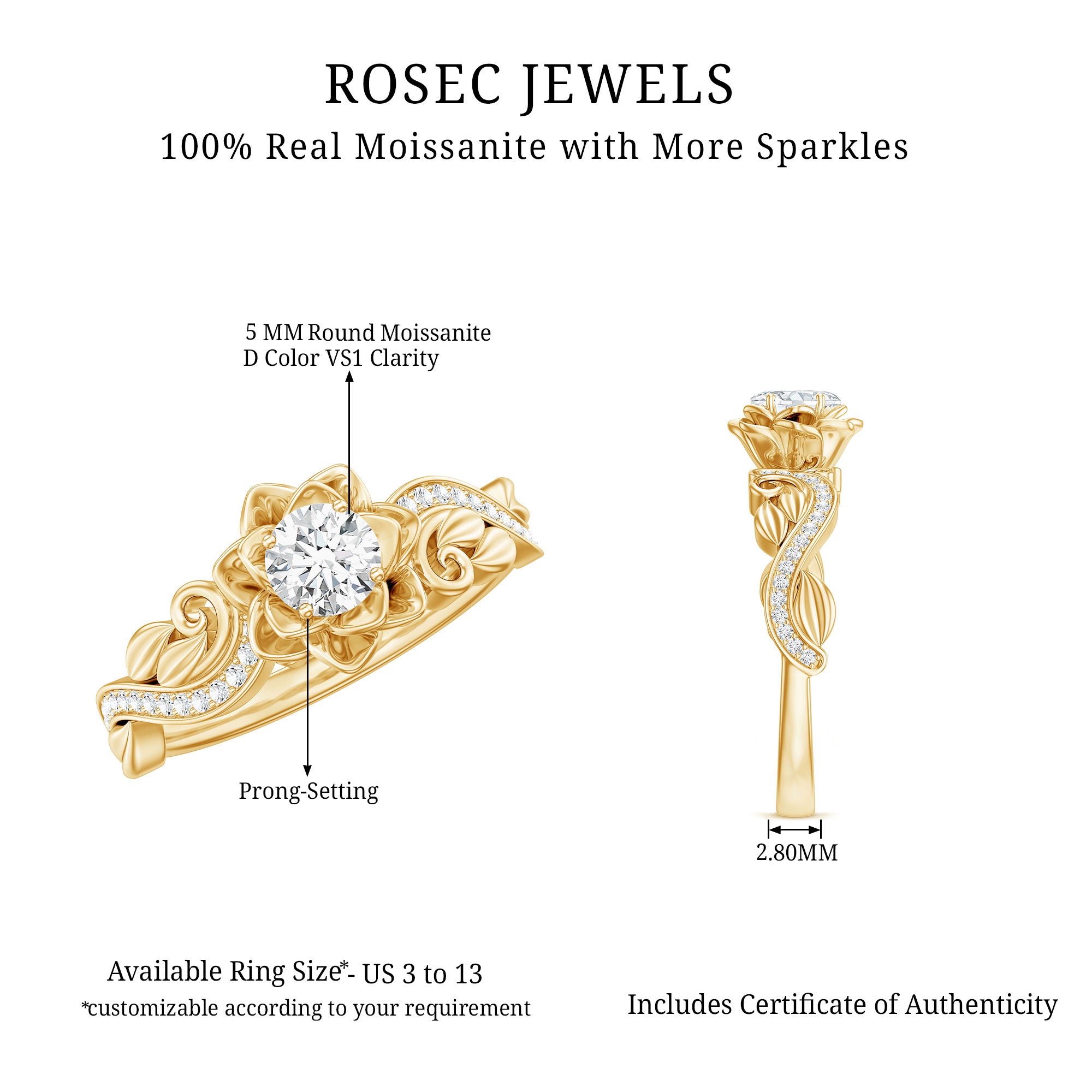 For the person who loves nature-inspired jewelry, this Moissanite Flower Engagement Ring brings that vision to life. Inspired by the gentle curves of blooming petals, the design brings a graceful, garden-like feel to your special moment. At the heart of the ring sits a radiant 5 MM round moissanite, sparkling with brilliant D-VS1 quality. The center stone is framed by a lovely rose shaped flower, giving the Moissanite Engagement Ring a charming look. Along the band, more round moissanites brighten the design, adding a glow that catches attention from every angle. The shank features detailed leaf patterns that enhance the floral theme, giving the Floral Ring a nature-inspired elegance. This Half Carat Moissanite Ring is a wonderful choice for an engagement, a promise moment, or simply marking a memory that deserves something beautiful. It is designed to feel comfortable for everyday wear while still looking special enough for life’s most treasured days. Packaged in a charming jewelry box and available in many sizes, it is easy to give as a meaningful gift or to wear as a symbol of your own story.