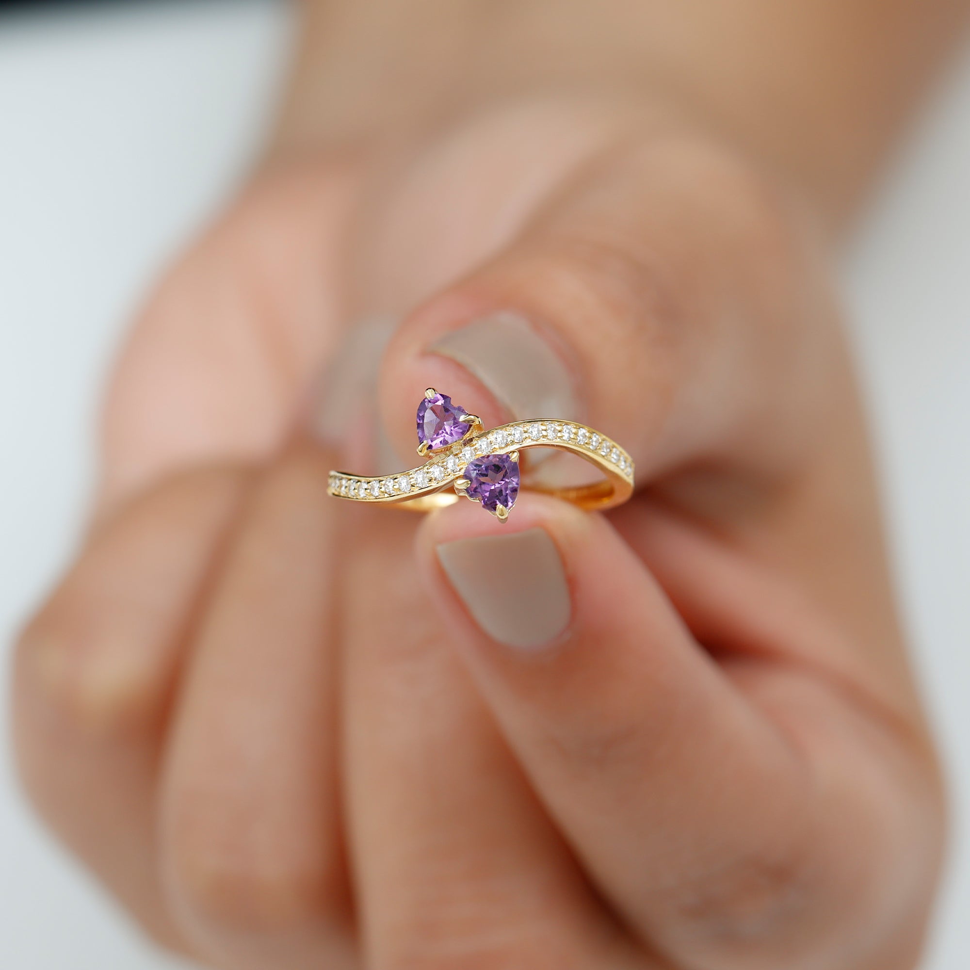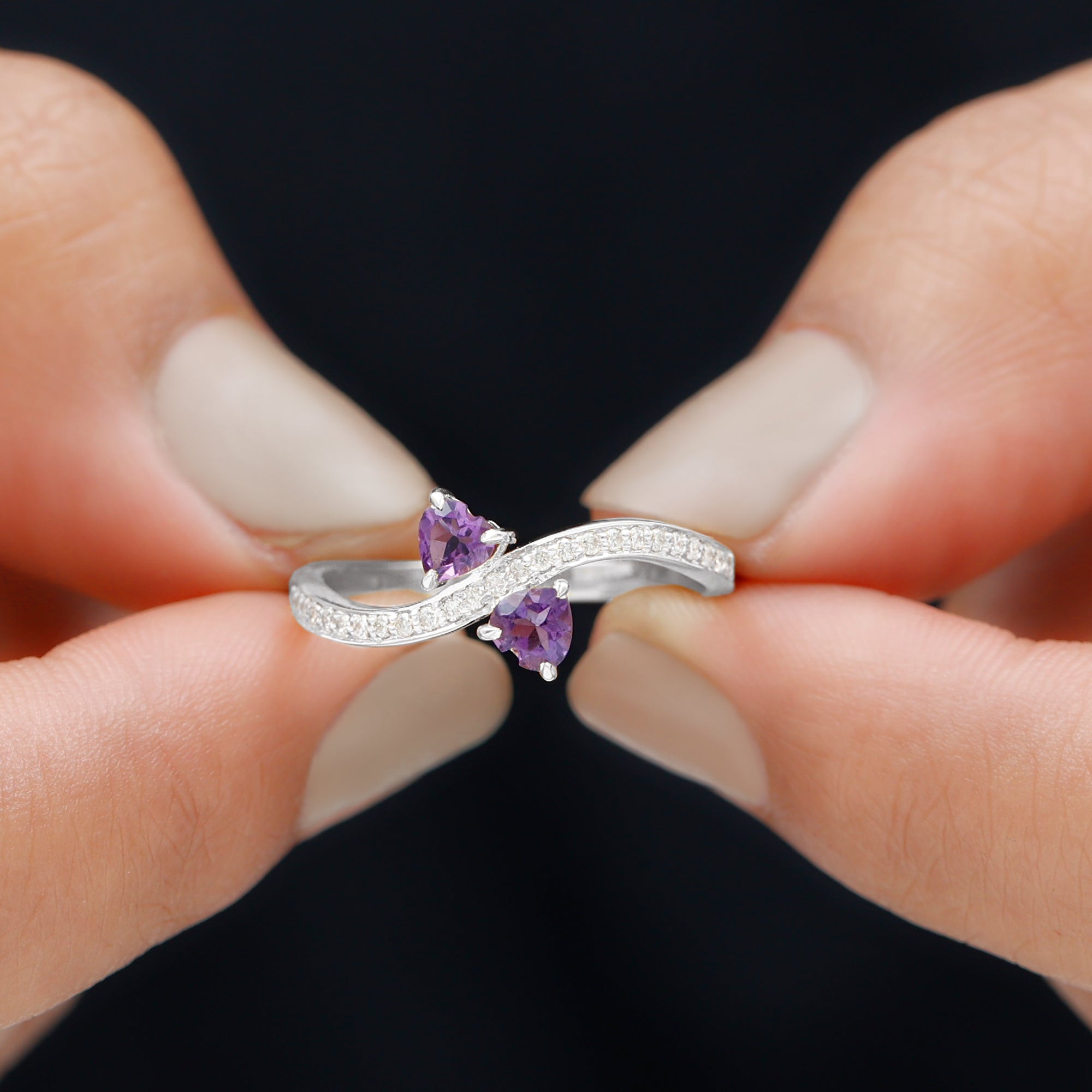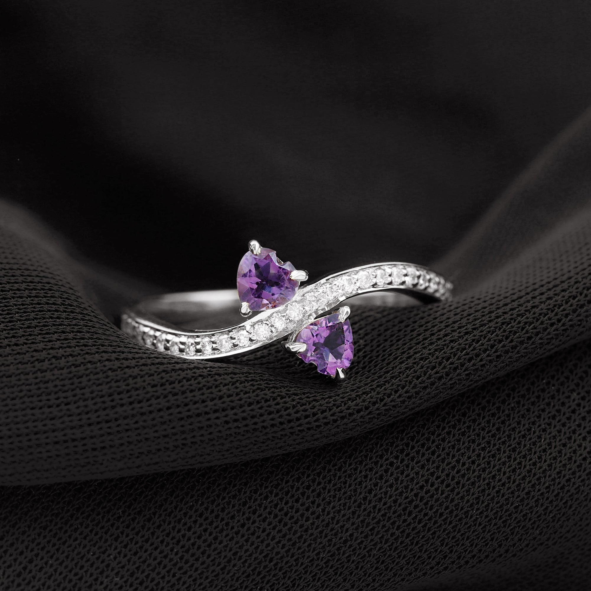 This Heart Shape Amethyst Two Stone Engagement Ring will keep your style apart from others. Simple twisted band is embellished with Diamond to give this ring a minimal and unique look. This Amethyst Engagement Ring will absolutely be an enchanting ring for your partner.