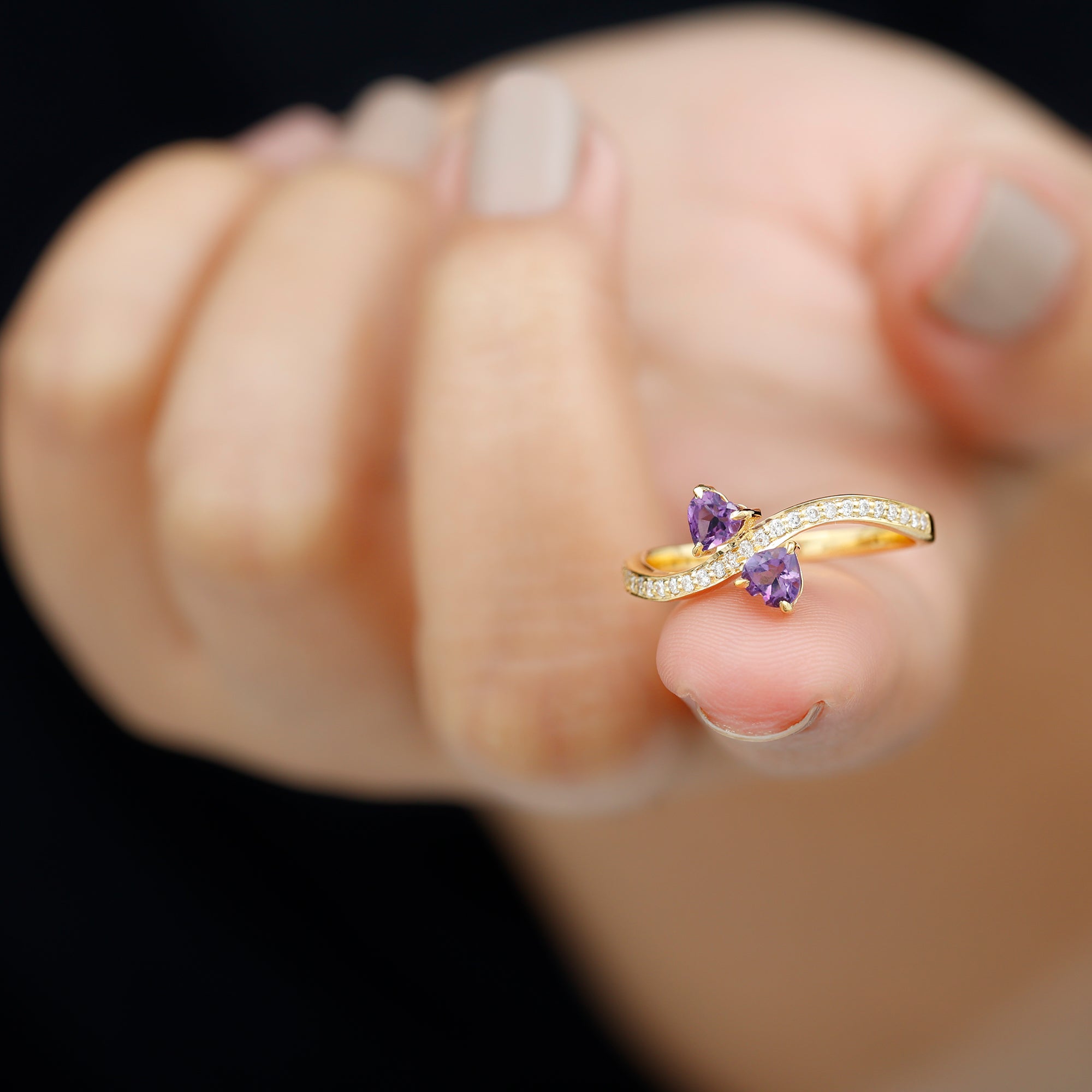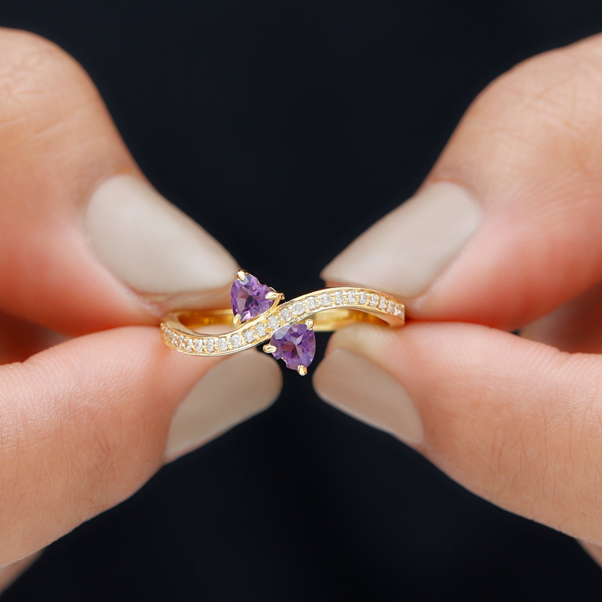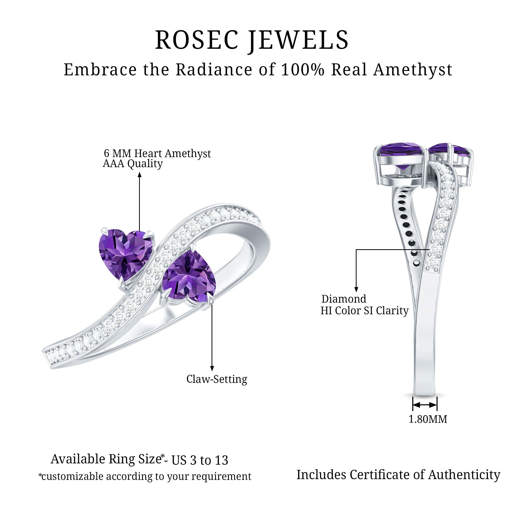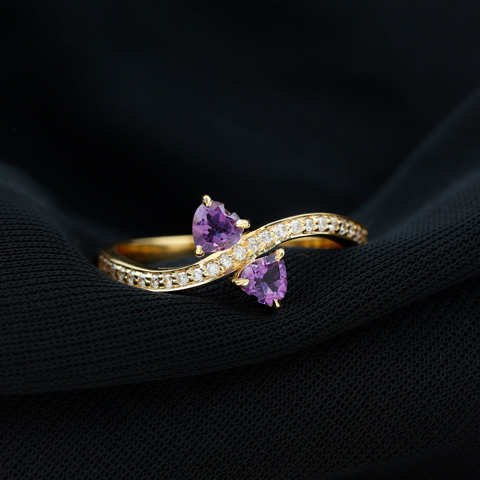 This Heart Shape Amethyst Two Stone Engagement Ring will keep your style apart from others. Simple twisted band is embellished with Diamond to give this ring a minimal and unique look. This Amethyst Engagement Ring will absolutely be an enchanting ring for your partner.