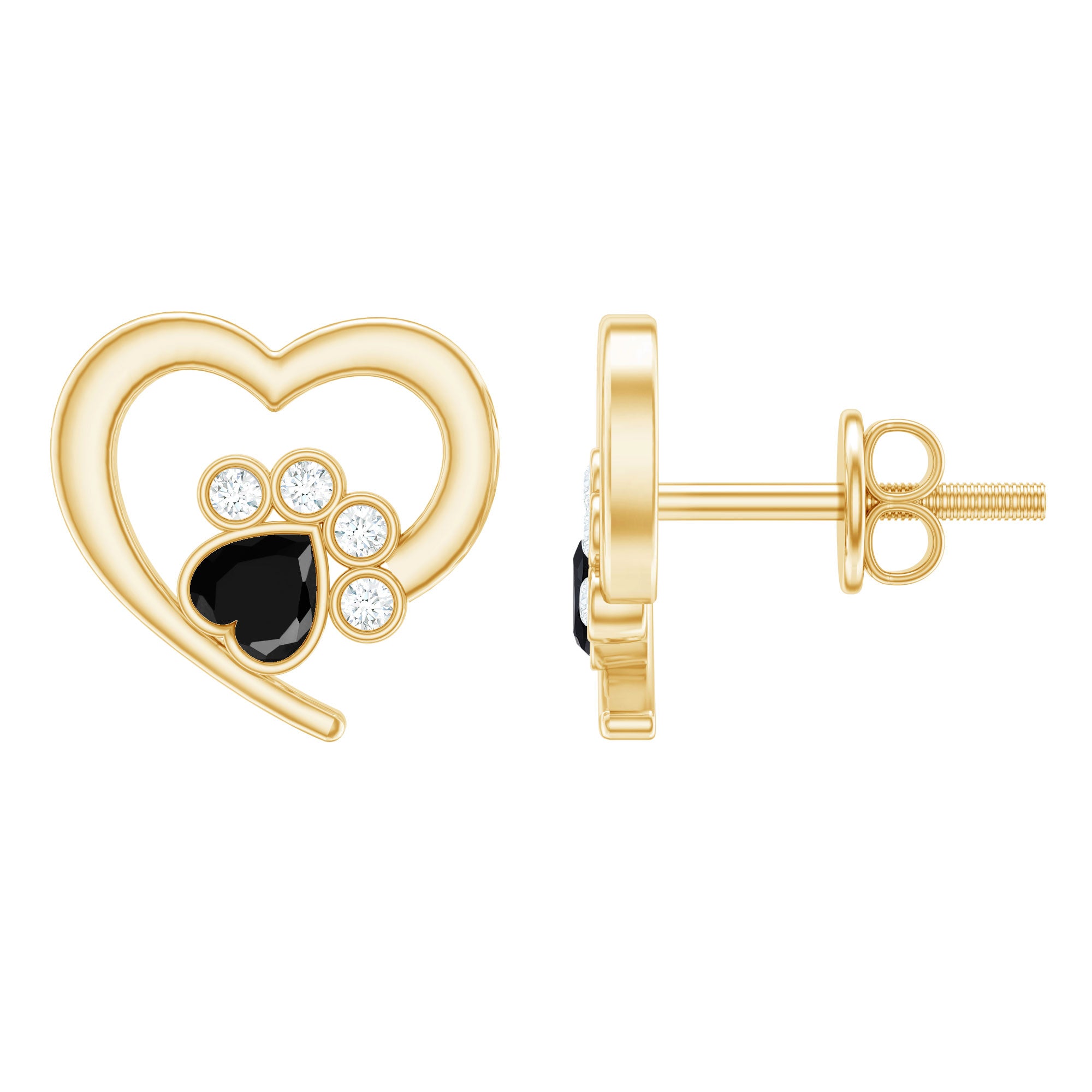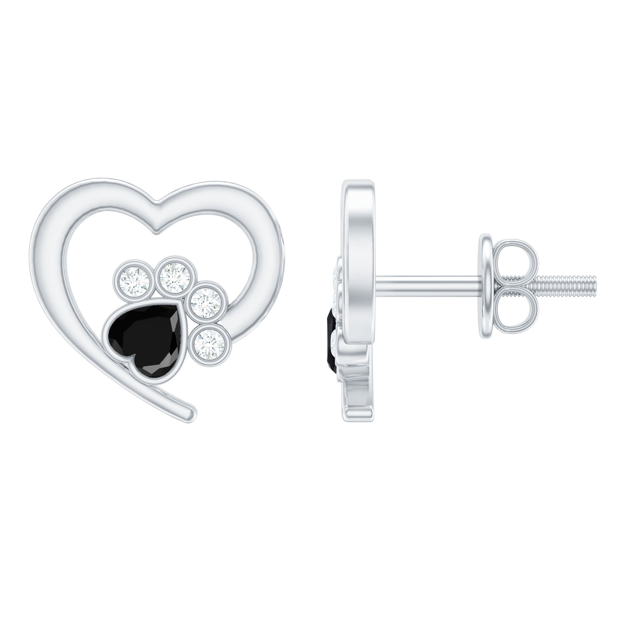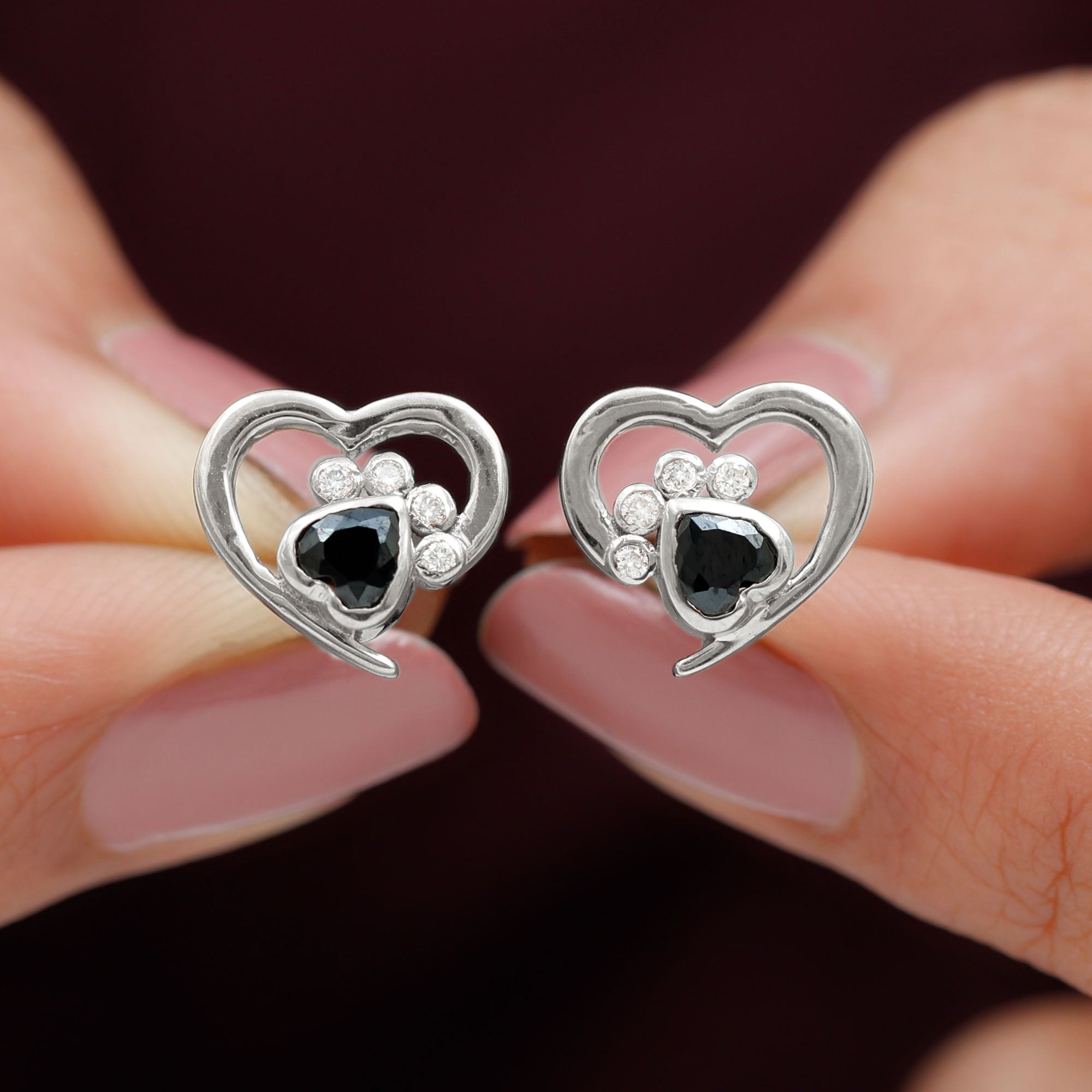 3/4 CT Heart Shape Black Onyx and Diamond Paw Stud Earrings