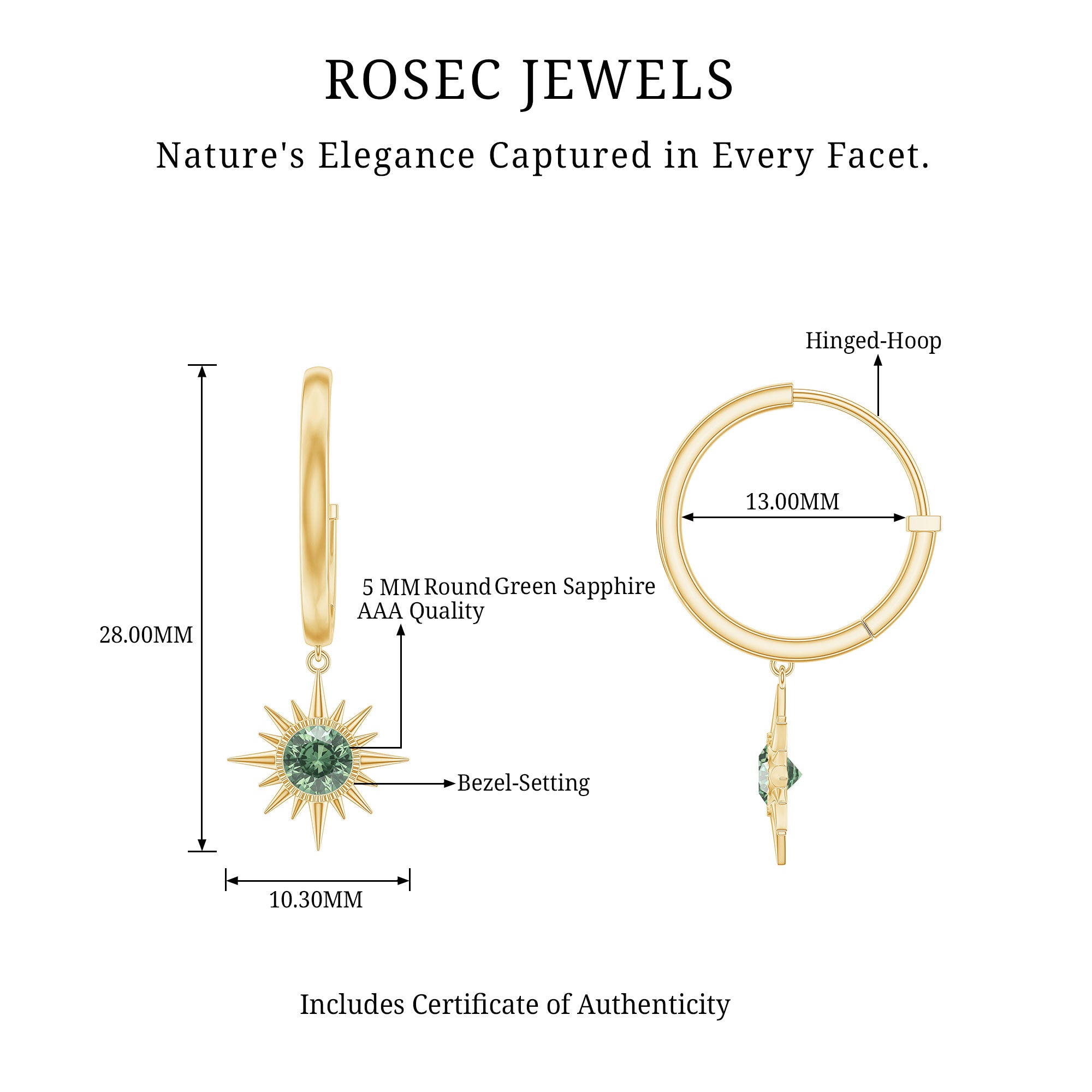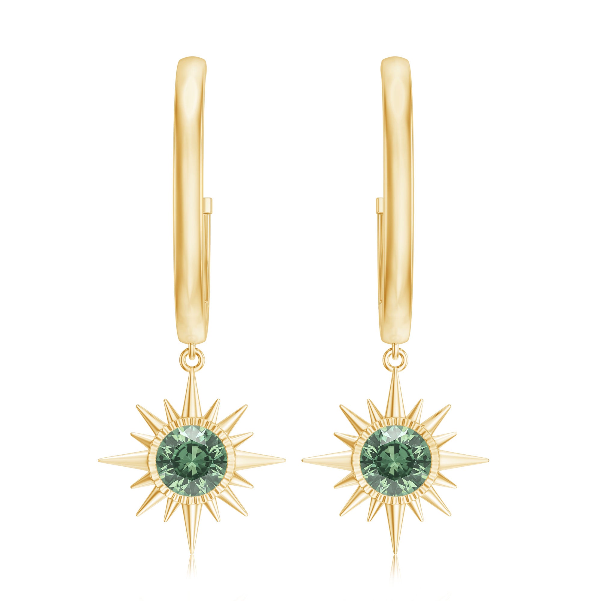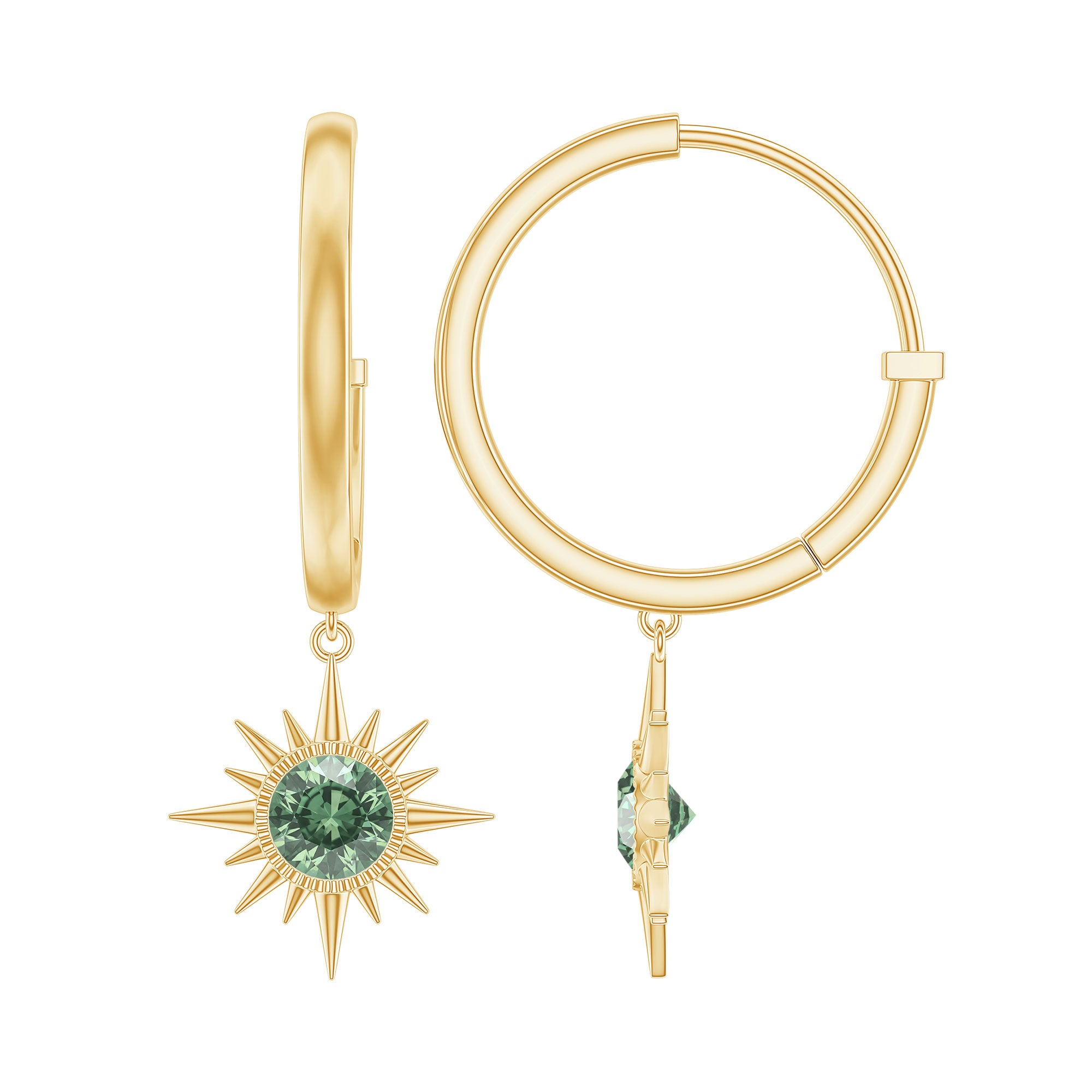 Flaunt with these beautiful Sunburst Drop Hoop Earrings adorned with Round Cut Green Sapphire set in Milgrain Bezel Setting. These Stud Earrings are Composed of Solid Gold.